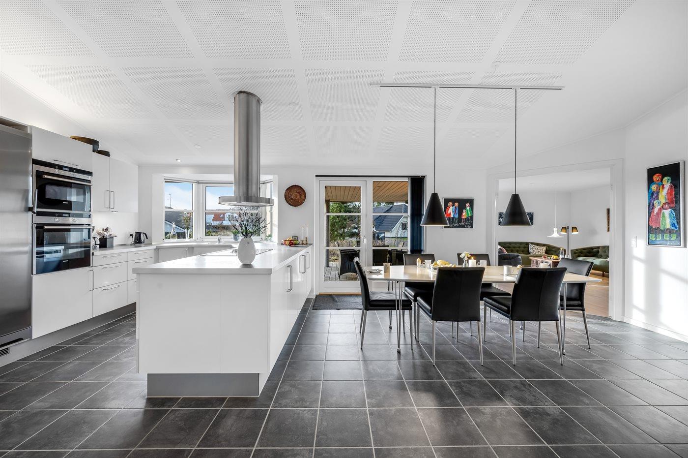 Huset er meget rummeligt og indrettet med 4 soverum, 2 badeværelser samt et skønt køkkenalrum, som ligger i forbindelse med opholdsstuen, hvorfra der er adgang til den overdækkede terrasse.