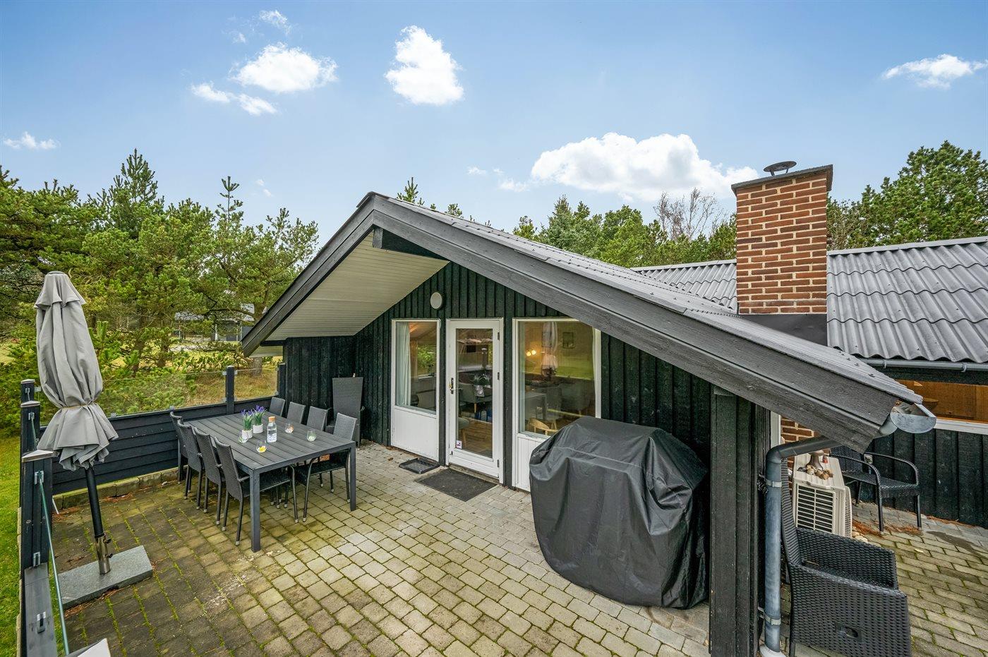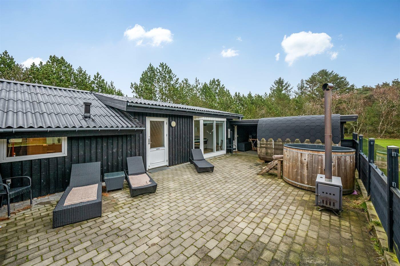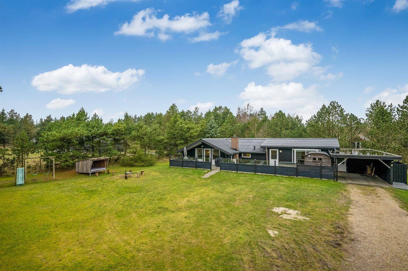 Skønt wellness-sommerhus i Blåvand med udendørs sauna, aktivitetsrum og shelter.
