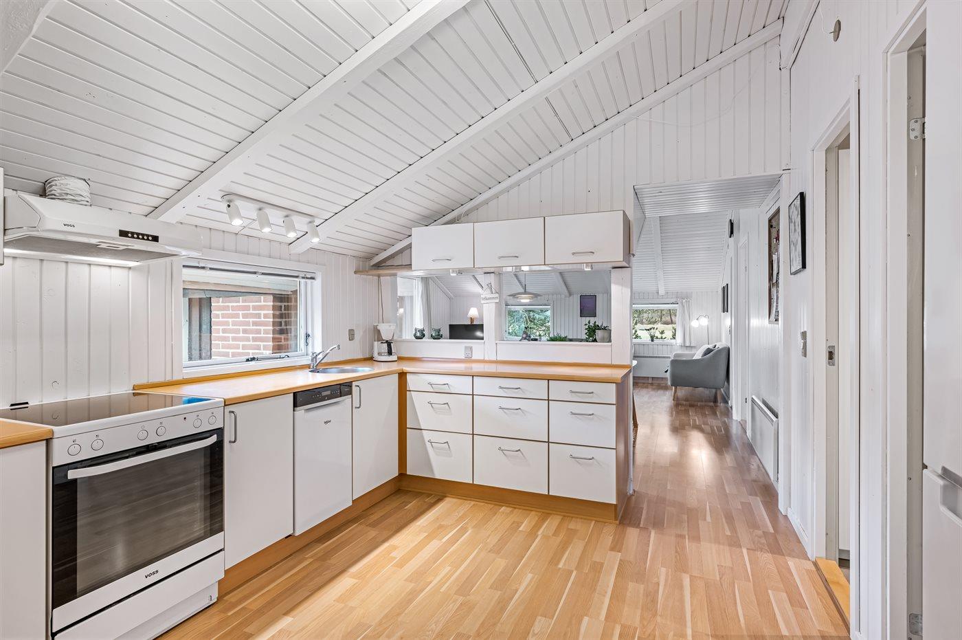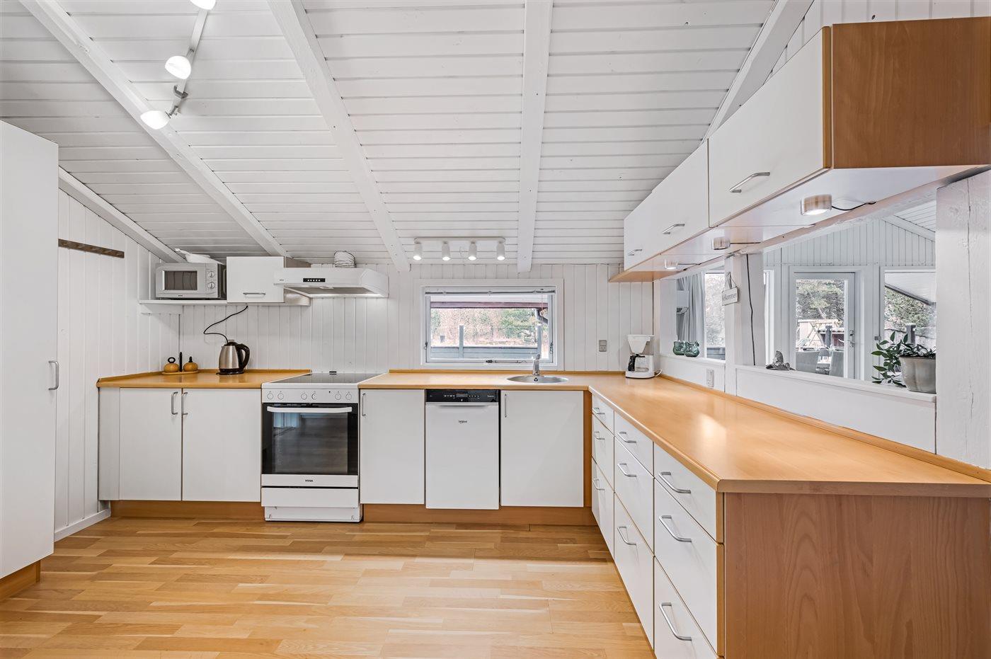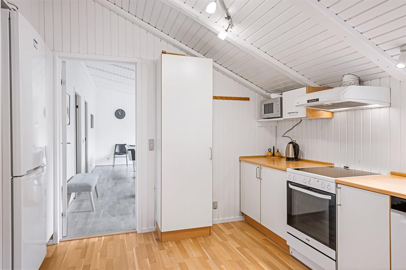 Køkkenet er udstyret med 1 køleskab. Der er 4 keramiske kogeplader, varmluftovn, mikrobølgeovn samt opvaskemaskine.