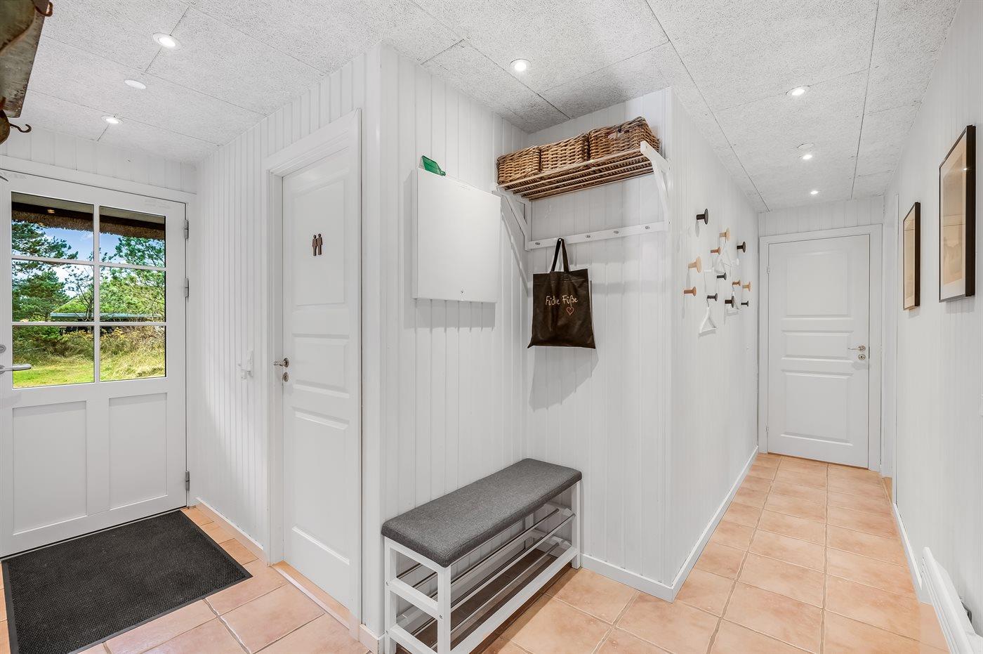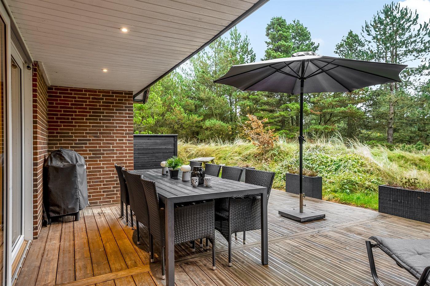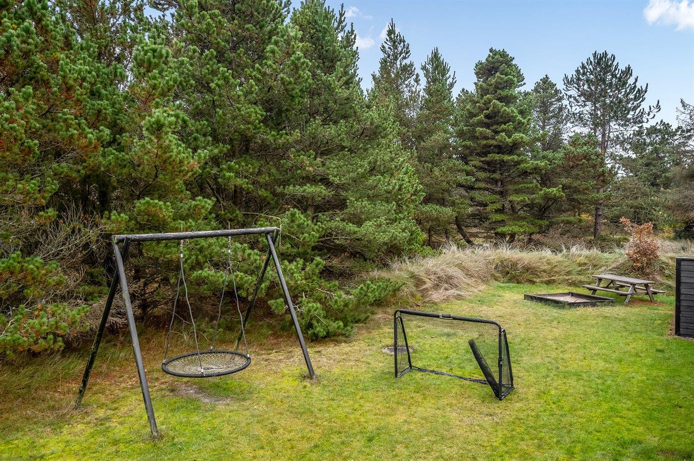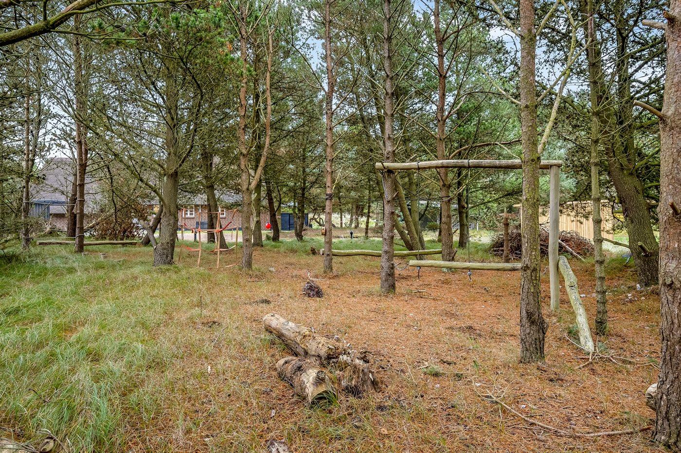 Ved dette skønne sommerhus i Blåvand er det en fordel at man påskønner aktive timer i det fri. I den lille skov ved siden af huset er der bygget en spændende og let udfordrende forhindringsbane, som gæster i alle aldre kan få fornøjelse af. En super skovlegeplads, der udfordrer alle aldre – al færden er på eget ansvar. Er der brug for et hvil efter forhindringsbanen er gennemført, fines der en farverig hængekøje - klar til at hoppe direkte op i. Alt imens forhindringsbanen udforskes, er husets sydvendte terrasse klar til masser af solskinstimer. Havemøblerne og liggestolene står klar til afslappende stunder med solbadning og måske et køligt glas rosévin.