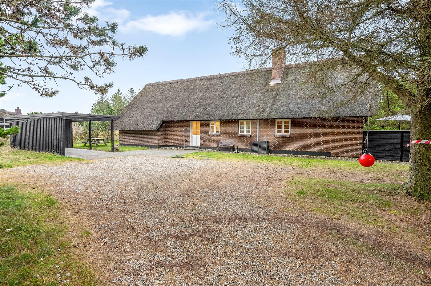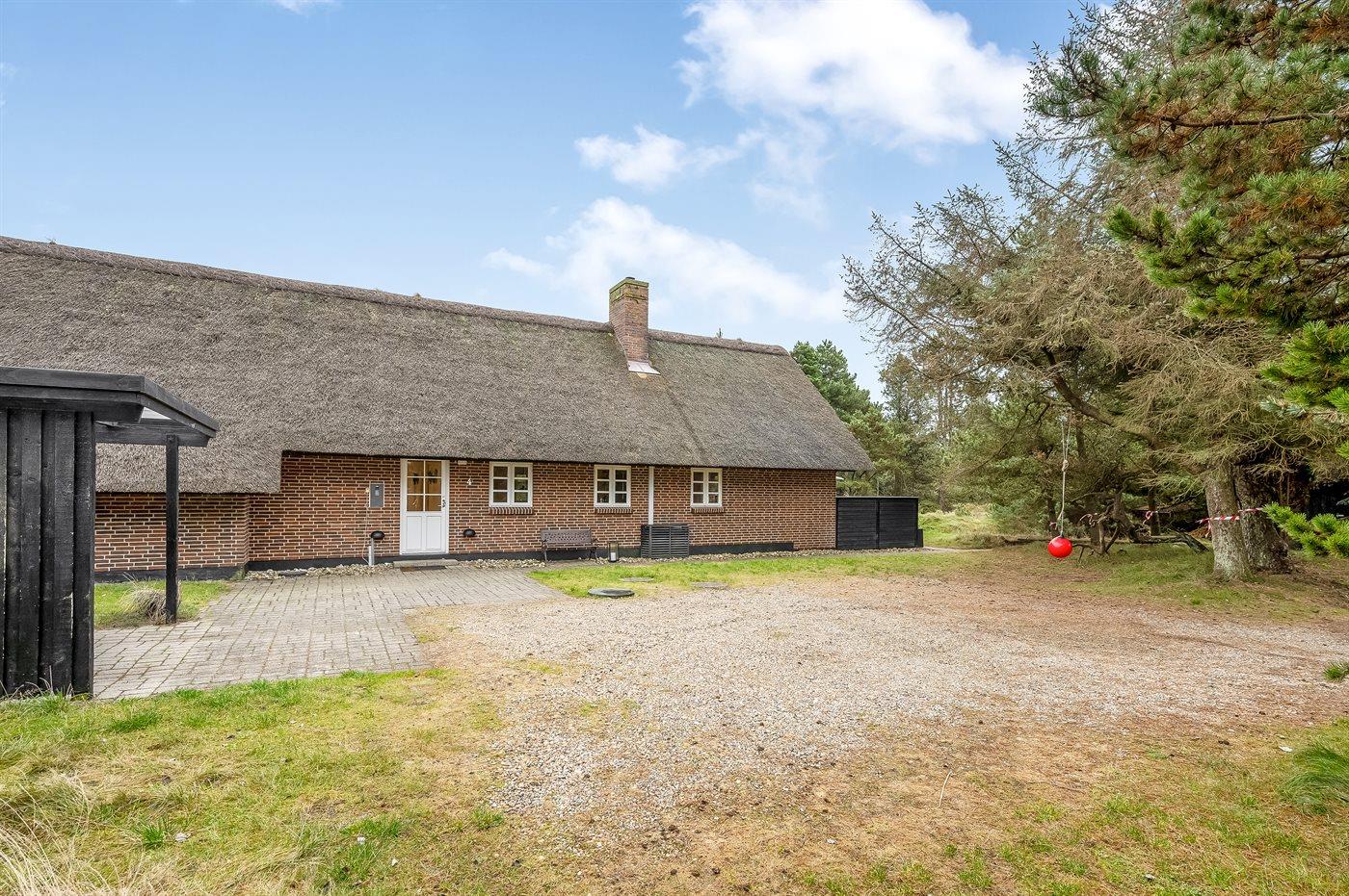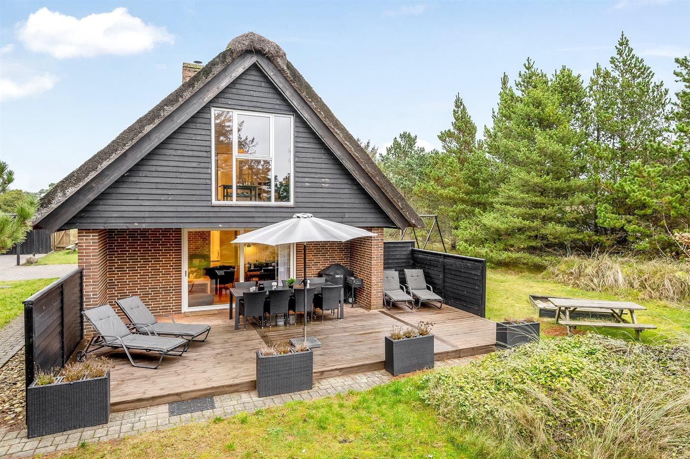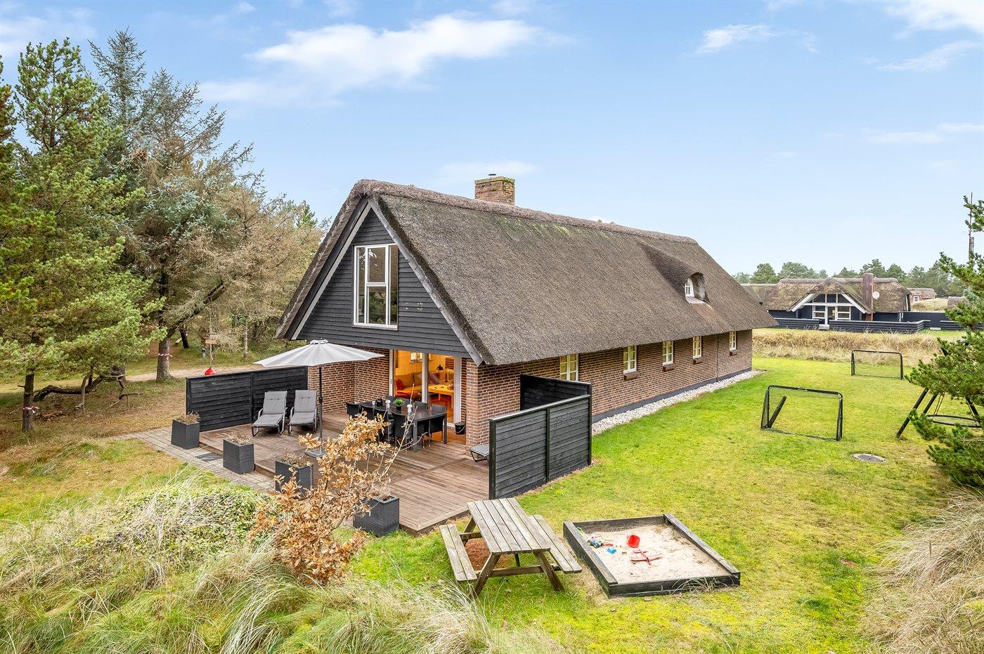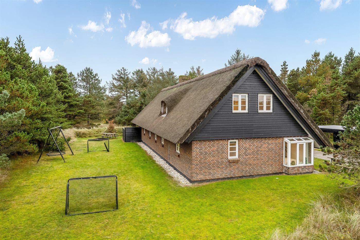 Stråtækt sommerhus i Blåvand med privat skovlegeplads, spa og moderne faciliteter for hele familien.
