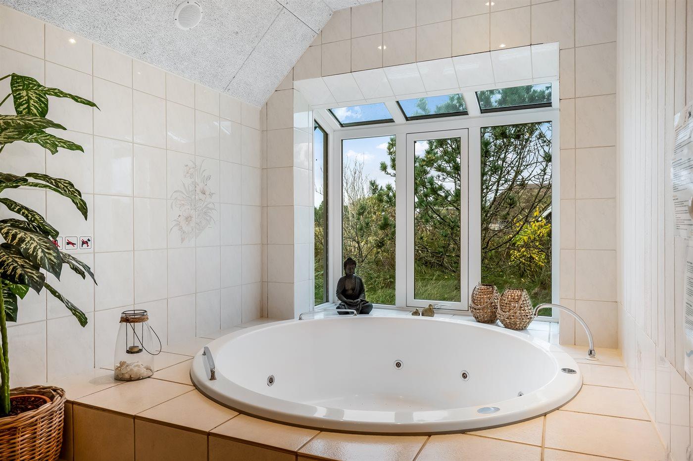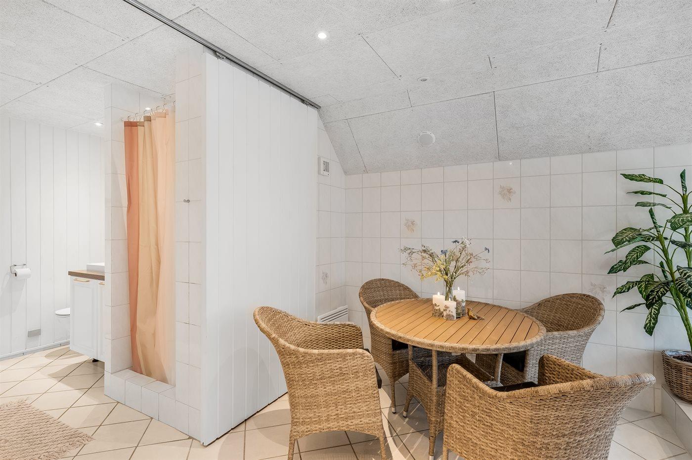 Der er 2 badeværelser med bruseniche og 2 toiletter. Der er gulvvarme på 1 badeværelse. I saunaen er der mulighed for afslapning.