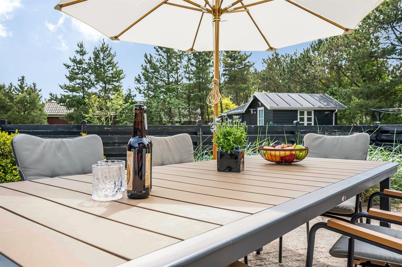 I gårdhaven, på husets syd-vestvendte side, er der fred og ro og plads til ude- og privatliv. Og det er også gårdhaven og den afskærmede udebruser, der tager imod, når I vender tilbage fra en dejlig dag ved stranden ca. 5 minutters gåtur fra huset.