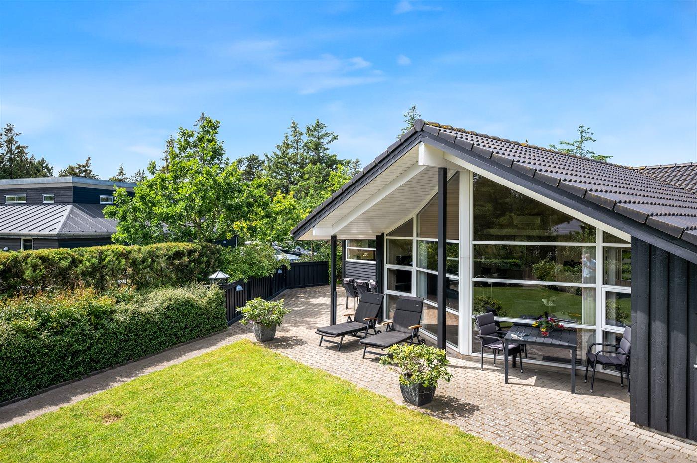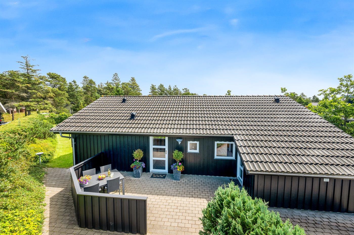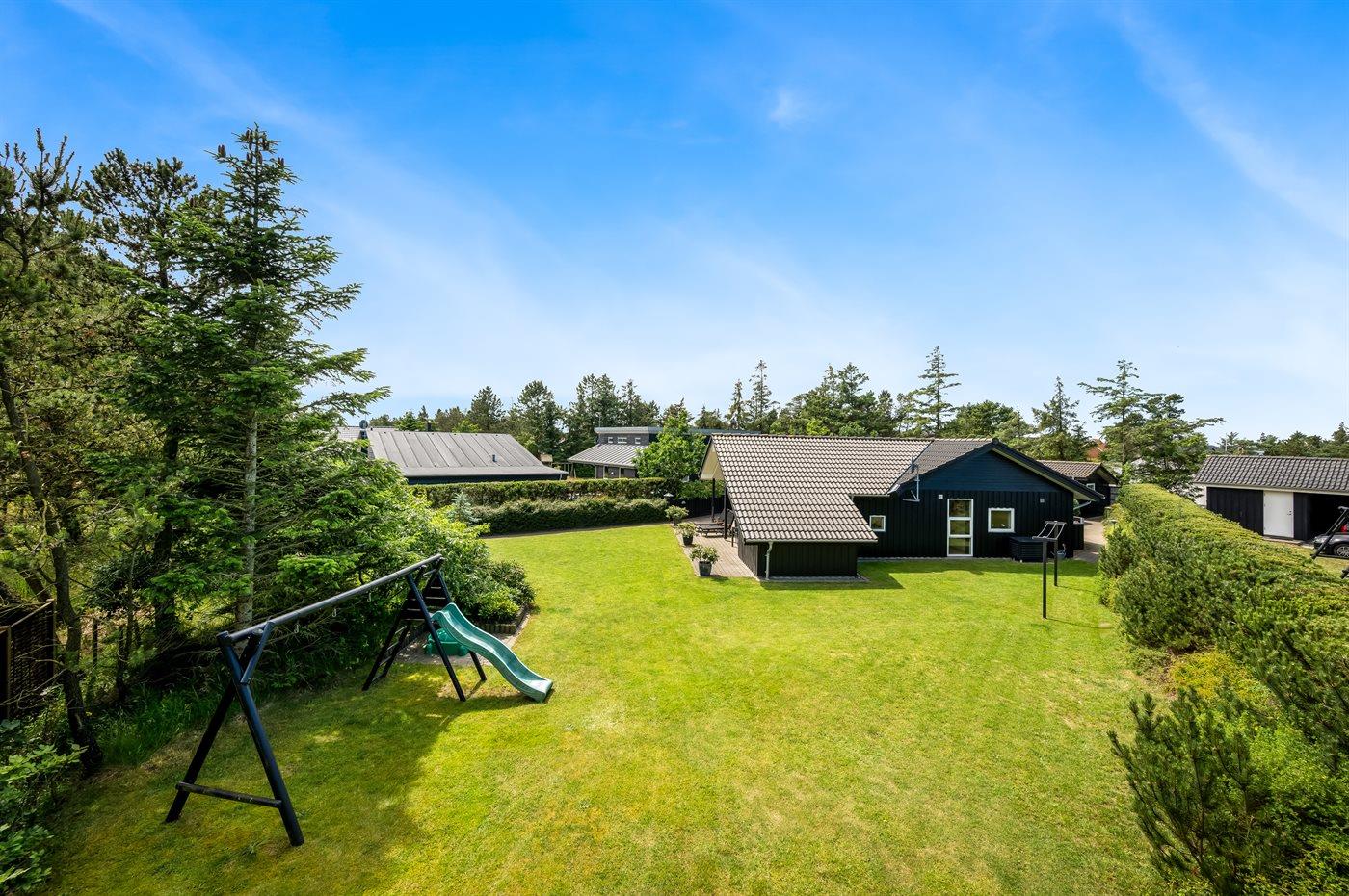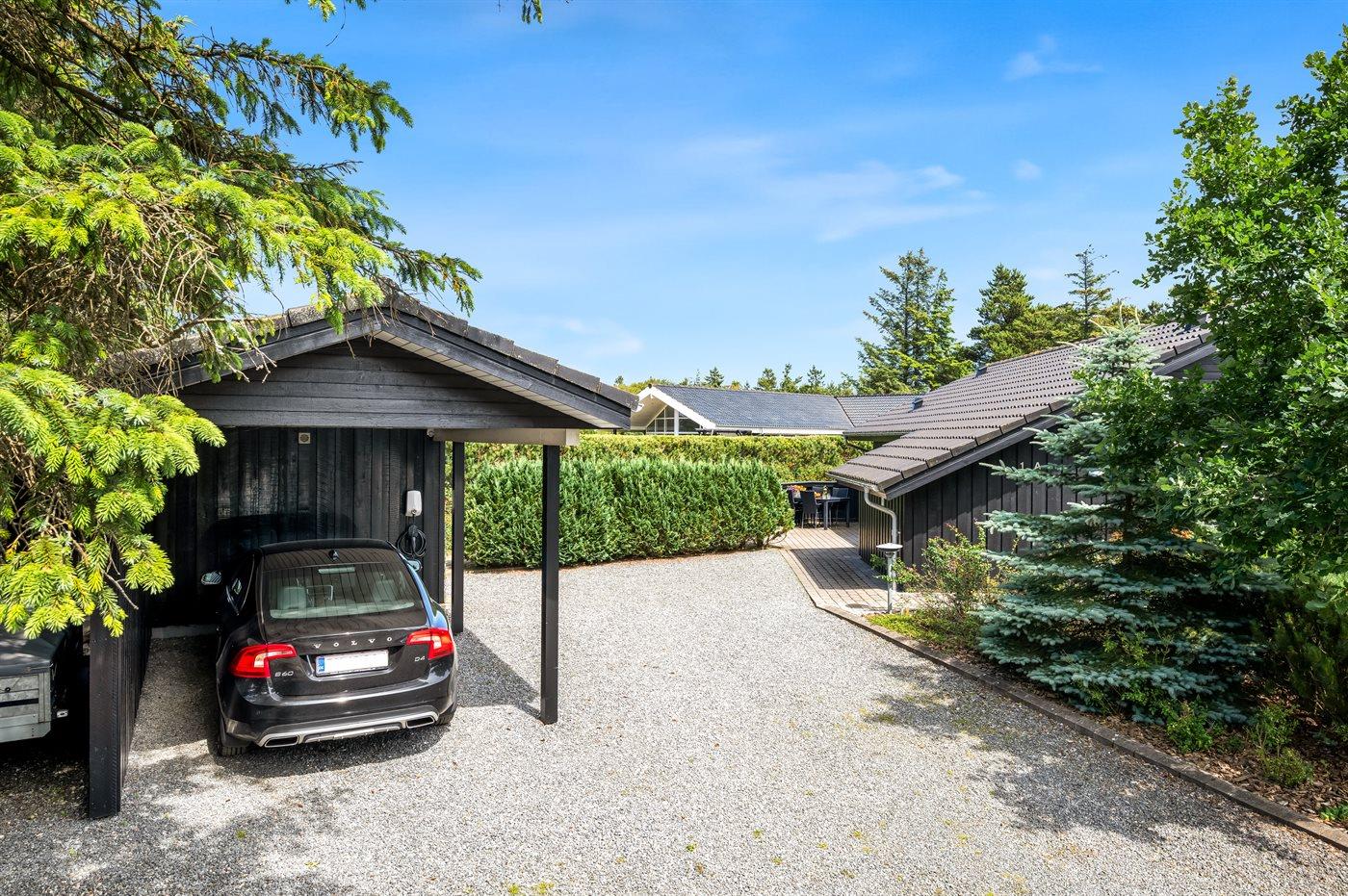 Ferieboligen er beliggende på en 908 m2 stor naturgrund. Der er ca. 1700 meter til havet og 250 meter til nærmeste indkøbsmulighed. Til ferieboligen hører et åbent terrassemiljø. Der er desuden grill, gynge, sandkasse og rutsjebane. Der kan parkeres ved ferieboligen, og der er carport til rådighed og oplader til elbil – type 2 stik med 11 kW lade effekt.