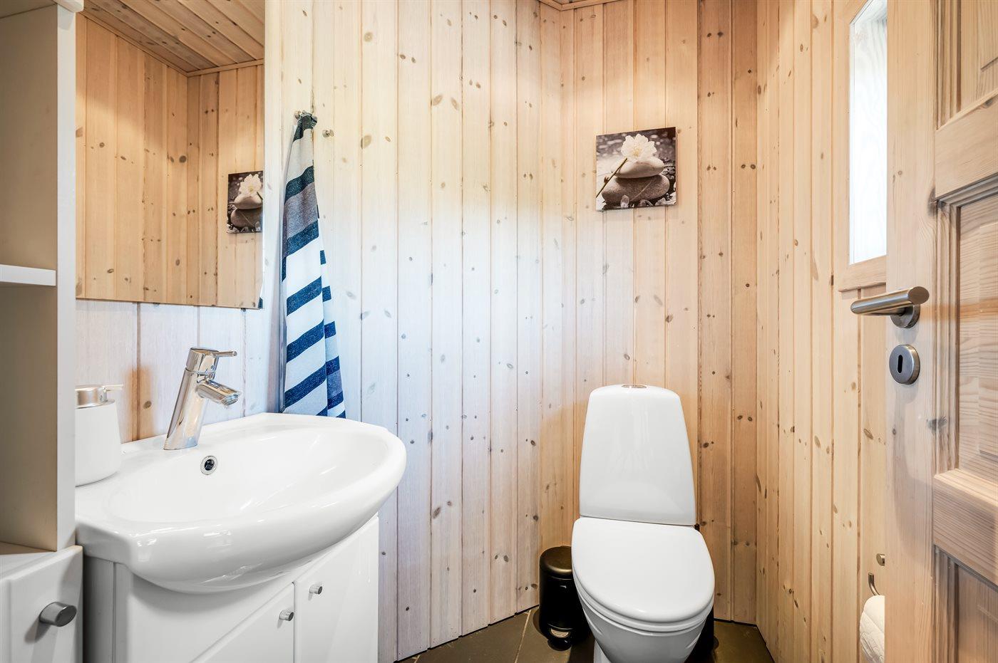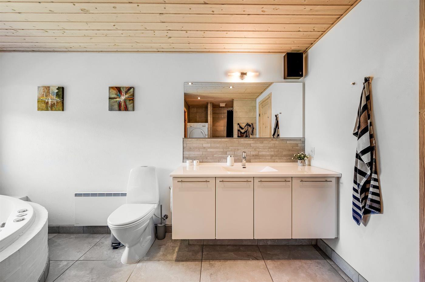 I det store badeværelse er der bruseniche, toilet, spa samt adgang til sauna. Derudover er der et gæstetoilet. Spaen er til 2 personer.