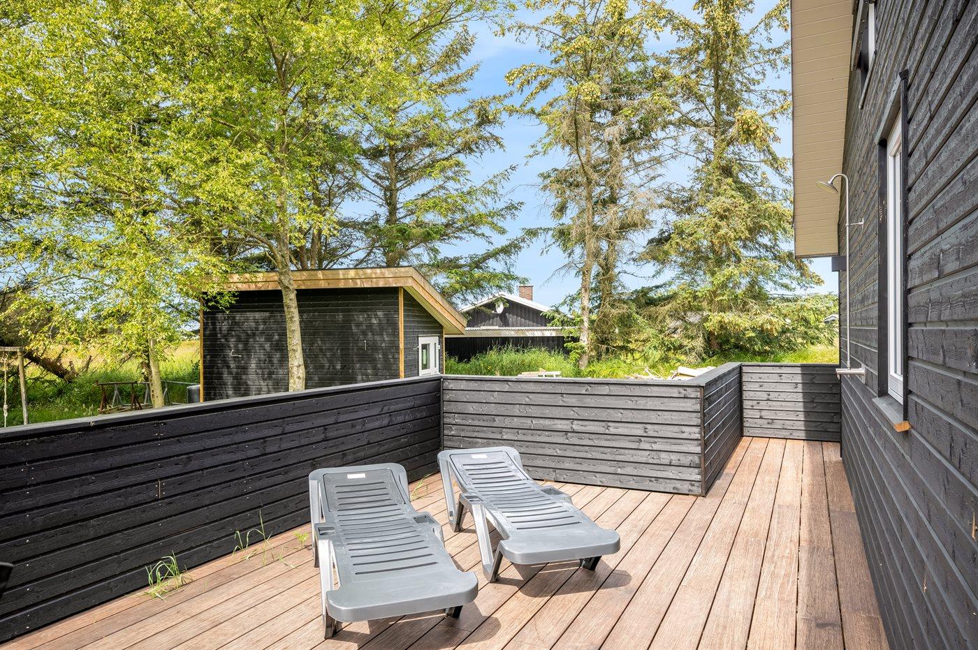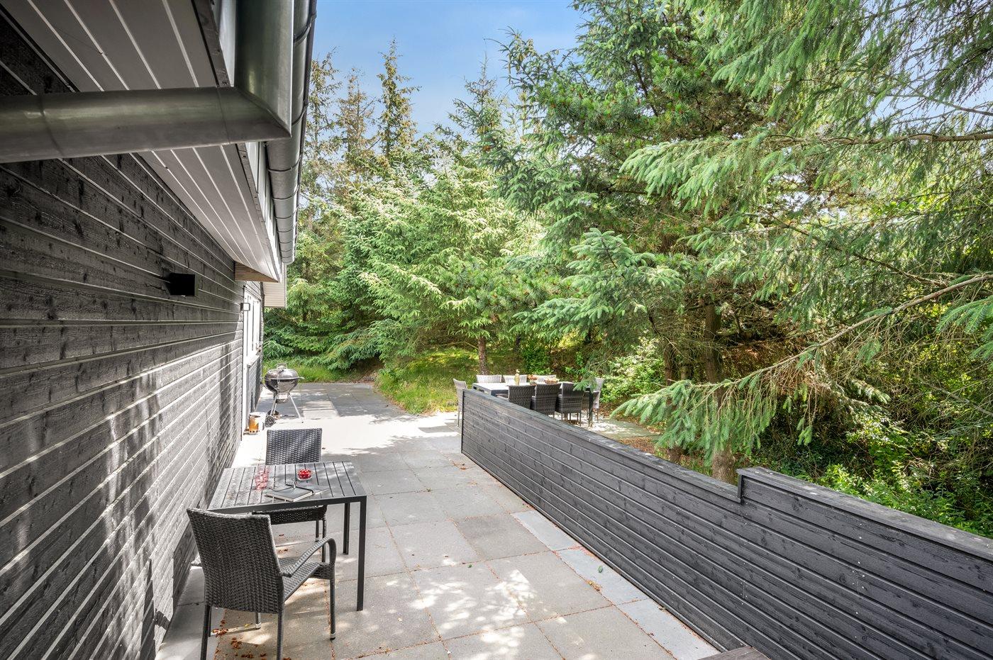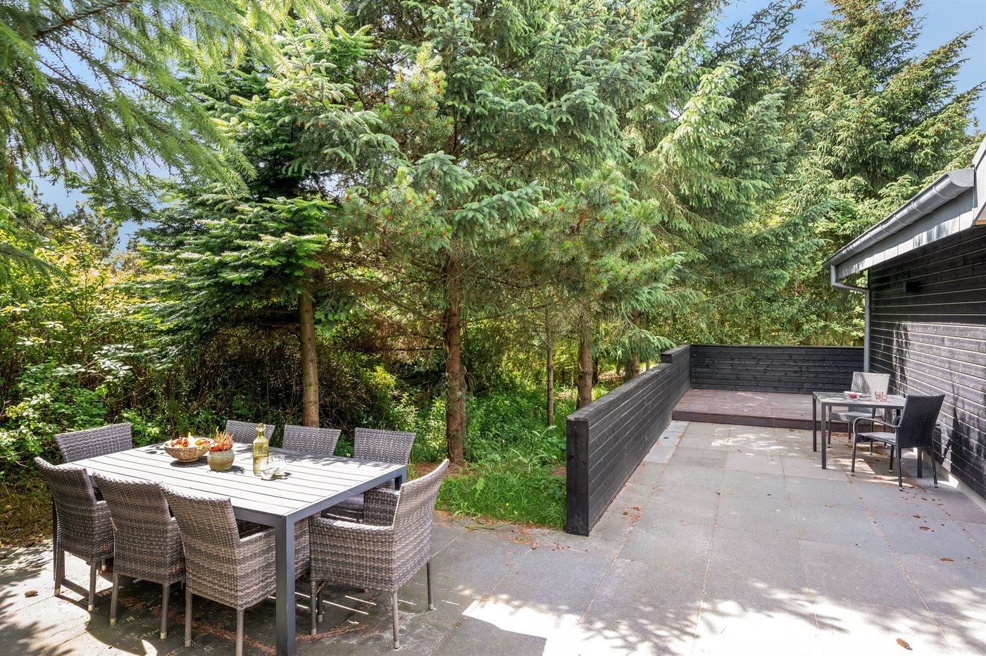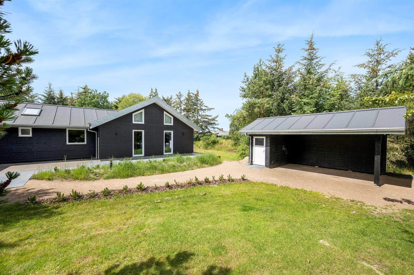 Ferieboligen er beliggende på en 2000 m² stor naturgrund. Der er 900 m til havet. Nærmeste forretning er beliggende i en afstand af 1900 m. Til ferieboligen hører åbent terrasseareal. Desuden er der overdækket terrasse. Gynge. Grill til rådighed. Der er carport til rådighed. Der er installeret stik til opladning af elbil. Type 2 stik. Med 11 kW ladeeffekt. Parkering ved ferieboligen.