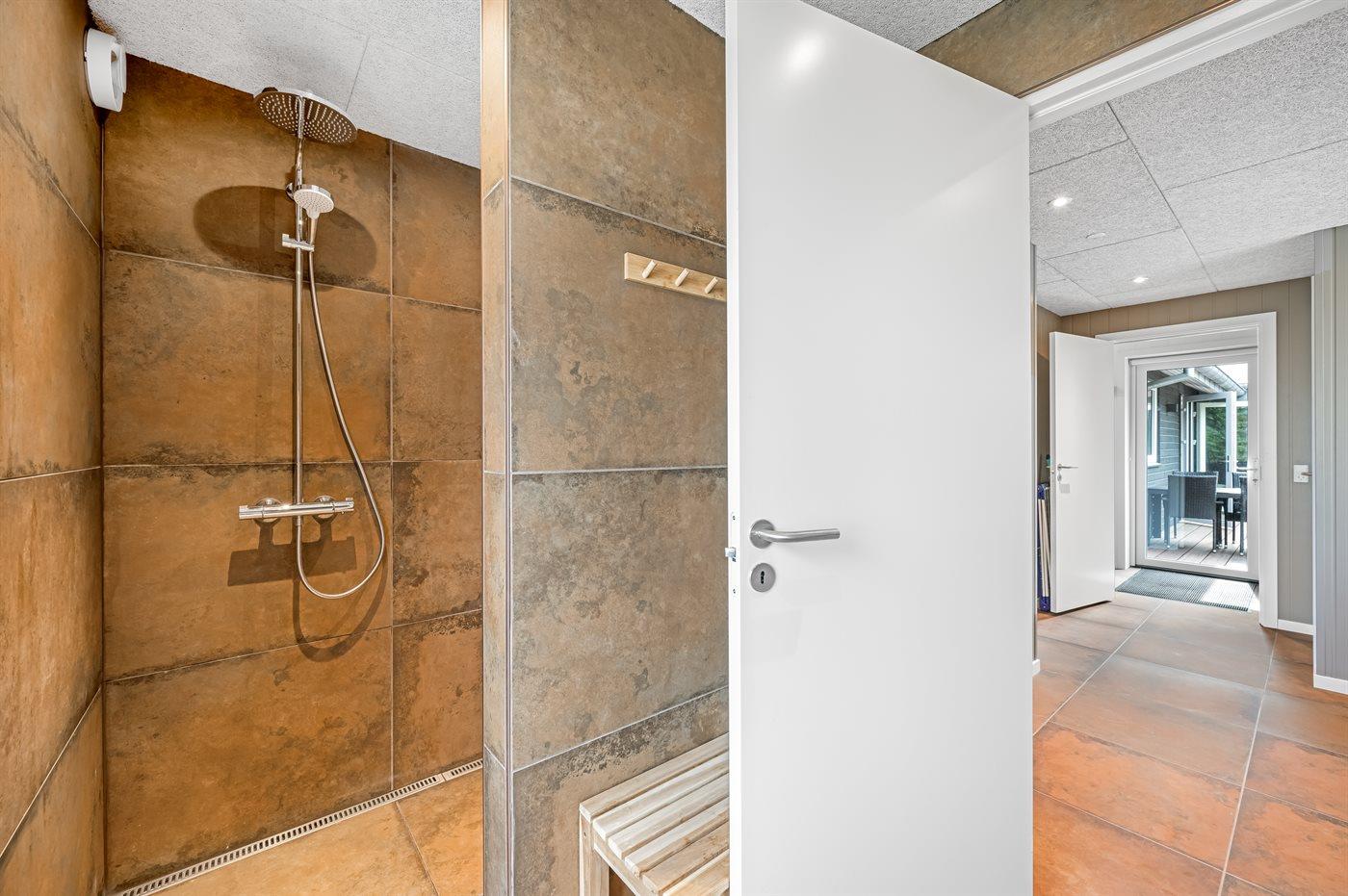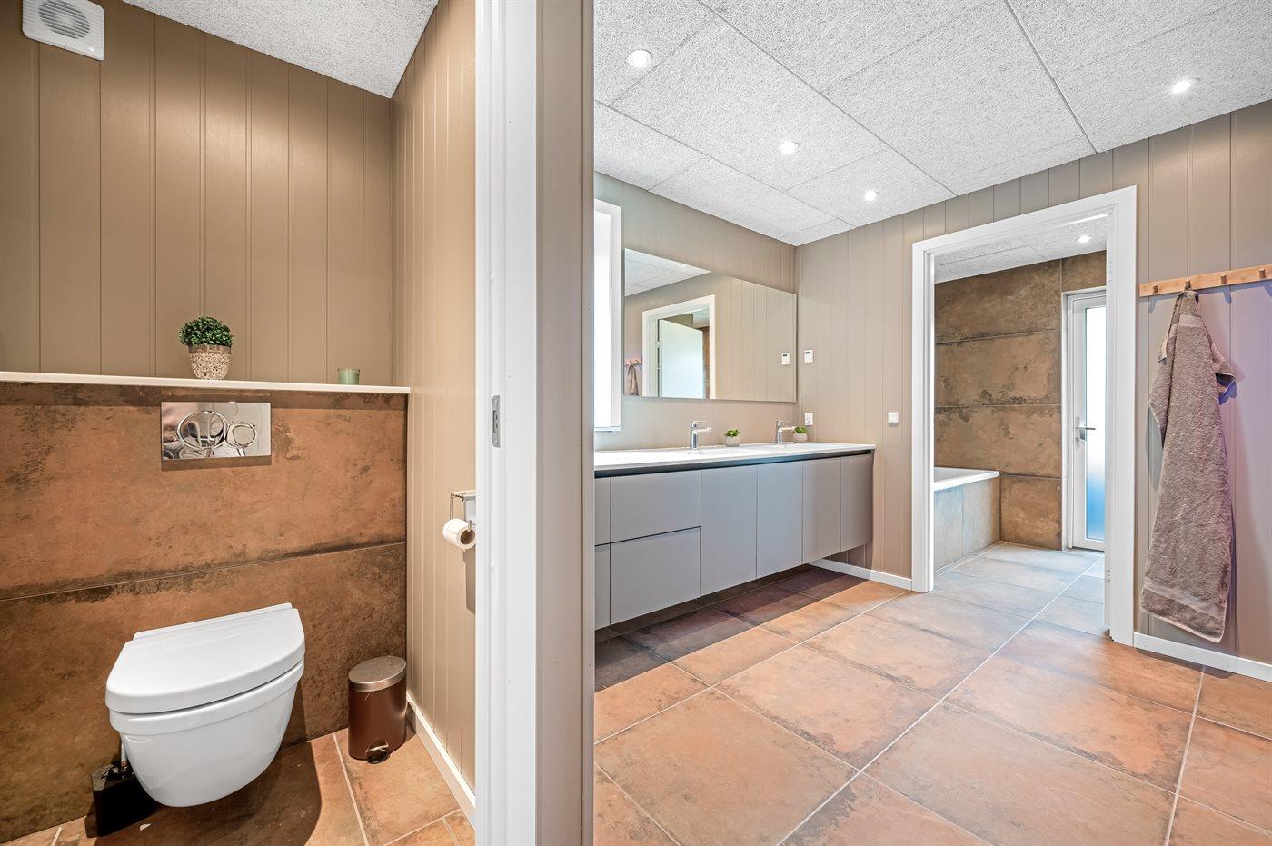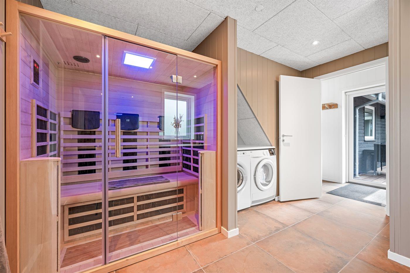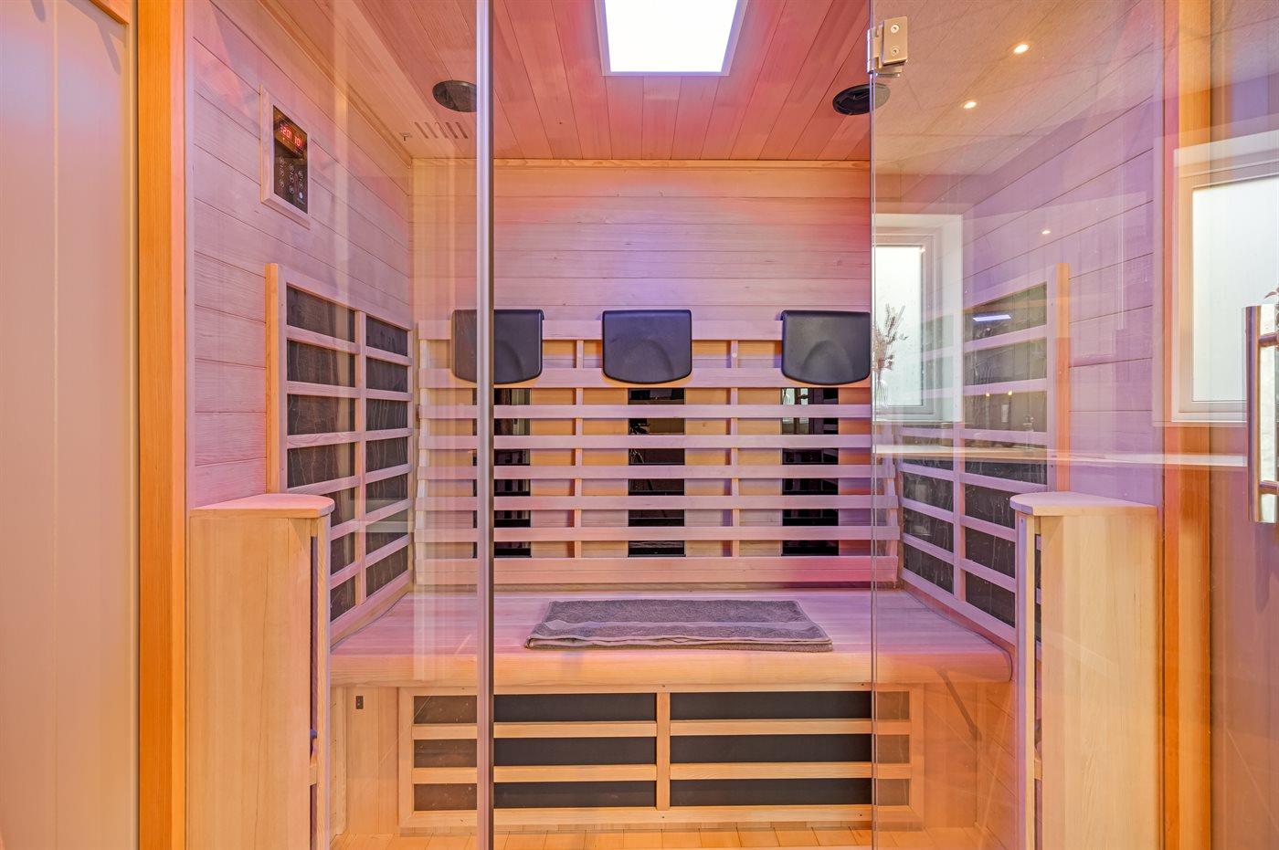 Der er 2 badeværelser med bruseniche og 2 toiletter. Der er gulvvarme på 2 badeværelser.. Badekar. I den infrarøde sauna er der mulighed for afslapning.