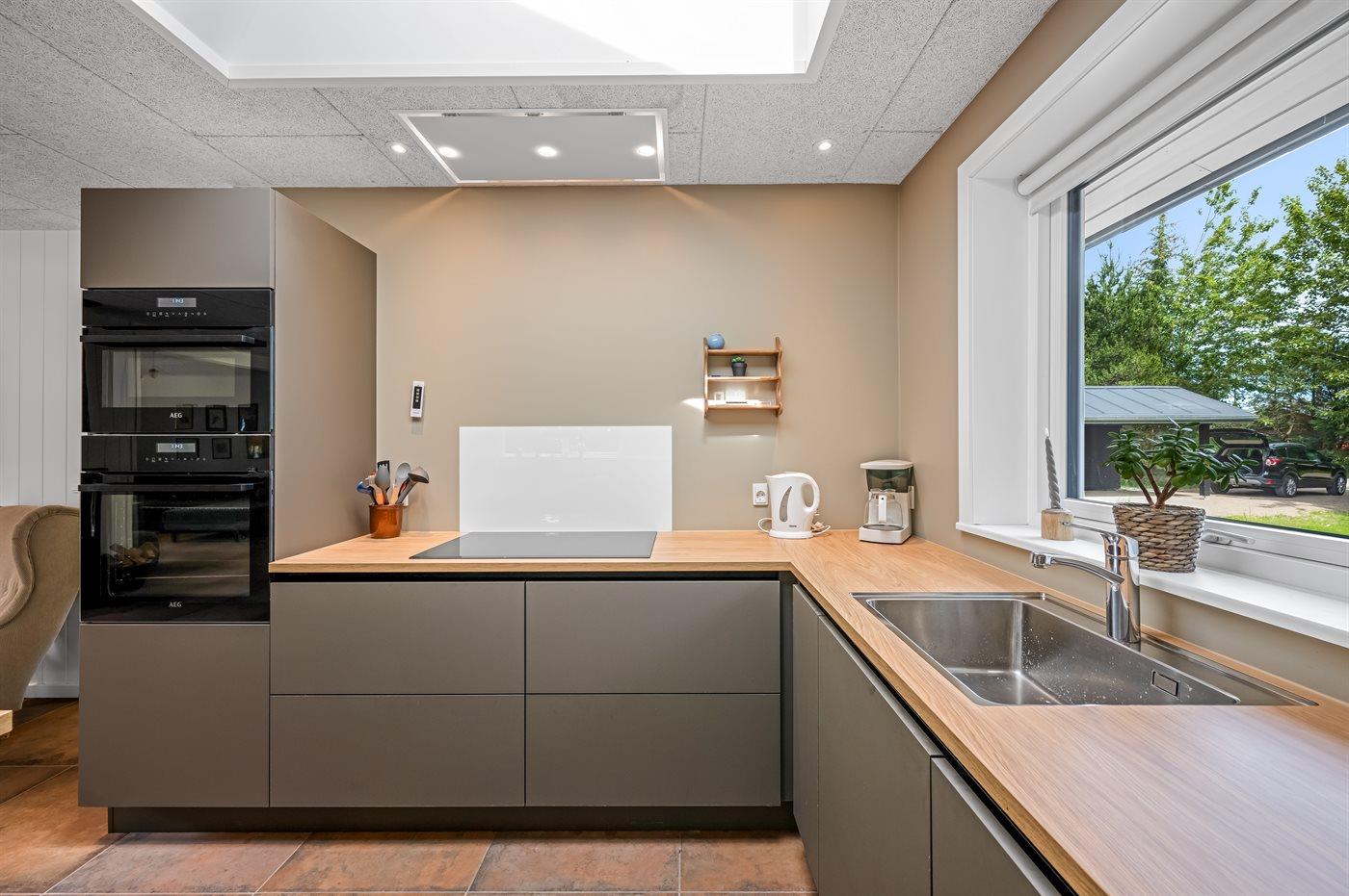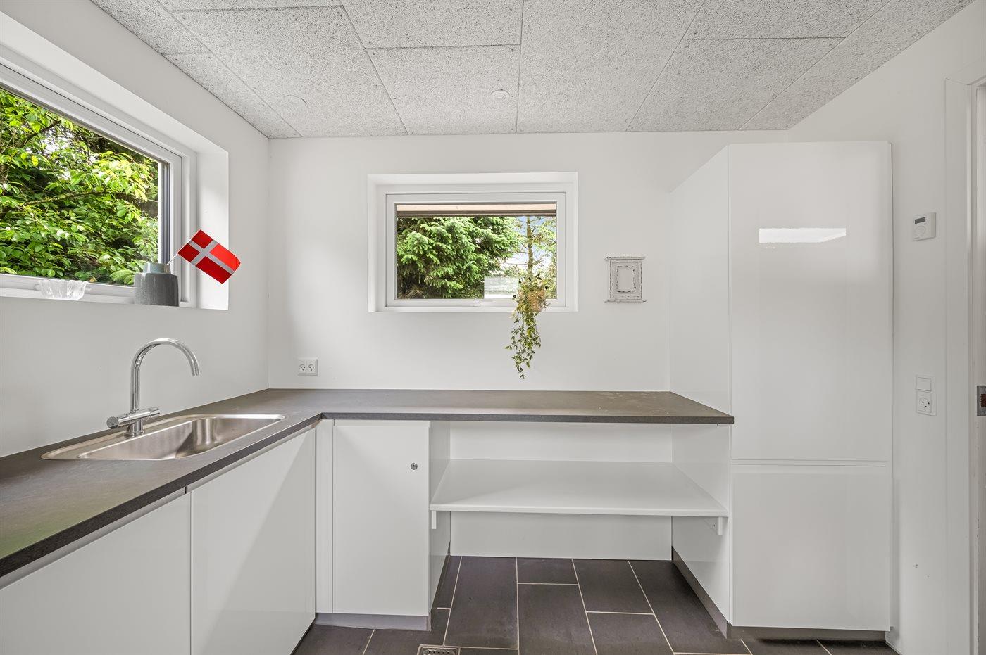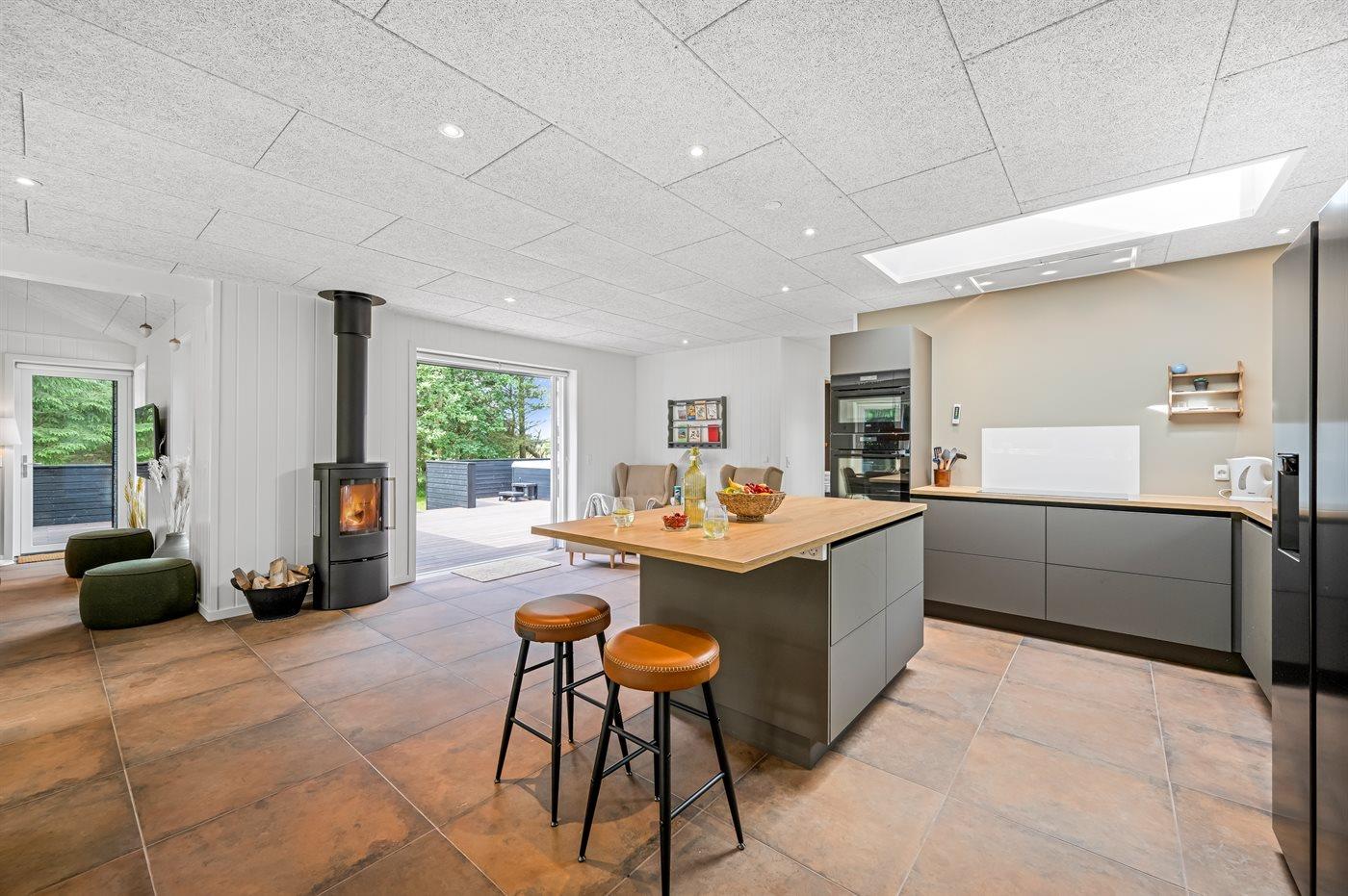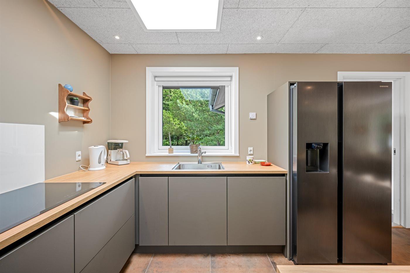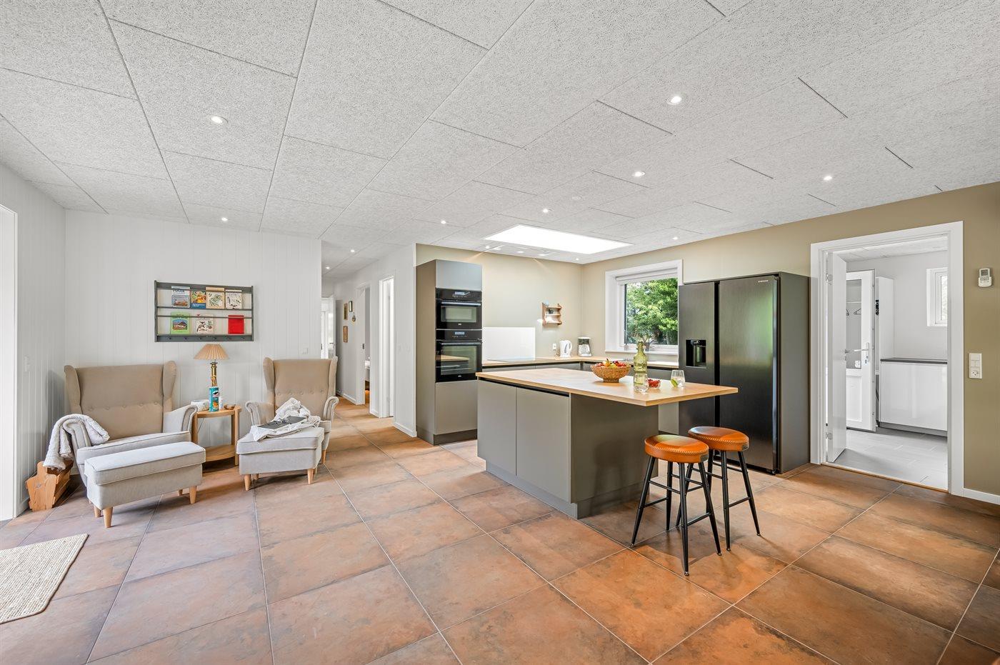 Køkkenet er udstyret med 1 køleskab. Der er 4 induktionskogeplader, 2 varmluftovne, mikrobølgeovn samt opvaskemaskine.