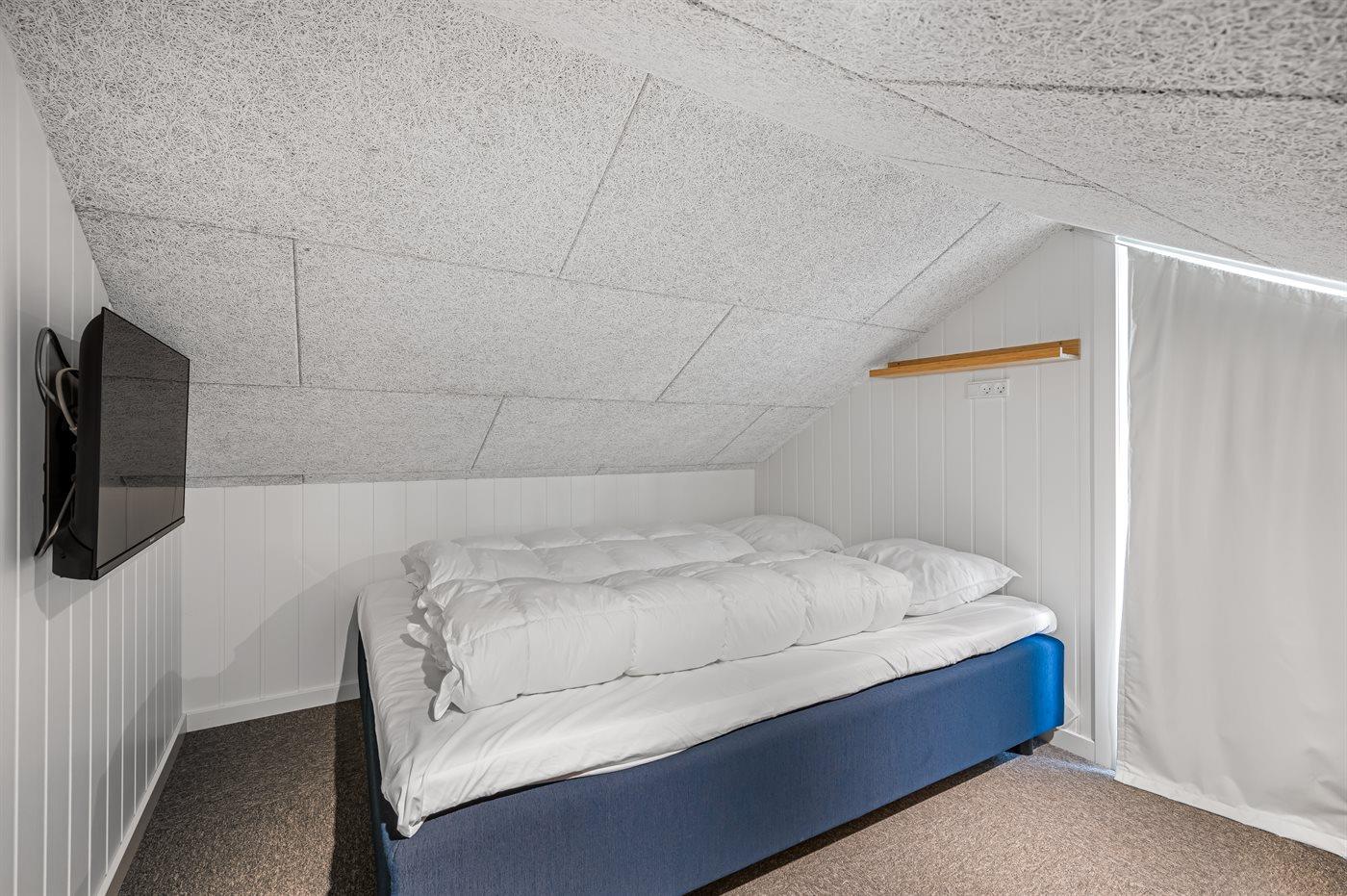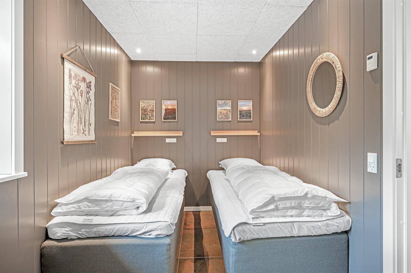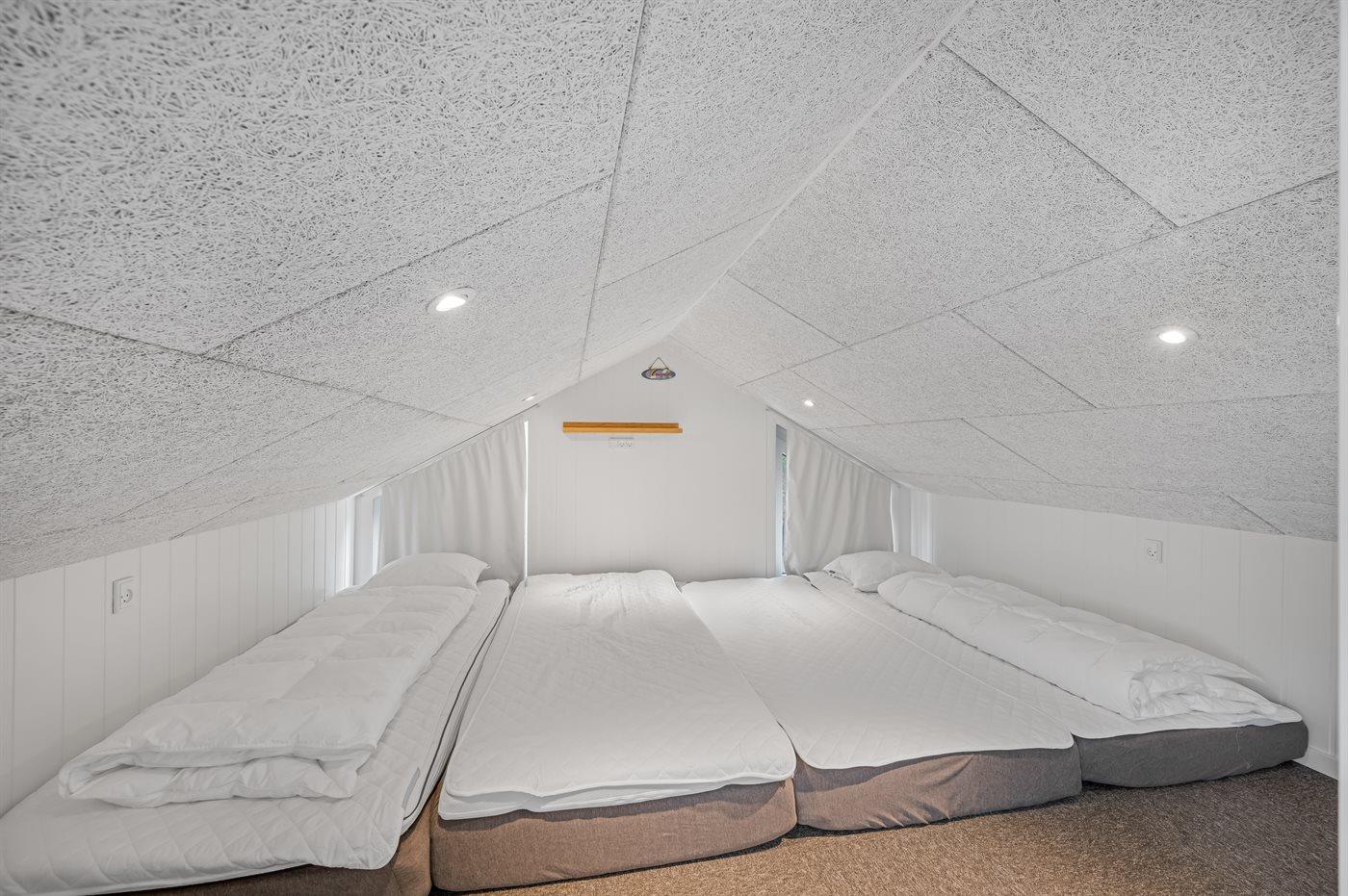 Der er i alt 5 soveværelser. Sovepladserne fordeler sig på: 8 sovepladser i dobbeltsenge. 2 sovepladser i enkeltsenge. 2 sovepladser på madrasser. 2 af disse sovepladser befinder sig på husets hems.