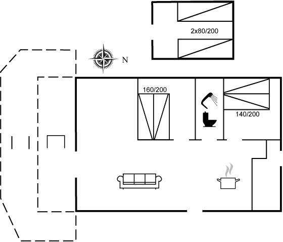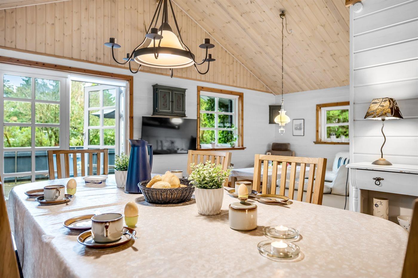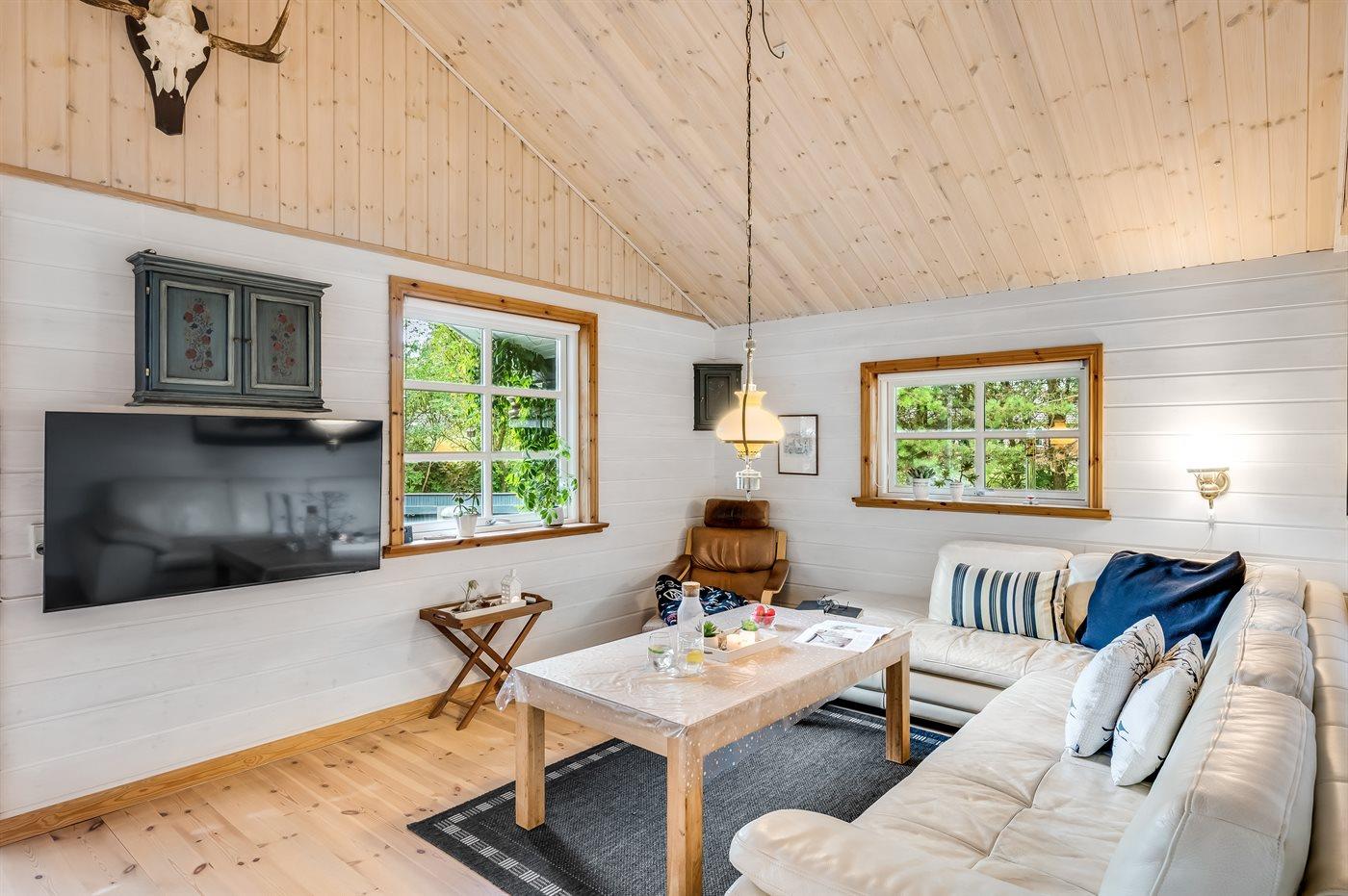 Sommerhuset er indrettet med åbent køkken og opholdstue, stort badeværelse, to soveværelser samt anneks med to sovepladser. Der er en vestvendt, lukket terrasse.