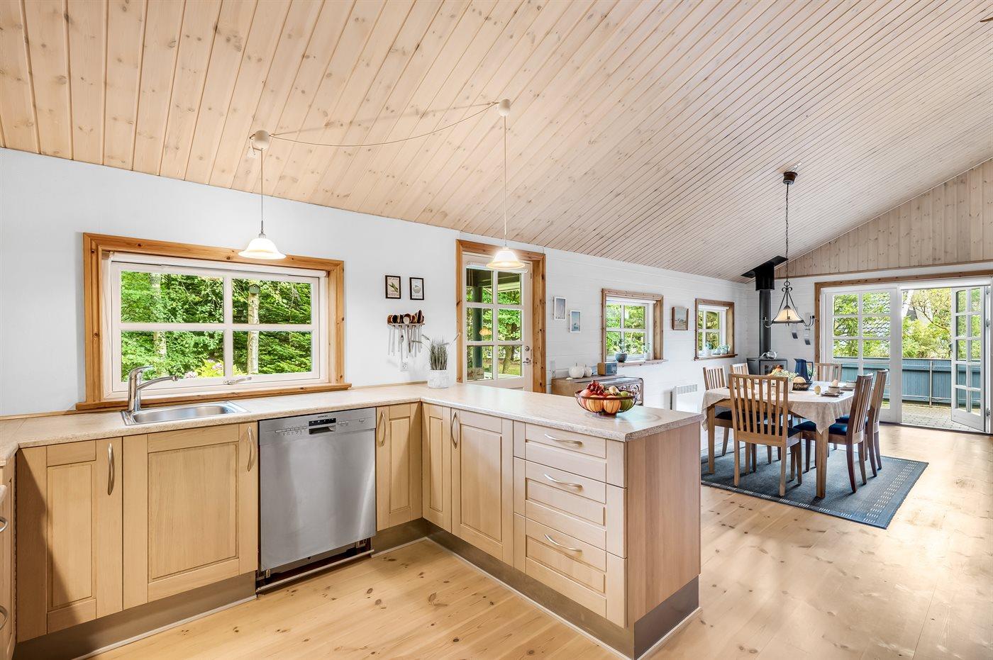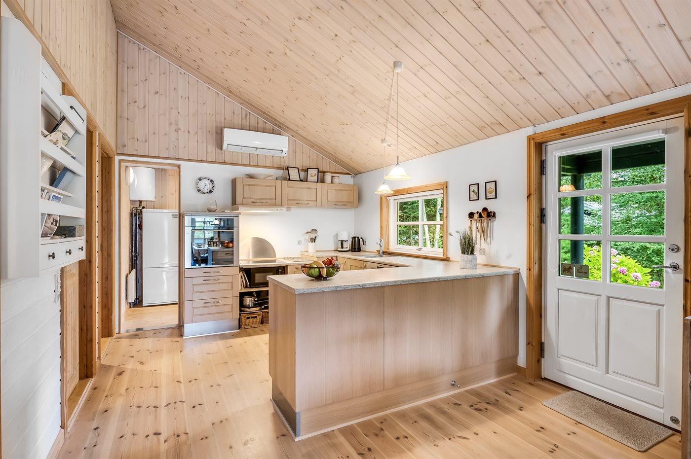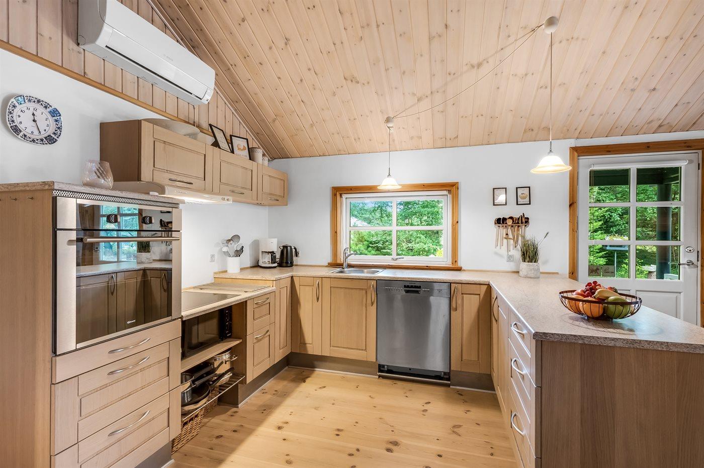 Køkkenet er udstyret med 1 køleskab. Der er 4 keramiske kogeplader, varmluftovn, mikrobølgeovn samt opvaskemaskine.