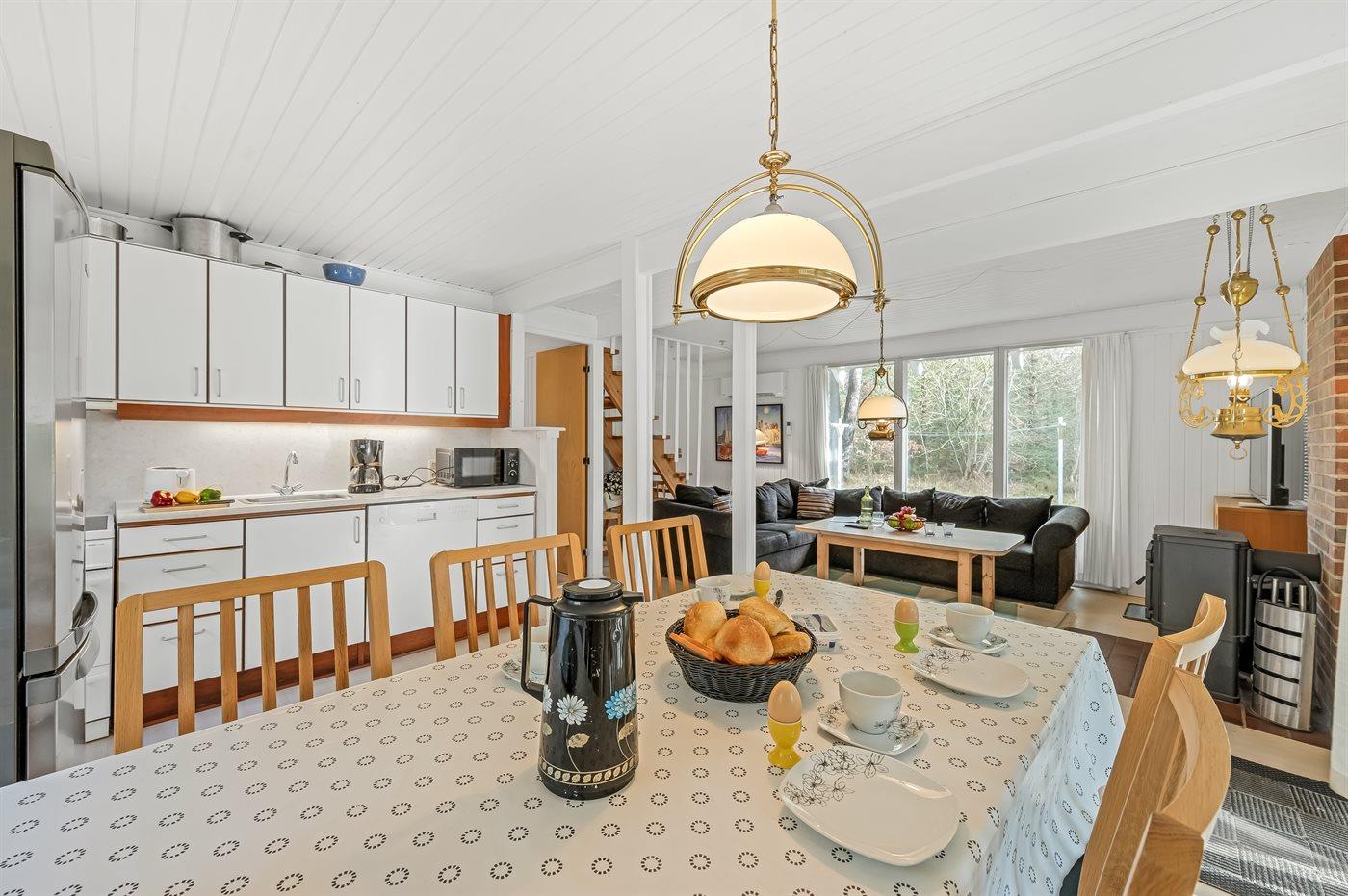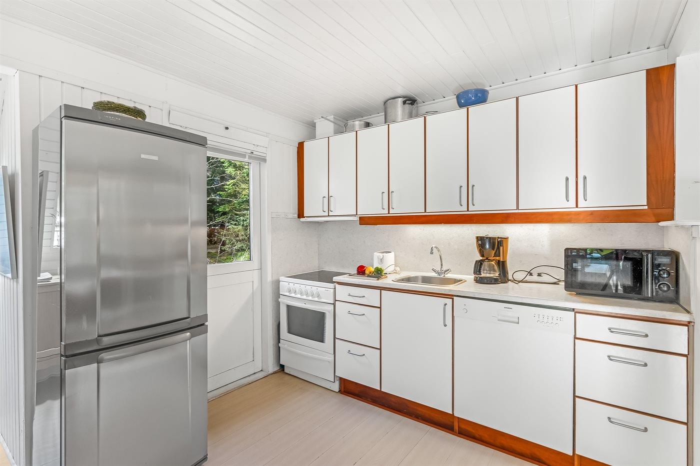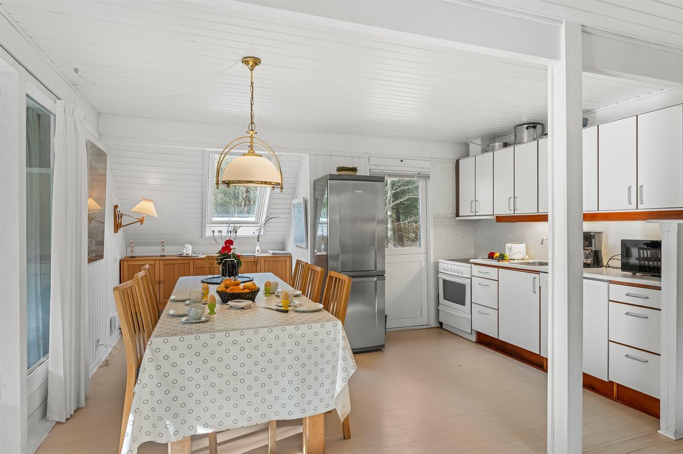 Køkkenet er udstyret med 1 køleskab. Der er 4 keramiske kogeplader, varmluftovn samt opvaskemaskine.