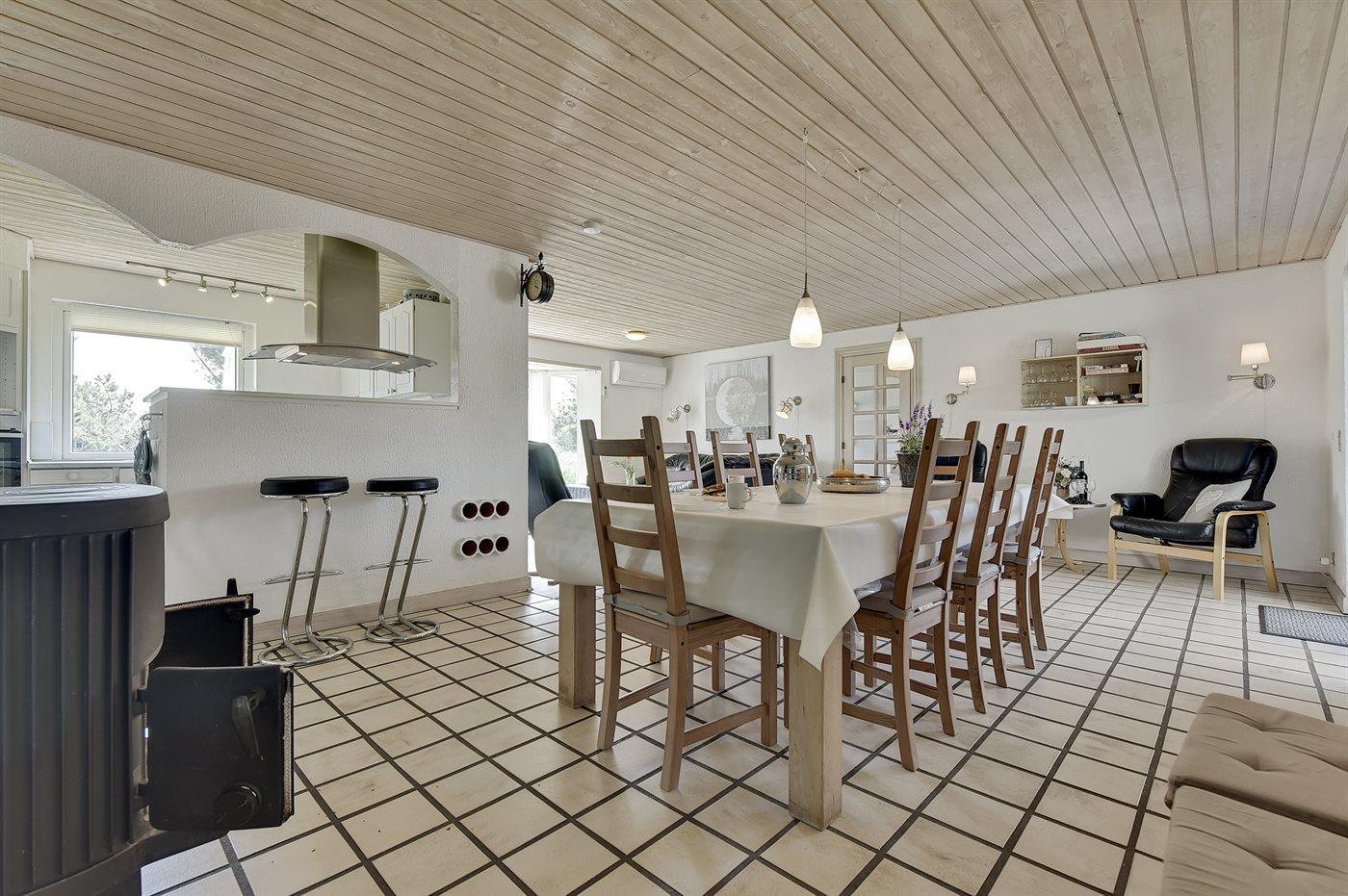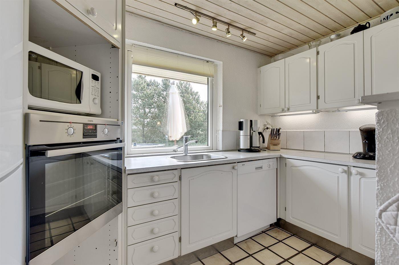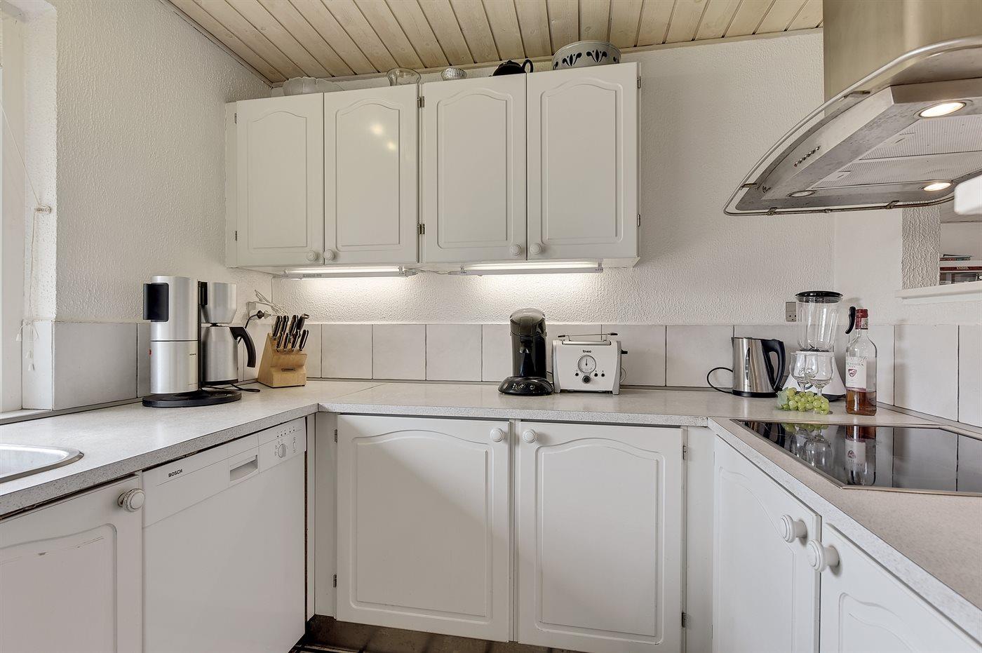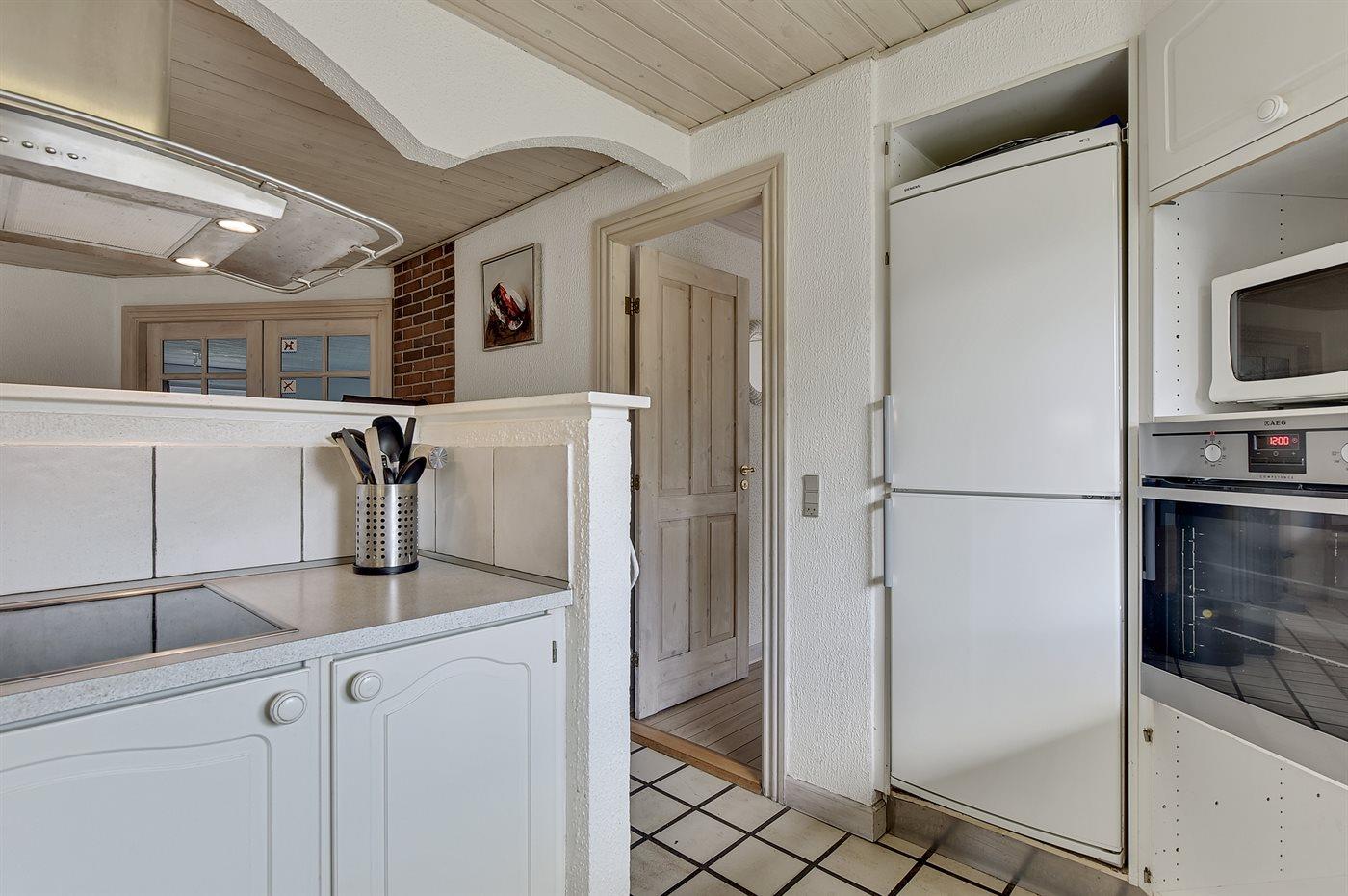 Køkkenet er udstyret med 1 køleskab. Der er 4 elkogeplader, varmluftovn, mikrobølgeovn samt opvaskemaskine.