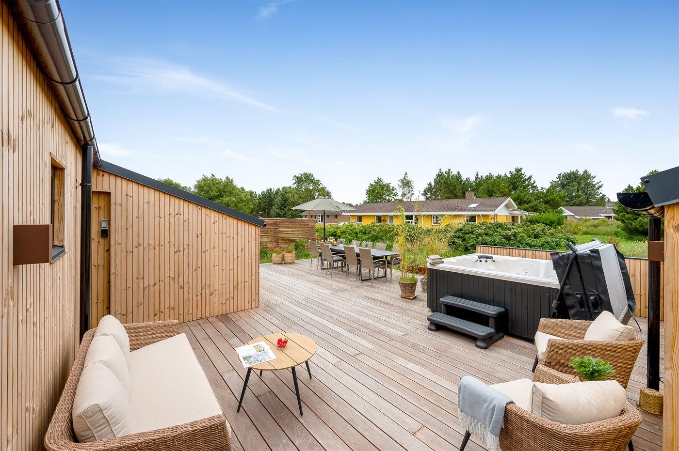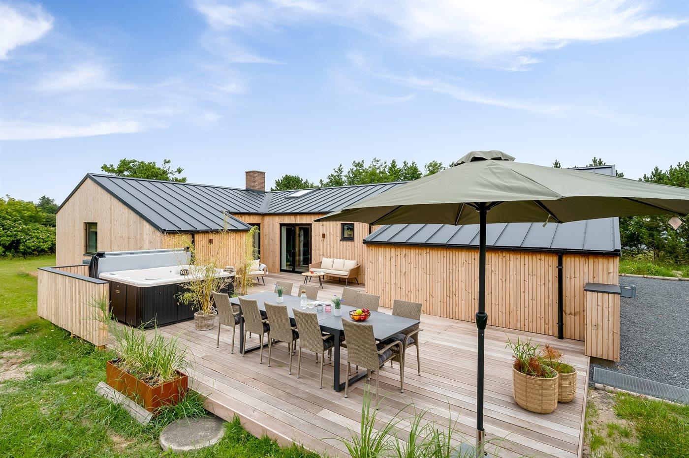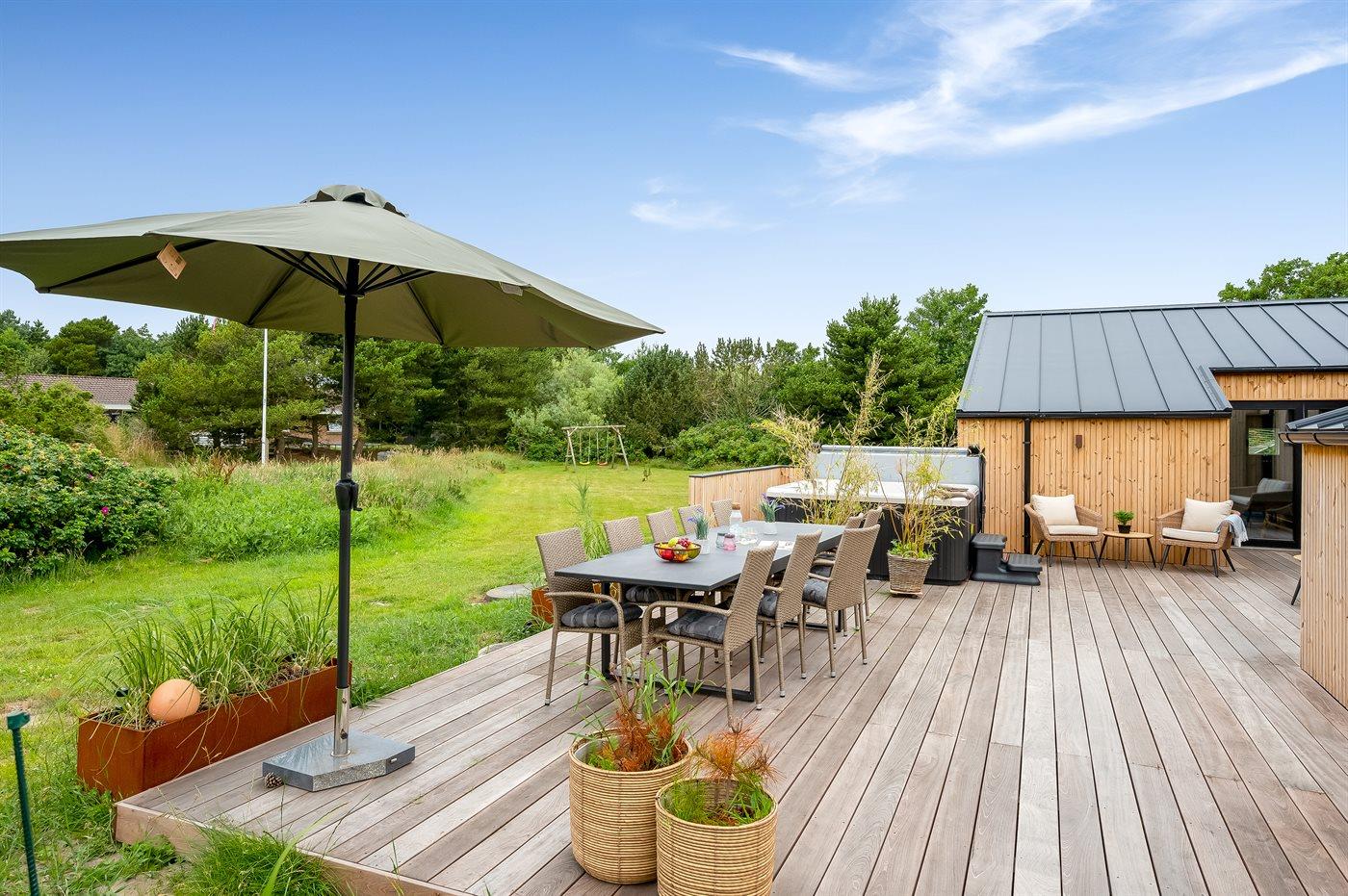 Eksklusivt poolsommerhus med sauna, spa og stor terrasse i rolige omgivelser nær Blåvand strand.