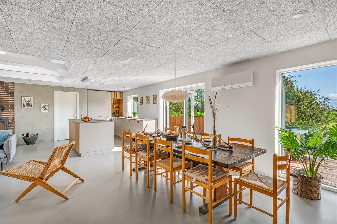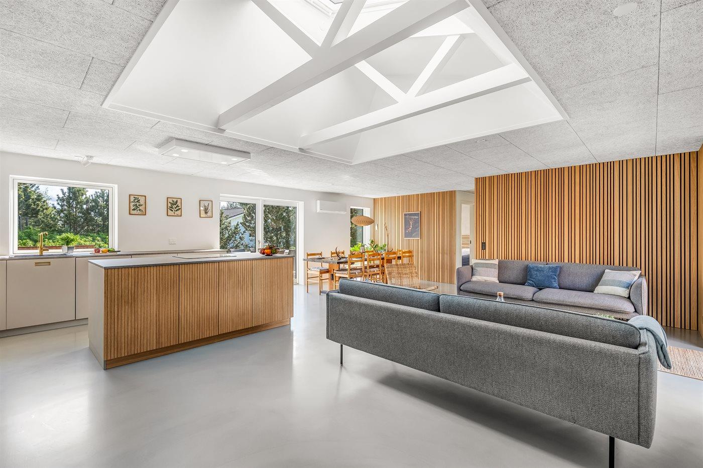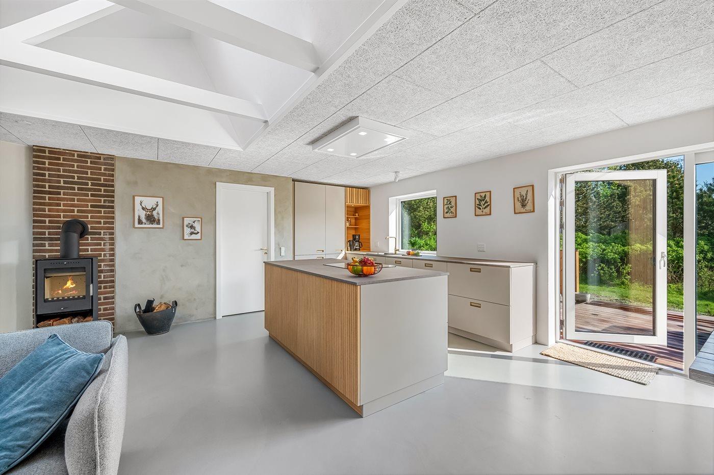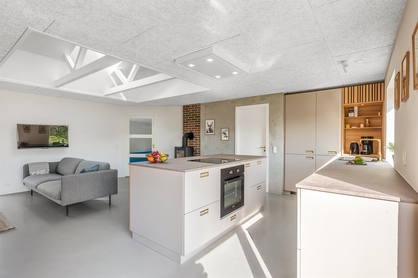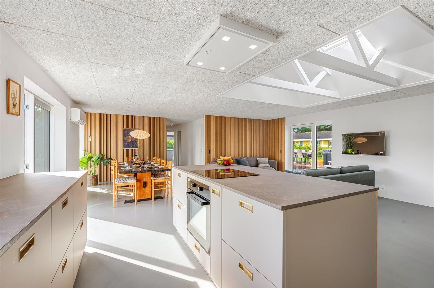 Køkkenet er udstyret med 1 køleskab. Der er 4 keramiske kogeplader, bageovn, mikrobølgeovn samt opvaskemaskine.
