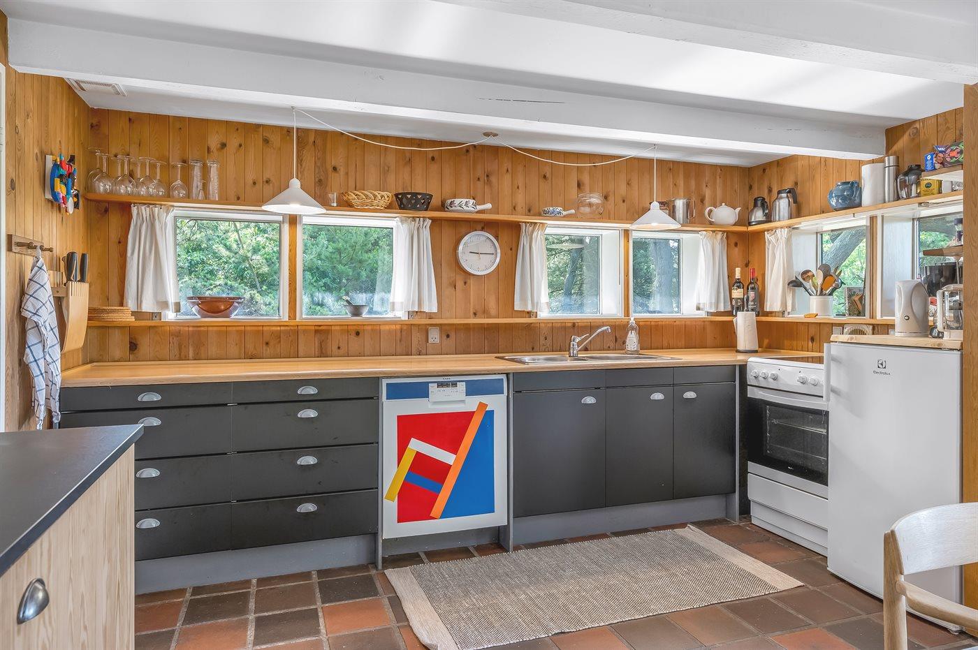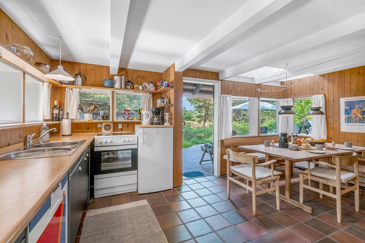 Køkkenet er udstyret med 1 køleskab. Der er 4 keramiske kogeplader, varmluftovn samt opvaskemaskine.