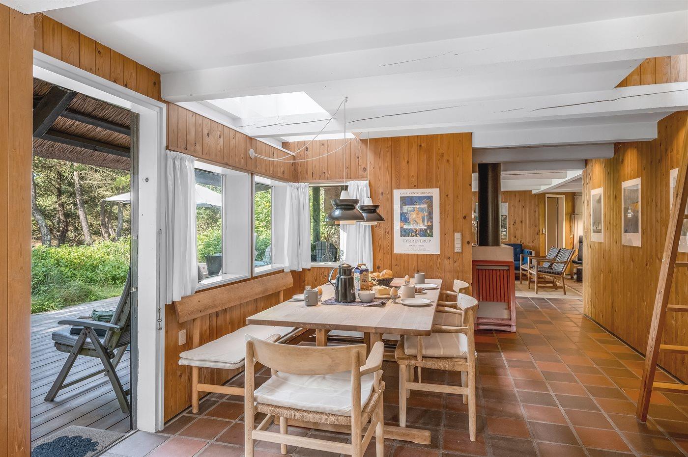 Sommerhuset, der er "arkitektens eget hus", er med trævægge inde som ude og indeholder mange detaljer. Kombineret køkkenafdeling og spisestue med hyggelige bjælkelofter. Alle husets vægge er naturtræ, og der er klinkegulve overalt.