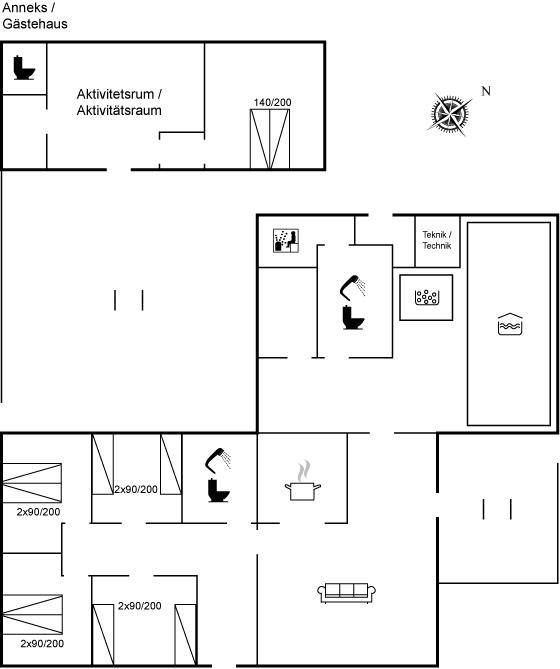 Der er i alt 5 soveværelser. Sovepladserne fordeler sig på: 6 sovepladser i dobbeltsenge. 4 sovepladser i enkeltsenge. 2 af disse sovepladser befinder sig i anneks.