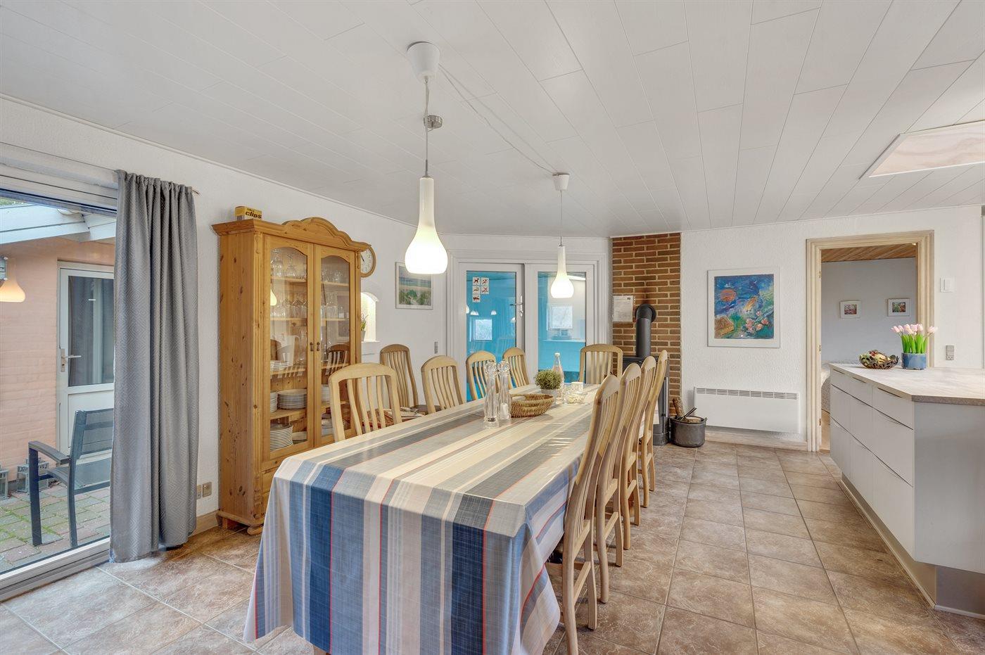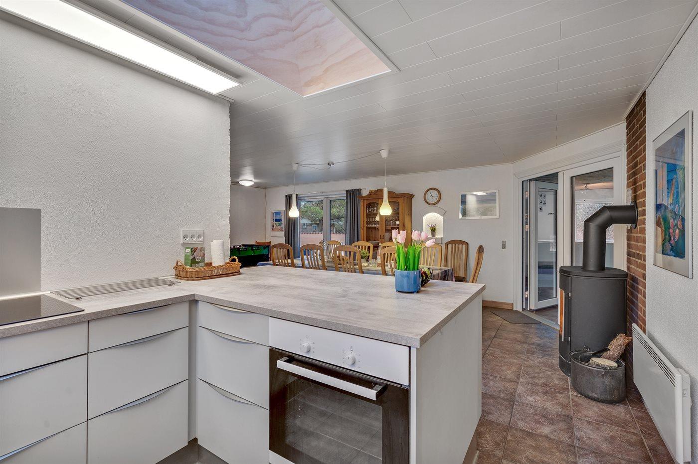Køkkenet er udstyret med 1 køleskab. Der er 4 keramiske kogeplader, varmluftovn, mikrobølgeovn samt opvaskemaskine.