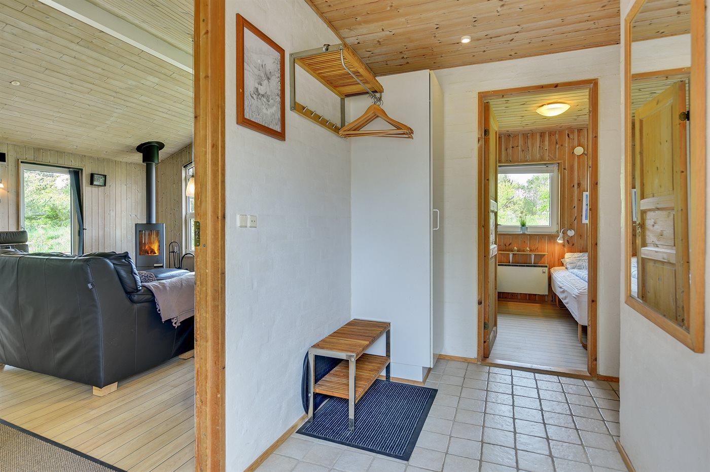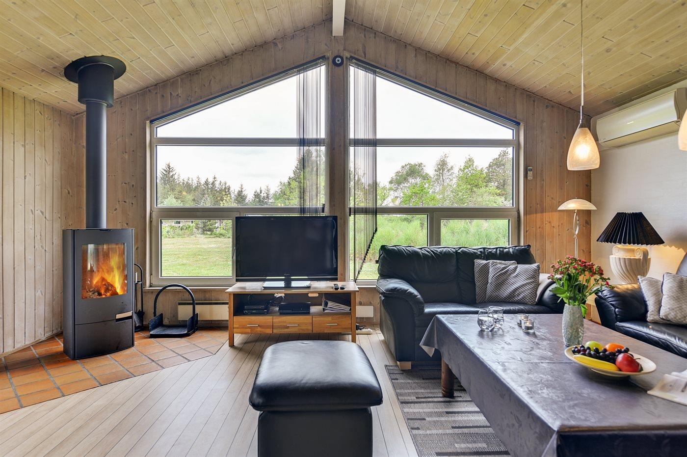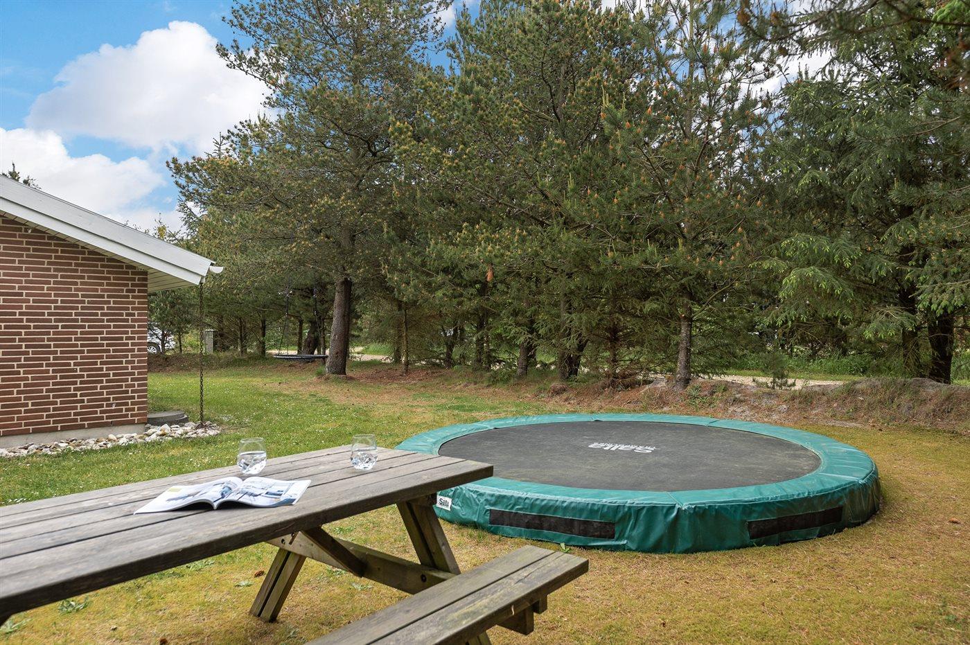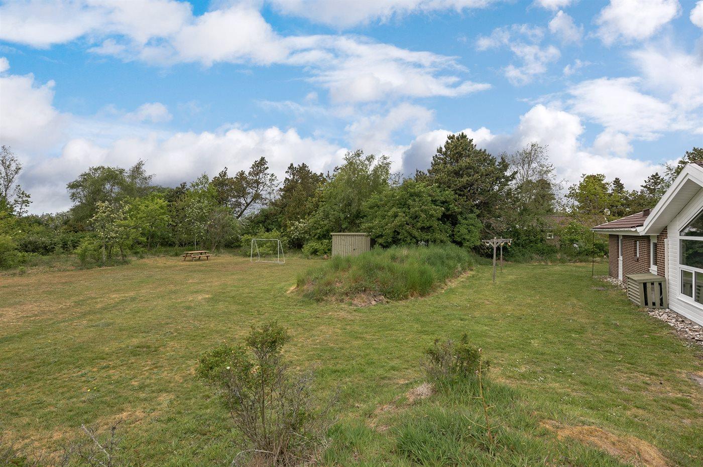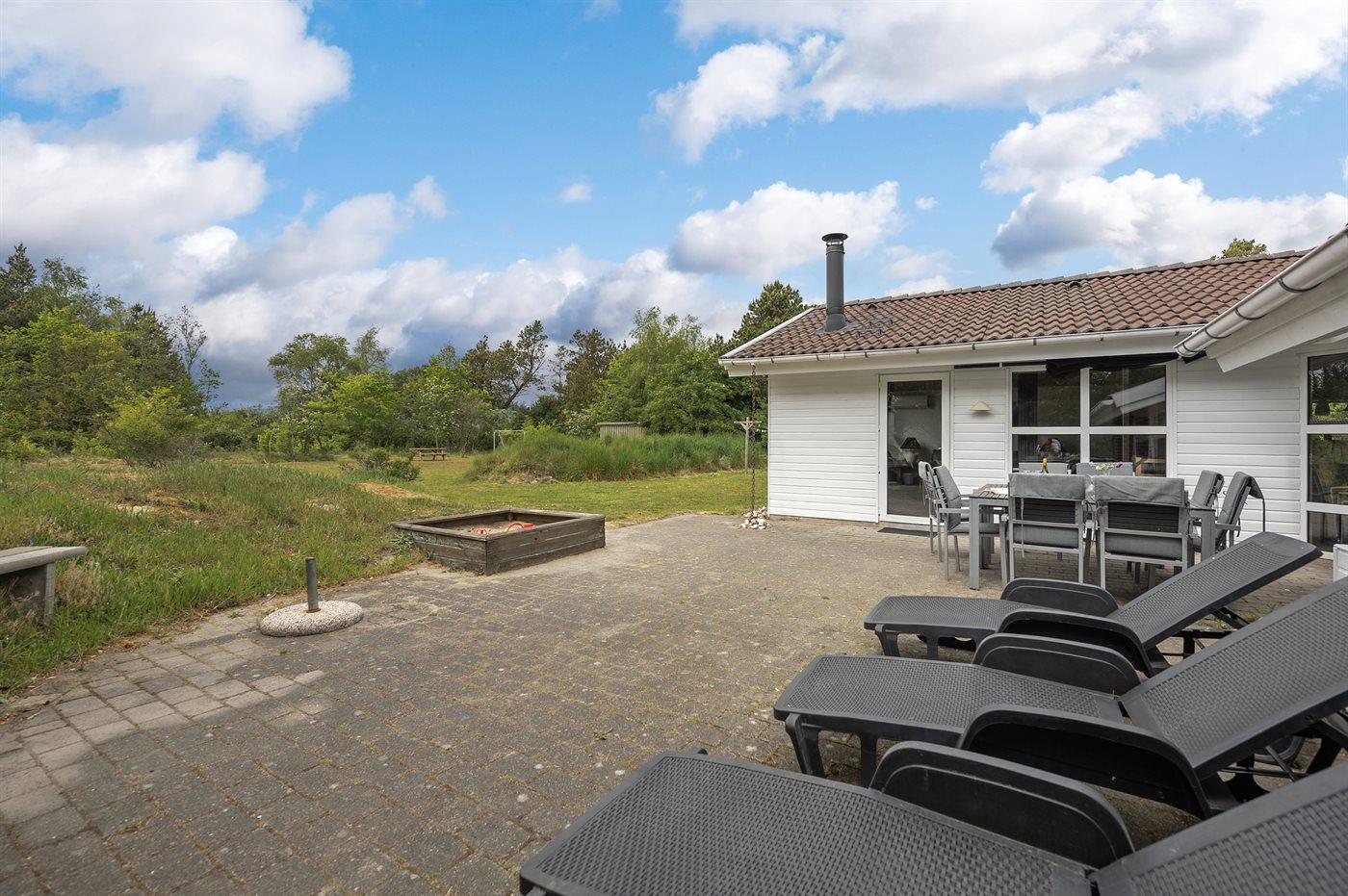 Ferieboligen er beliggende på en 2900 m² stor naturgrund. Der er 3000 m til havet. Der er 900 m til fjorden. Nærmeste forretning er beliggende i en afstand af 6000 m. Til ferieboligen hører 50 m² terrasseareal. Gynge. Sandkasse. Trampolin. Legetårn. Rutchebane. Fodboldmål. På lune aftener sørger en udendørs pejs for hyggelig stemning. Der er installeret stik til opladning af elbil. Type 2 stik. Med 11 kW ladeeffekt. 16A. Ladekabel på 5 m. Parkering ved ferieboligen.