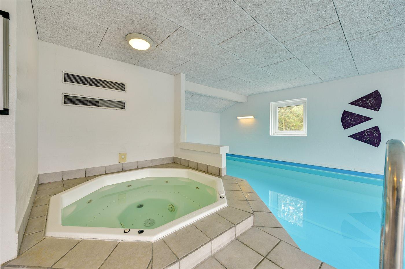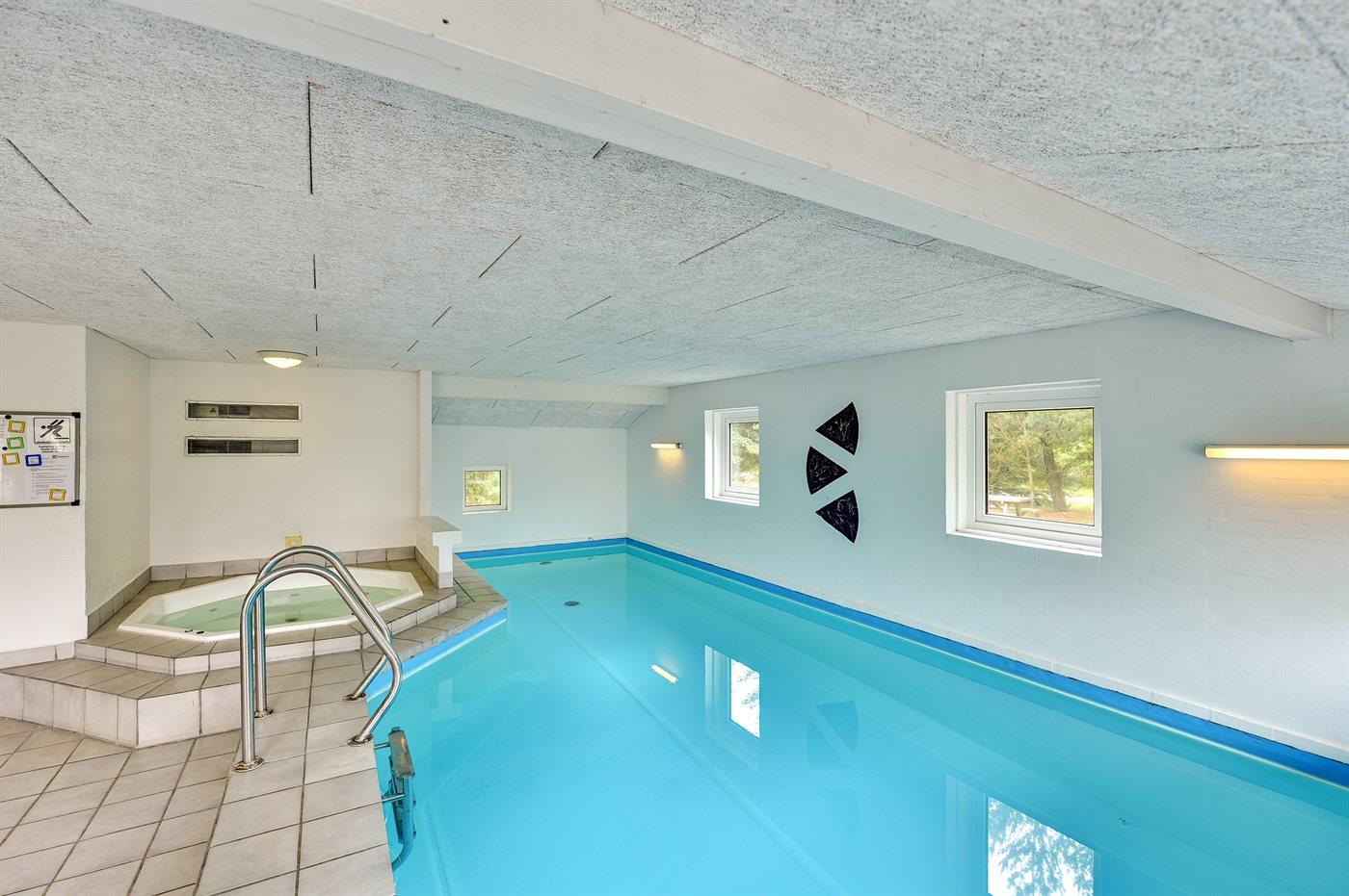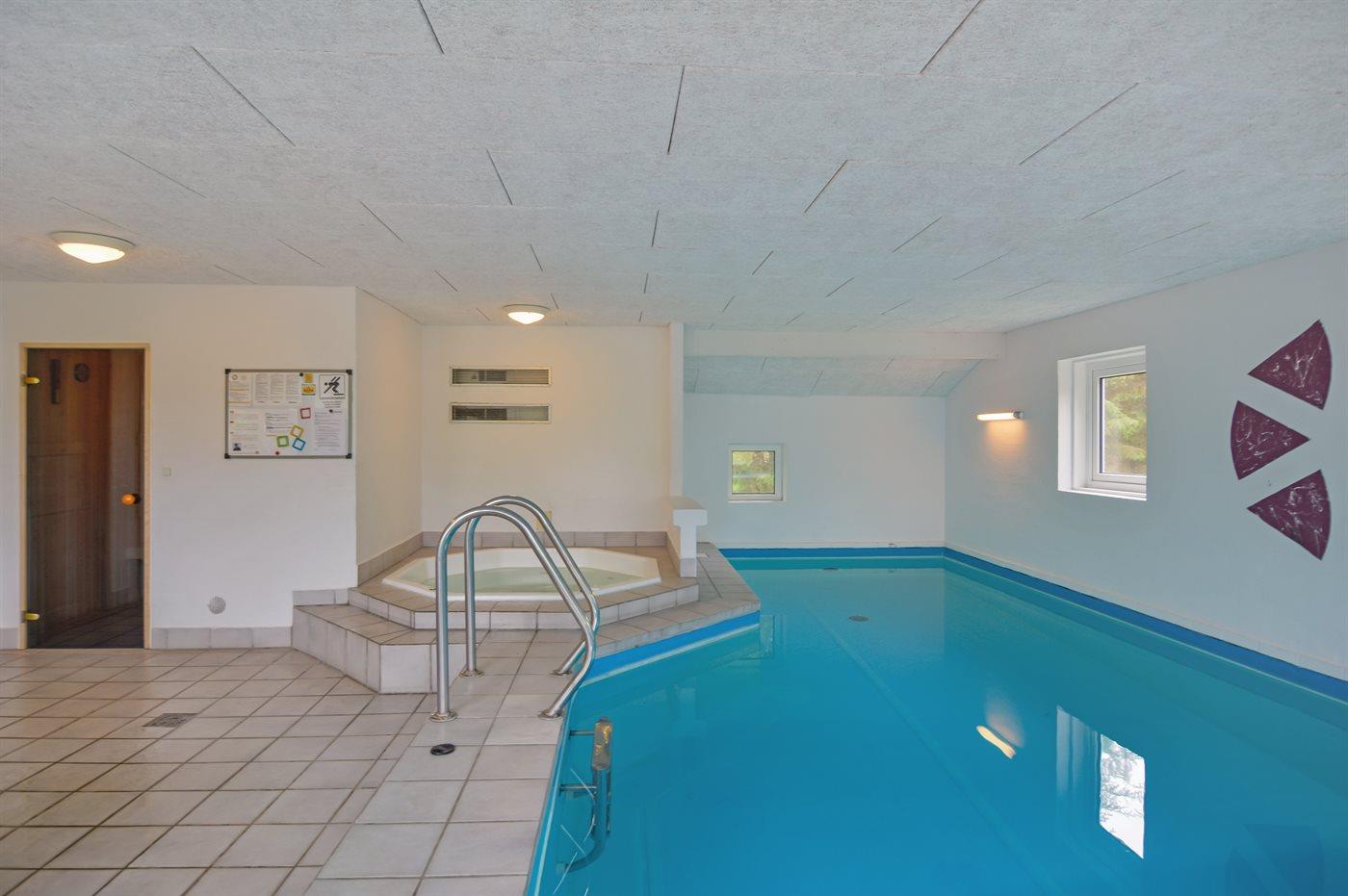 I den indendørs swimmingpool er der mulighed for leg og hyggeligt samvær. Swimmingpoolen måler op til 3,7 m i bredden, 7,7 m i længden og den er op til 1,2 m dyb. Vandet er mellem 24 og 28° C varmt. Der er gulvvarme i swimmingpoolområdet.