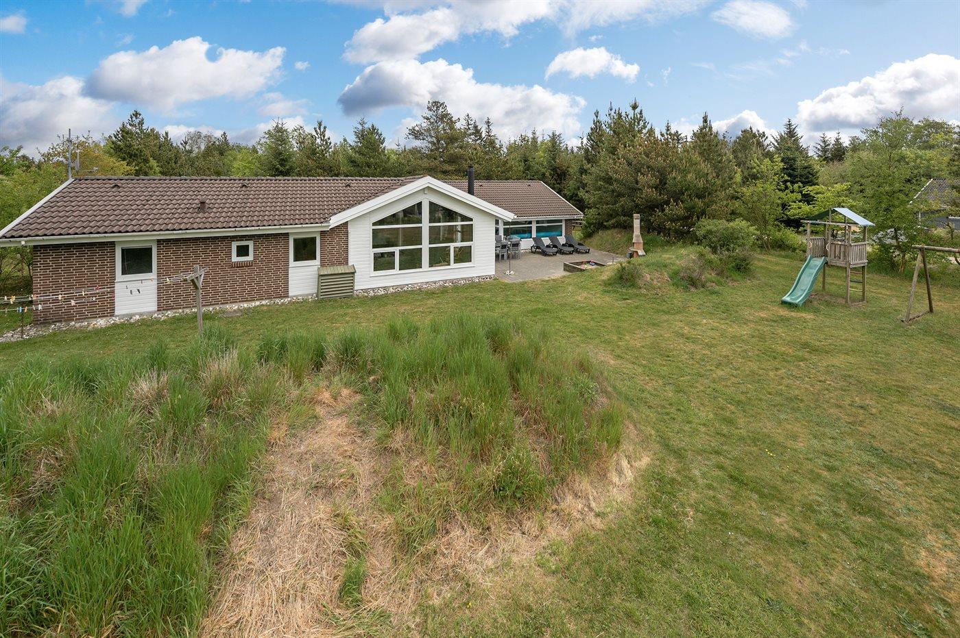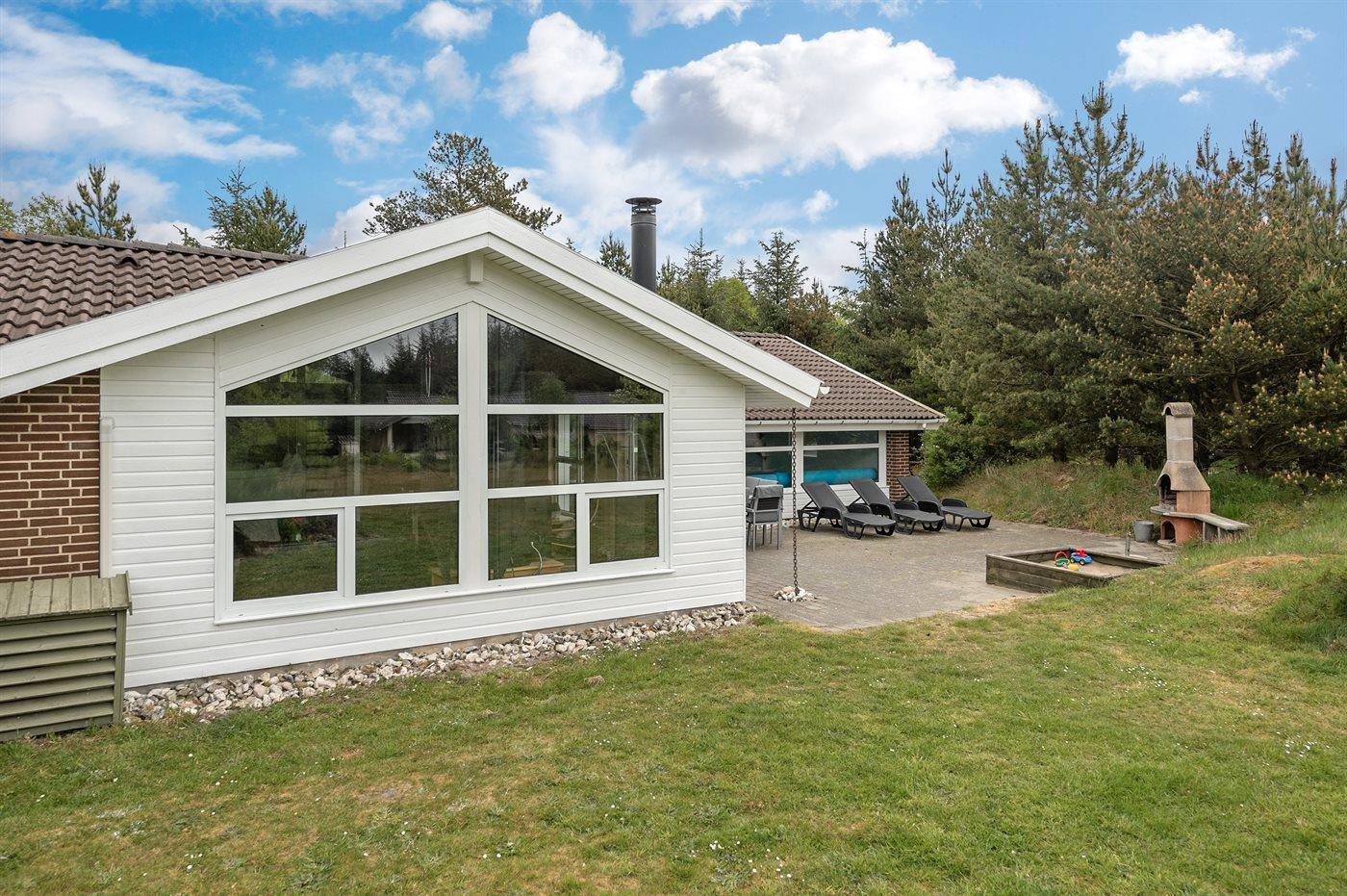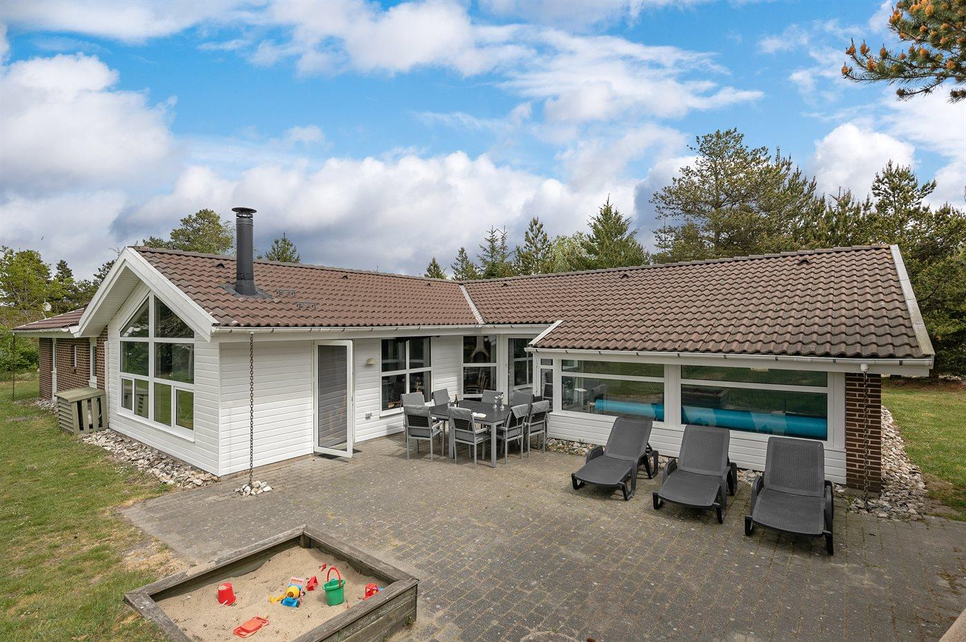Dette sommerhus ligger i Ho, hvor der er mange aktivitetsmuligheder som bowling, golf, ridning, zoo og fiskesø. Huset ligger desuden kun 5 minutters kørsel fra én af Danmarks bedste badestrande, men dog så langt derfra, at her kan man finde mere ro. Huset er praktisk og flot møbleret og byder på mange faciliteter, som gør det velegnet til ferieophold året rundt. Swimmingpoolområdet er adskilt fra stuen og køkkenet af et glasparti, der gør det muligt at holde øje med de badende. I dejligt vejr kan man slappe af i fred og ro på den sydvendte terrasse, da huset ligger på en naturgrund, der er omgivet af beplantning.