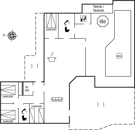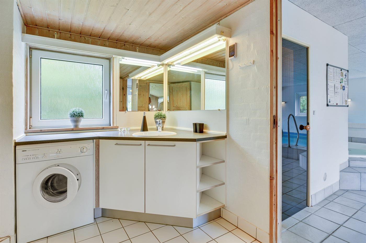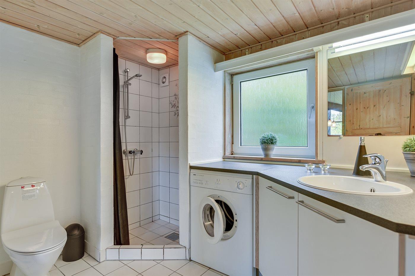Der er 2 badeværelser med bruseniche og 2 toiletter. Der er gulvvarme på 2 badeværelser. I saunaen er der mulighed for afslapning.