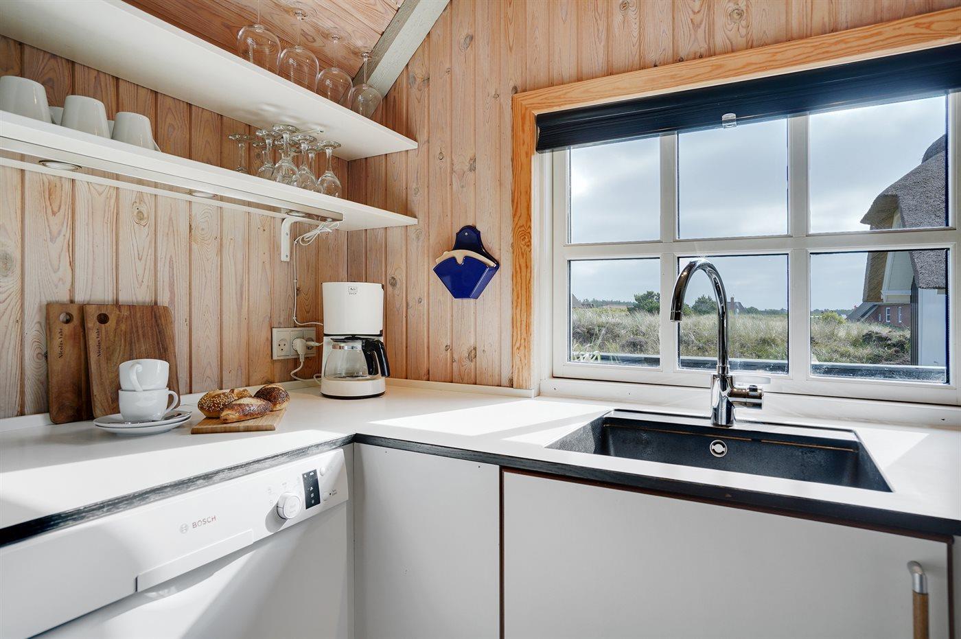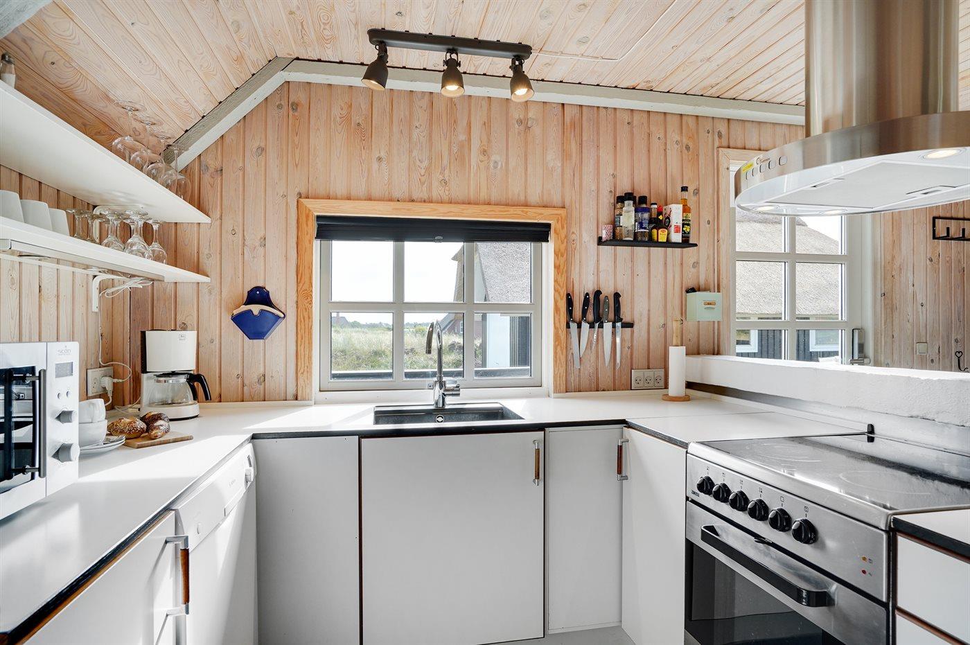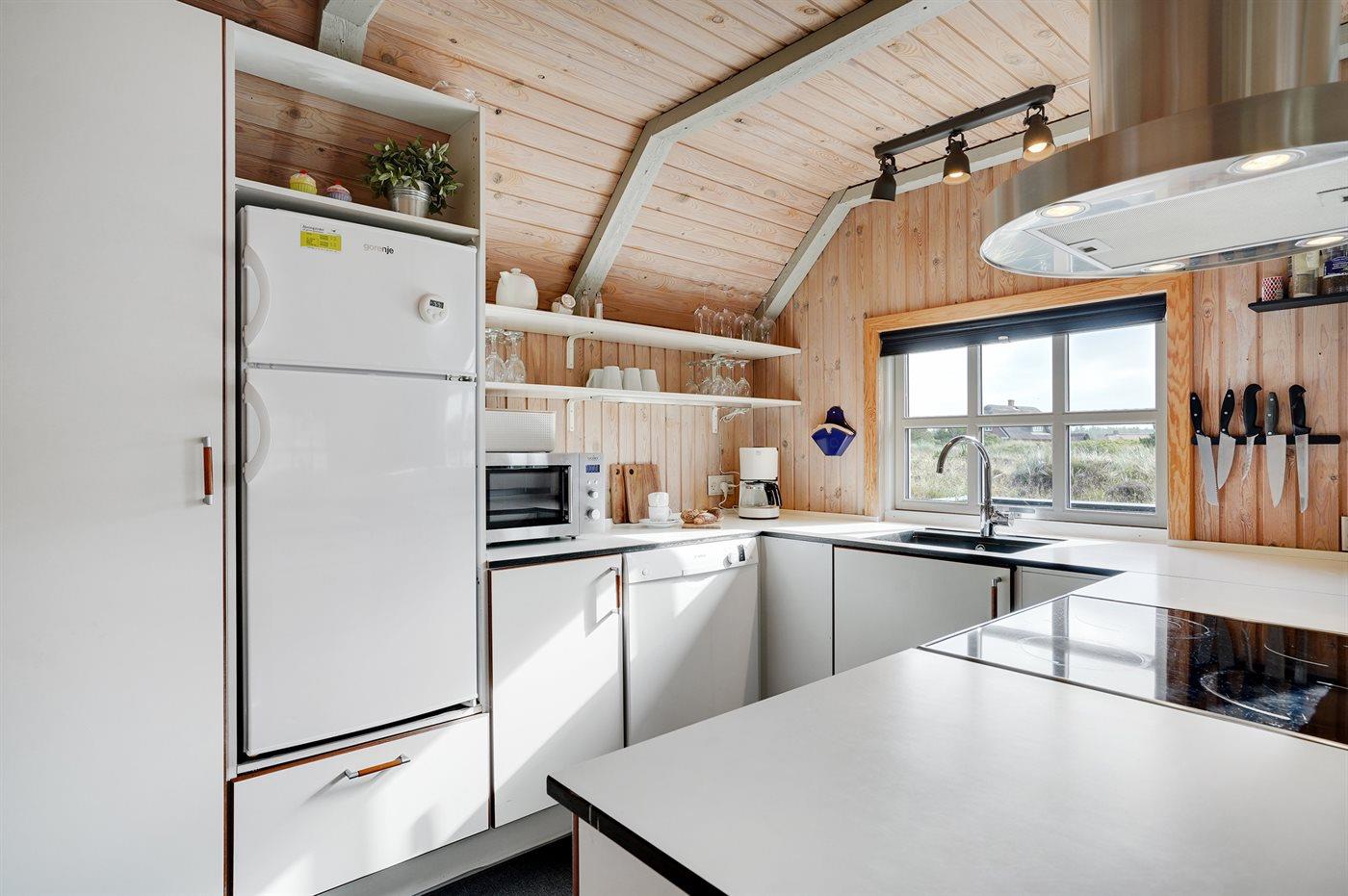 Køkkenet er udstyret med 1 køleskab. Der er 4 keramiske kogeplader, bageovn, mikrobølgeovn samt opvaskemaskine.