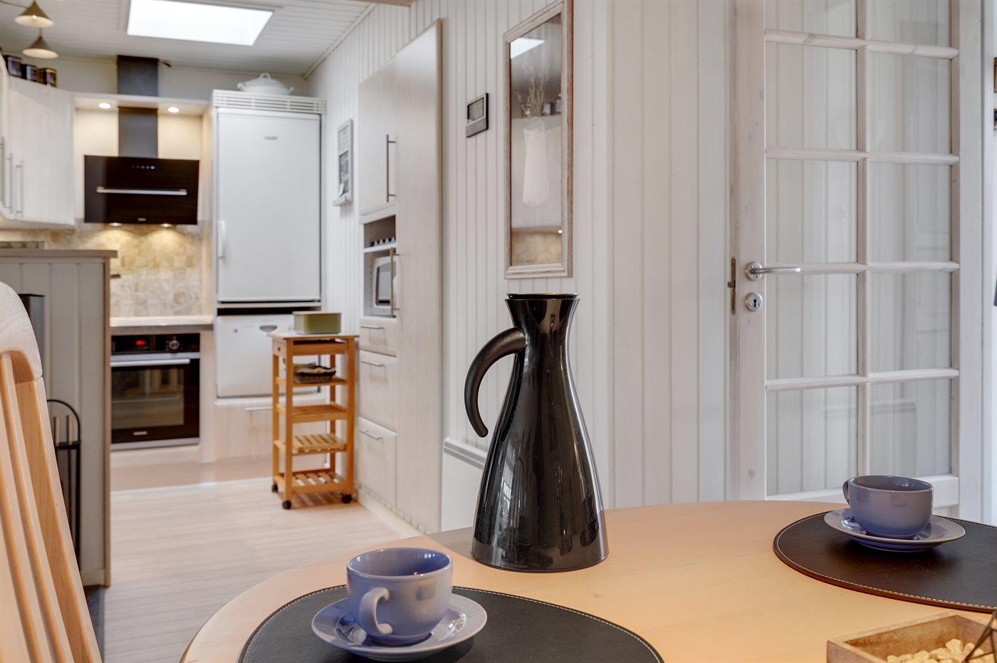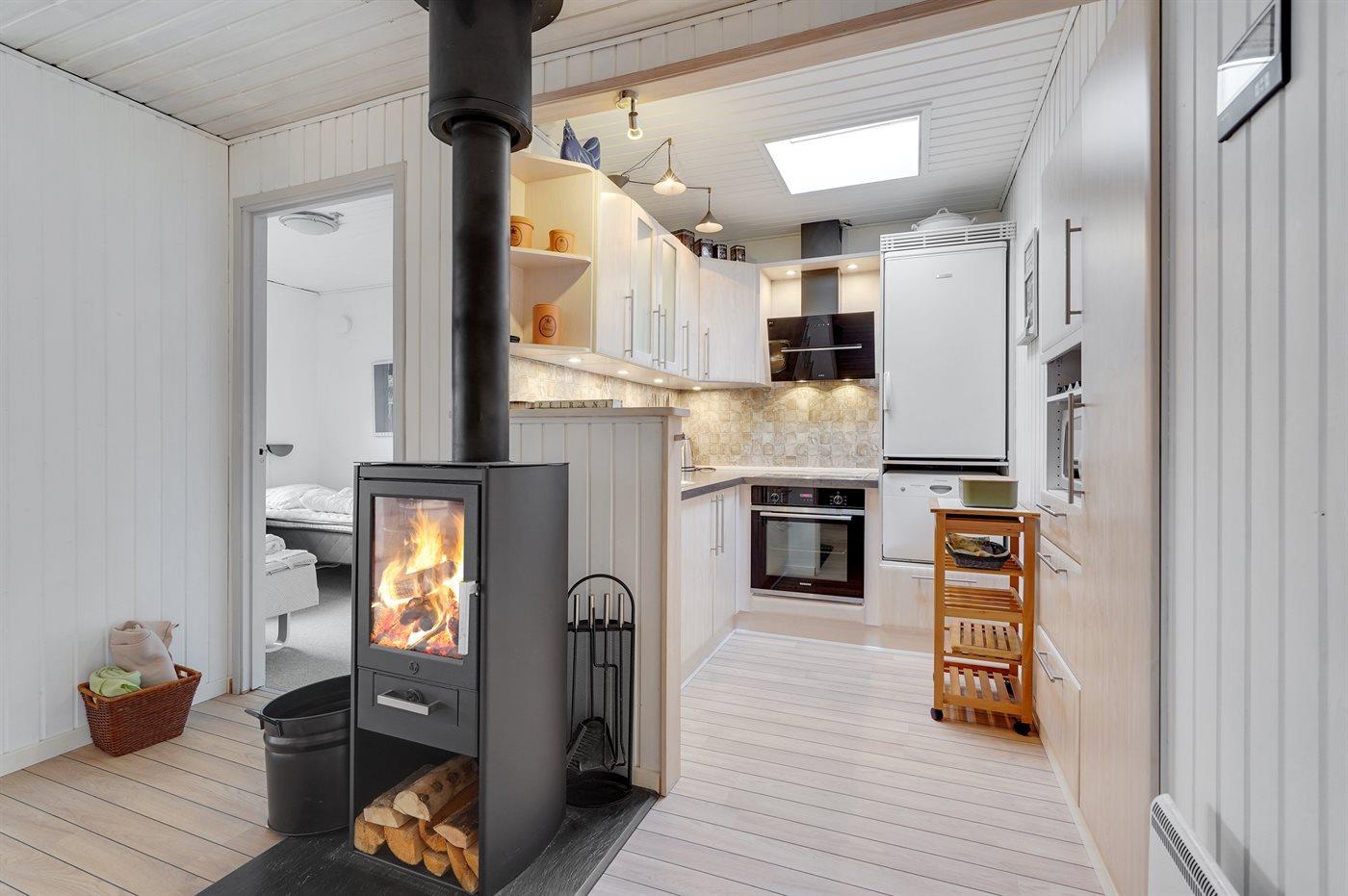 Køkkenet er udstyret med 1 køleskab. Der er 4 elkogeplader, bageovn, mikrobølgeovn samt opvaskemaskine.