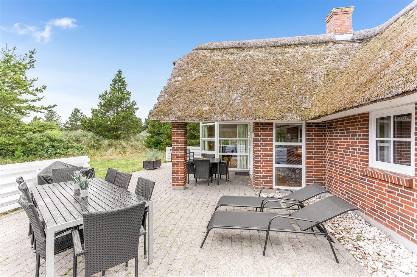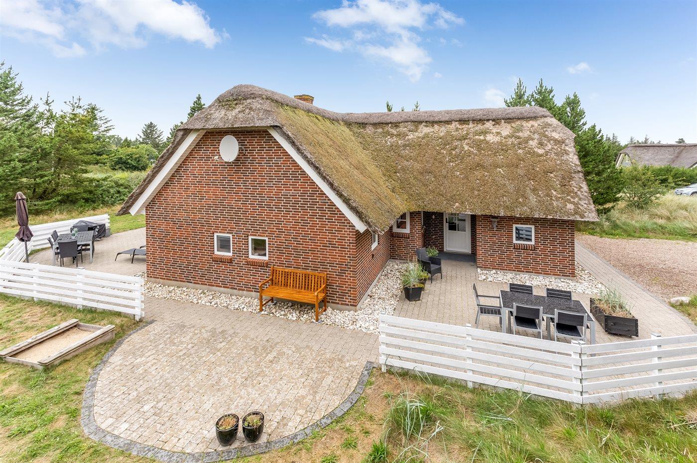 Rummeligt stråtækt sommerhus i Blåvand med spa, sauna og stor naturgrund.