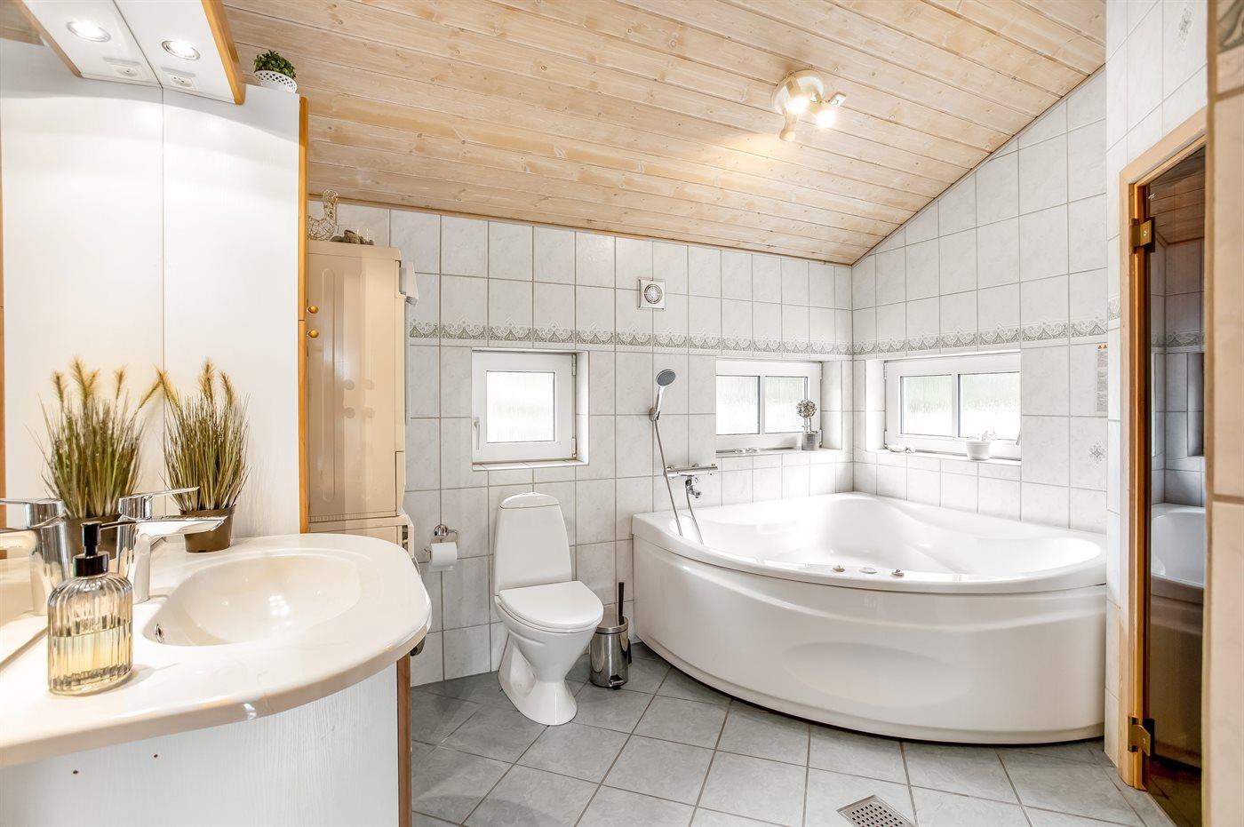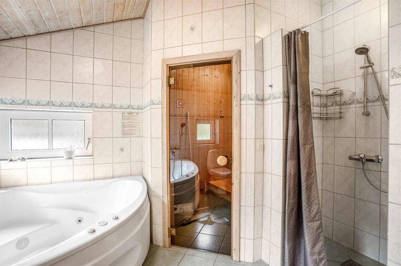 Der er 1 badeværelse med bruseniche og 2 toiletter, heraf 1 gæstetoilet. Der er gulvvarme på 1 badeværelse. I saunaen er der mulighed for afslapning.