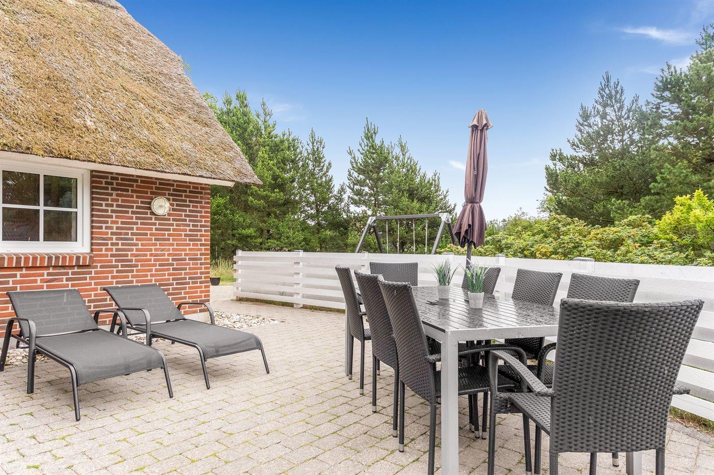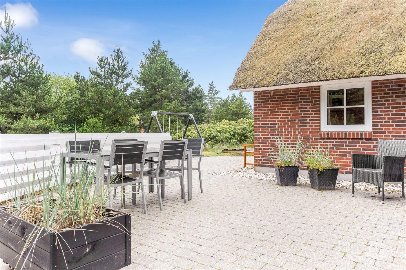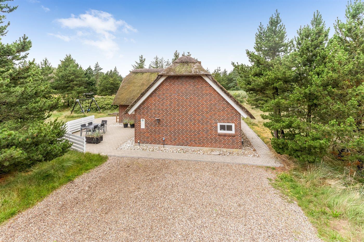 Ferieboligen er beliggende på en 2400 m² stor naturgrund. Der er 2200 m til havet. Nærmeste forretning er beliggende i en afstand af 2000 m. Til ferieboligen hører 50 m² terrasseareal. Desuden er der 10 m² overdækket terrasse. Der er redskabsrum. Gynge. Sandkasse. Grill til rådighed. Der er installeret stik til opladning af elbil. Type 2 stik. Parkering ved ferieboligen.