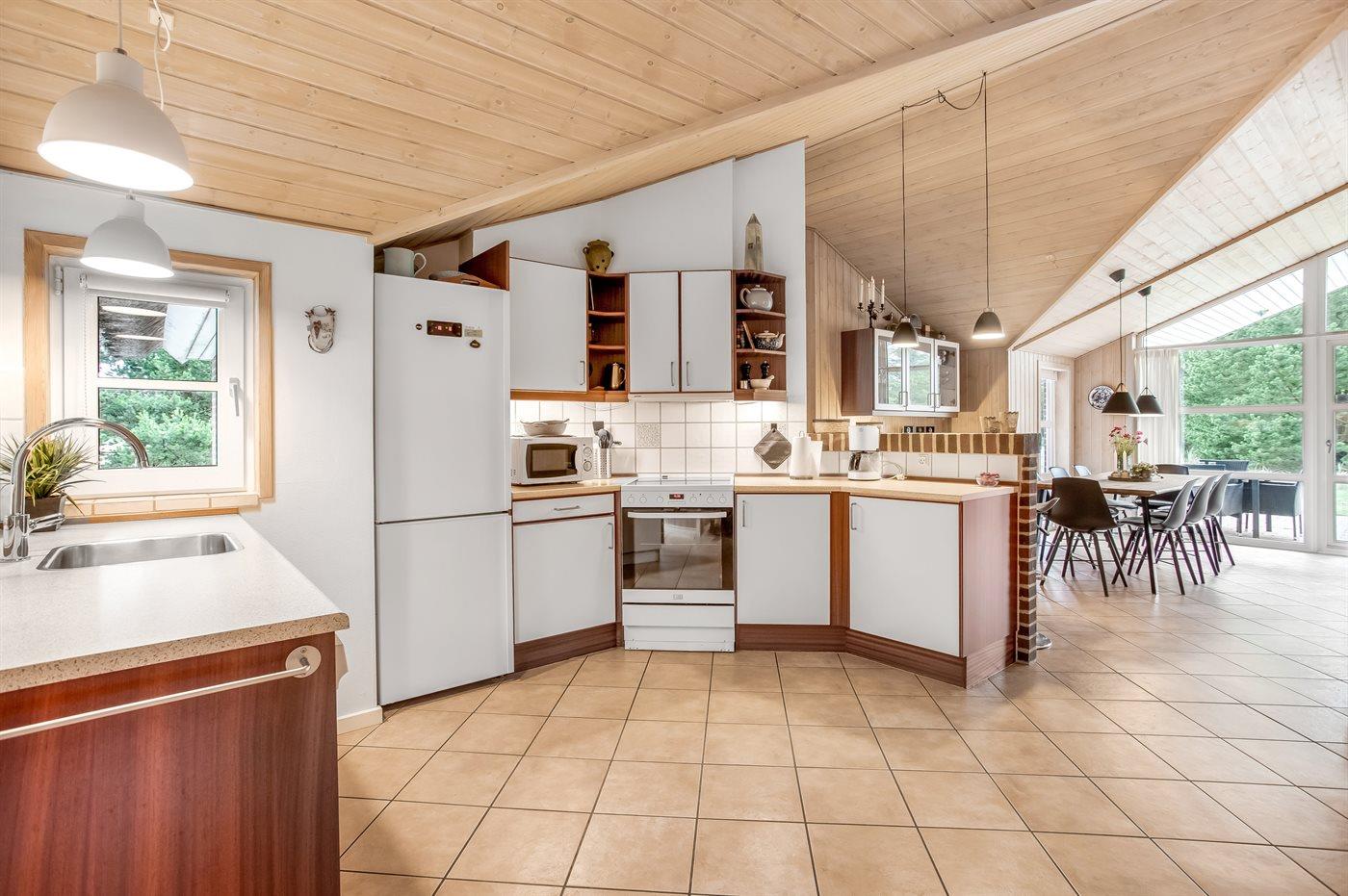 Køkkenet er udstyret med 1 køleskab. Der er 4 induktionskogeplader, varmluftovn, mikrobølgeovn samt opvaskemaskine Der er gulvvarme i køkkenet.