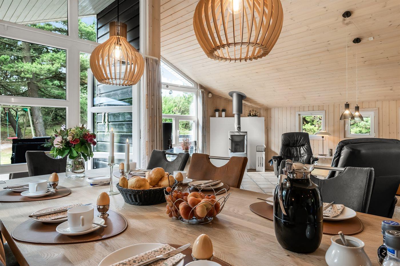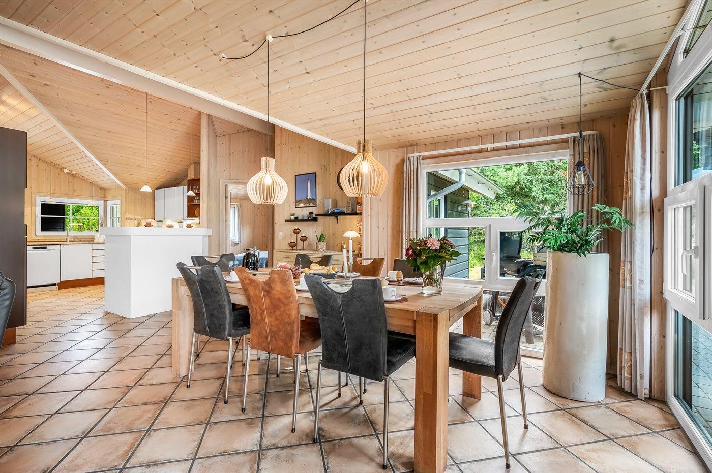 Huset er udstyret med gode skandinaviske møbler af høj kvalitet samt klinkebelagte gulve med gulvvarme. Fra den dejlige og hyggelige stue med brændeovn samt spiseplads til hele familien er der adgang til 100 m2 stor skøn terrasse med havemøbler til 8 personer og Weber gasgrill. Lækkert og veludstyret køkken som ligger i åben forbindelse med stuen. Husets 4 soveværelser er belagt med tæpper. I det ene af de 2 dejlige badeværelser er der en stor 4-pers (standvand) samt direkte adgang til sauna. Desuden gratis, trådløs internetforbindelse til rådighed (90/90 Mbit).
