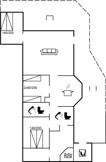 Der er i alt 3 soveværelser. Sovepladserne fordeler sig på: 4 sovepladser i dobbeltsenge. 2 sovepladser i enkeltsenge. 2 sovepladser på madrasser. 2 af disse sovepladser befinder sig på husets hems. Derudover er der 1 stk. barneseng.