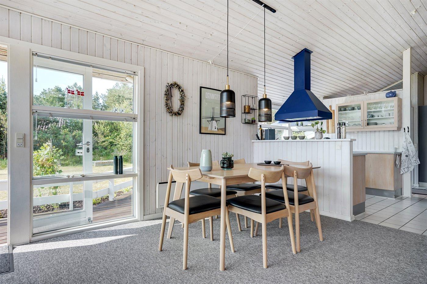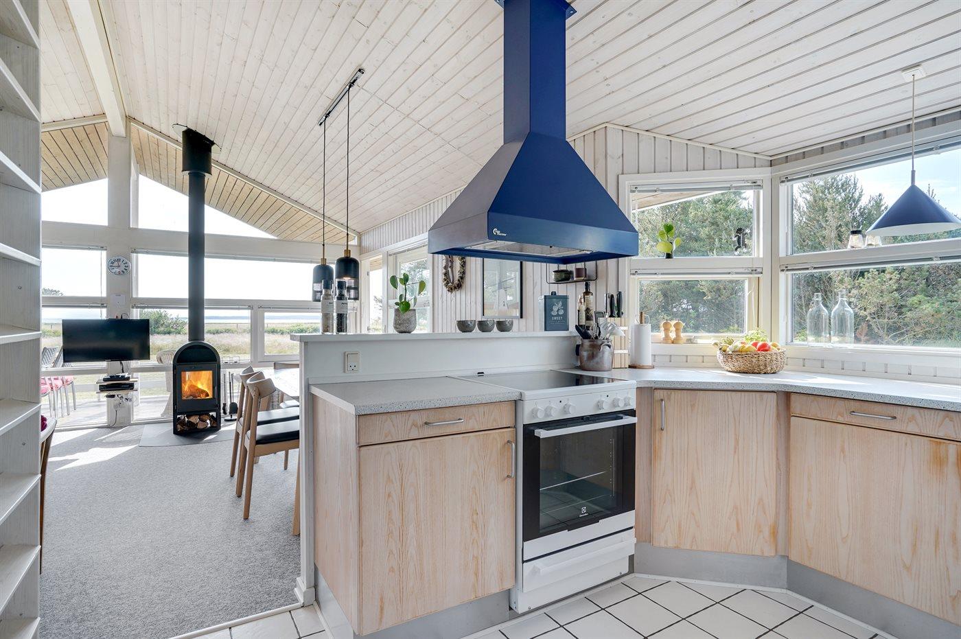 Køkkenet er udstyret med 1 køleskab. Der er 4 elkogeplader, bageovn, mikrobølgeovn samt opvaskemaskine.