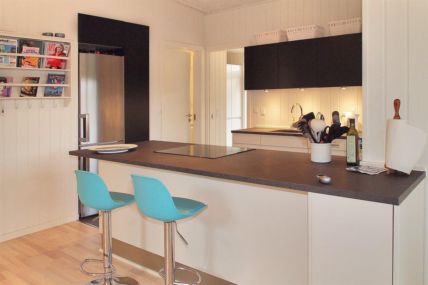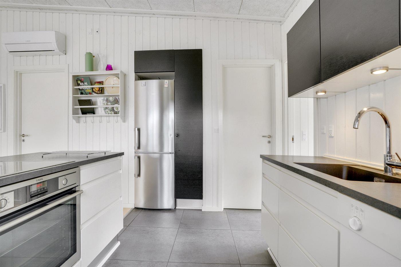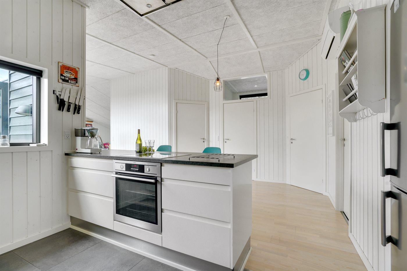 Køkkenet er udstyret med 1 køleskab. Der er 4 induktionskogeplader, varmluftovn, mikrobølgeovn samt opvaskemaskine.