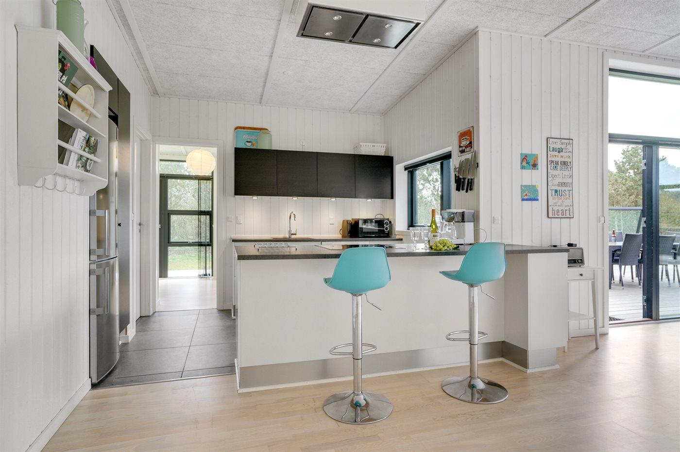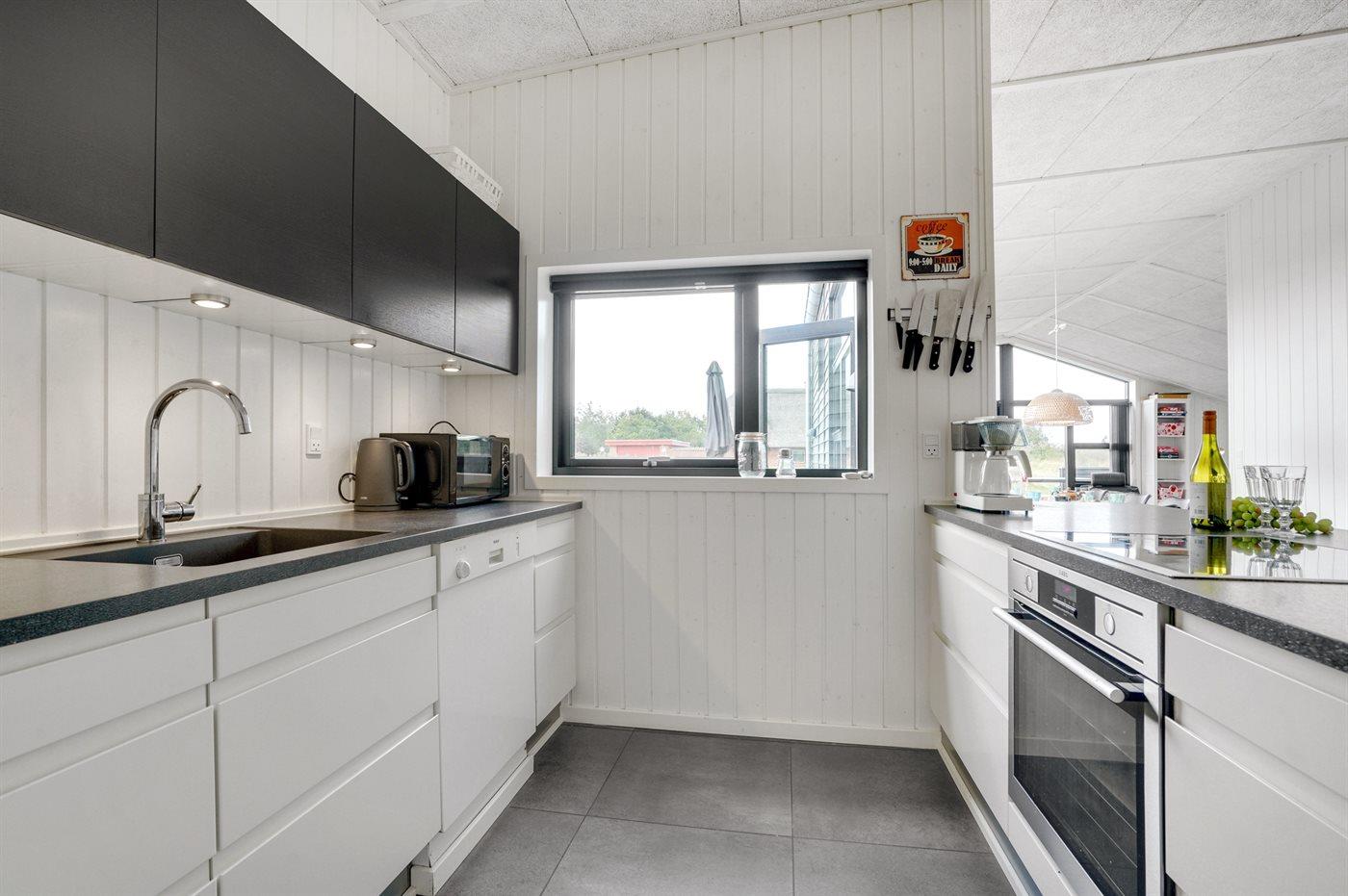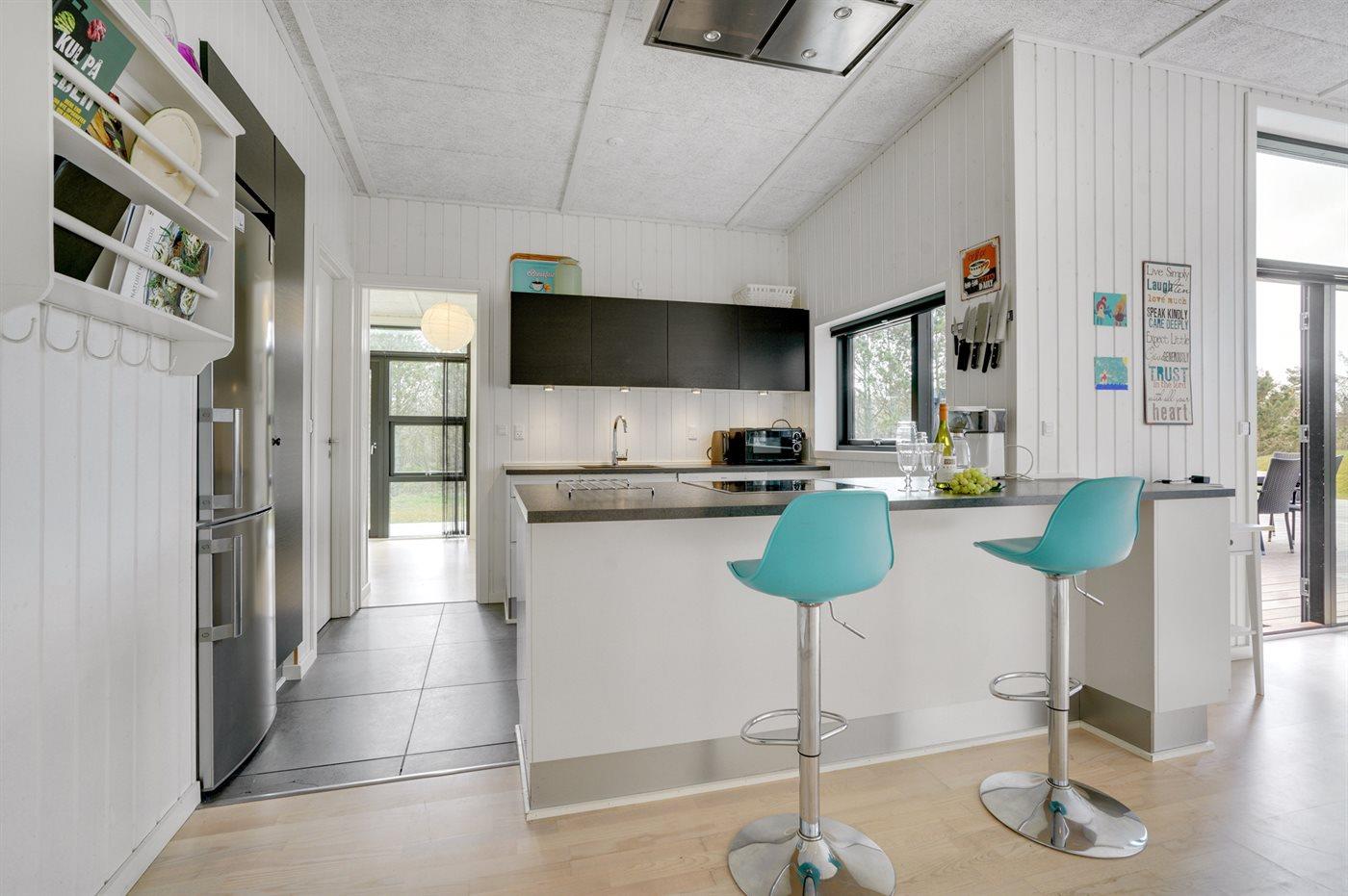 Køkkenet er udstyret med 1 køleskab. Der er 4 induktionskogeplader, varmluftovn, mikrobølgeovn samt opvaskemaskine.