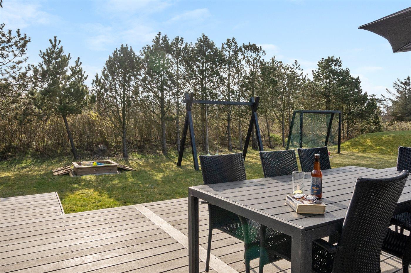 Ferieboligen er beliggende på en 2100 m² stor naturgrund. Der er 200 m til havet. Nærmeste forretning er beliggende i en afstand af 300 m. Til ferieboligen hører 100 m² terrasseareal. Gynge. Sandkasse. Fodboldmål. Udendørs bruser. Parkering ved ferieboligen.