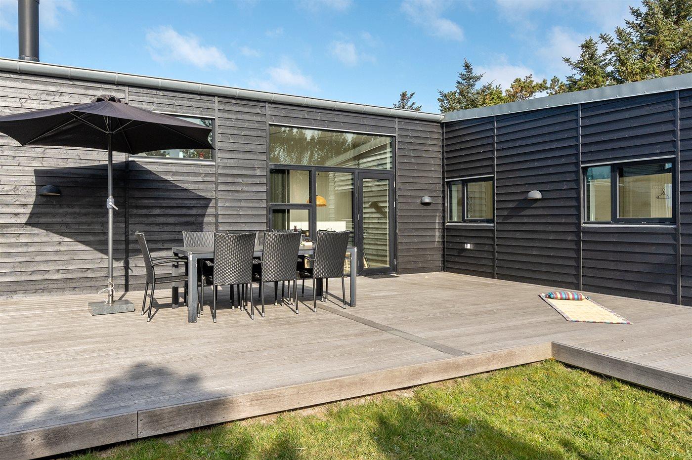 Hyggeligt sommerhus tæt på Blåvands sandstrand med stor terrasse og mange faciliteter.