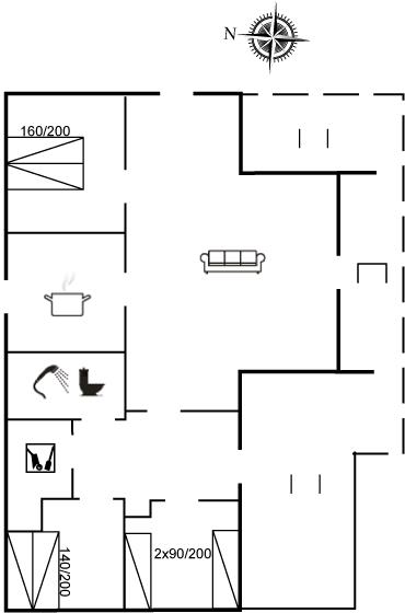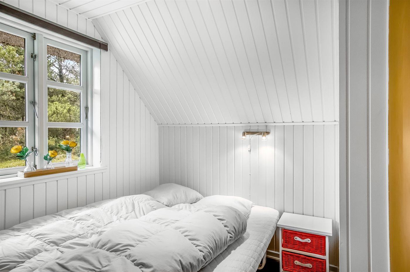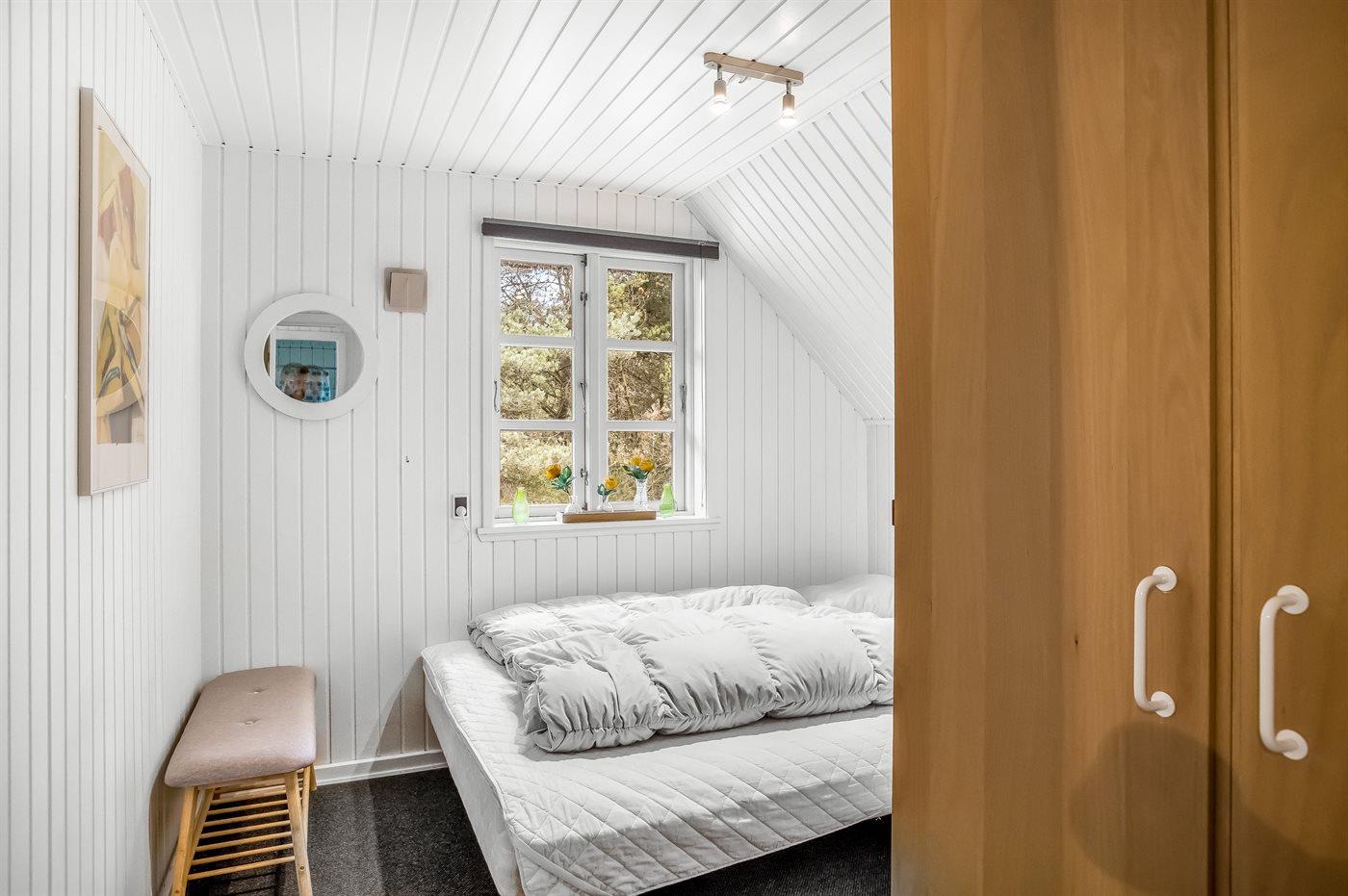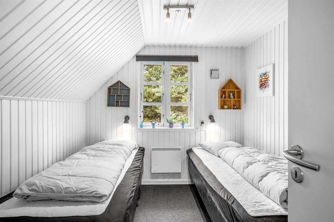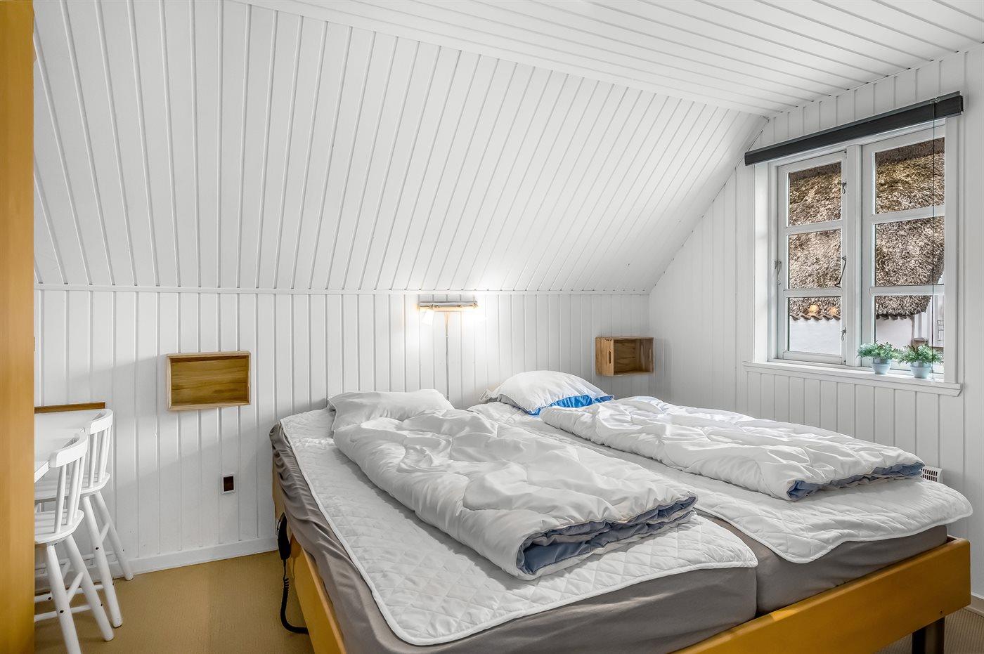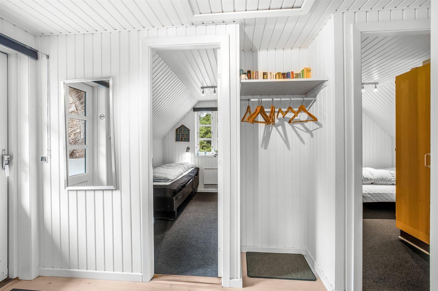 Der er i alt 3 soveværelser. Sovepladserne fordeler sig på: 4 sovepladser i dobbeltsenge. 2 sovepladser i enkeltsenge. Derudover er der 1 stk. barneseng.