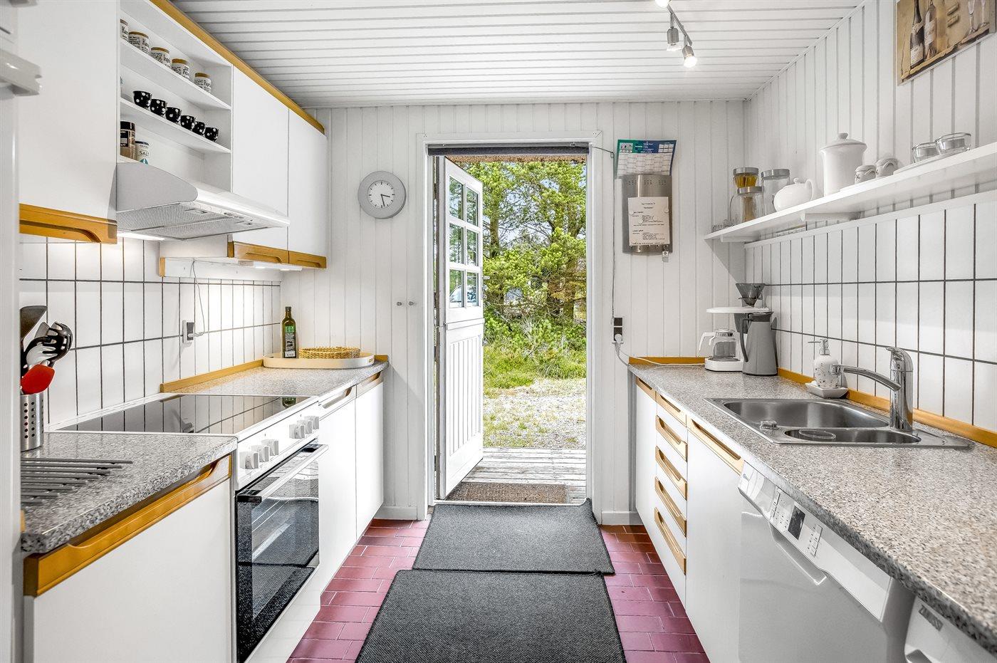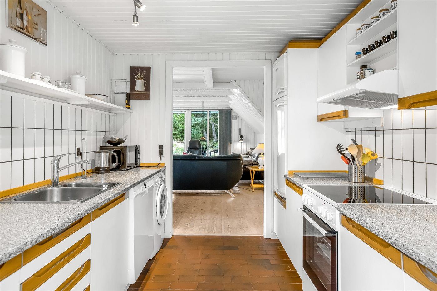 Køkkenet er udstyret med 1 køleskab. Der er 4 keramiske kogeplader, varmluftovn, mikrobølgeovn samt opvaskemaskine.