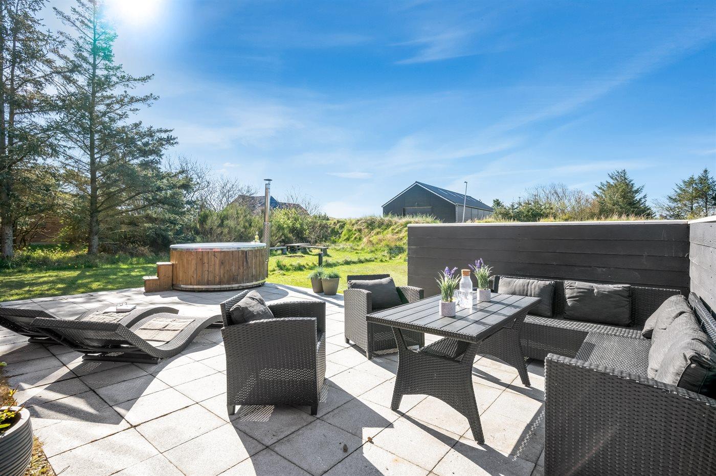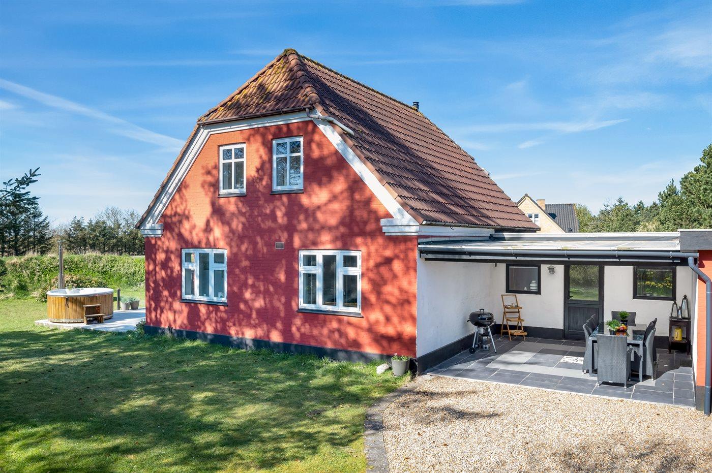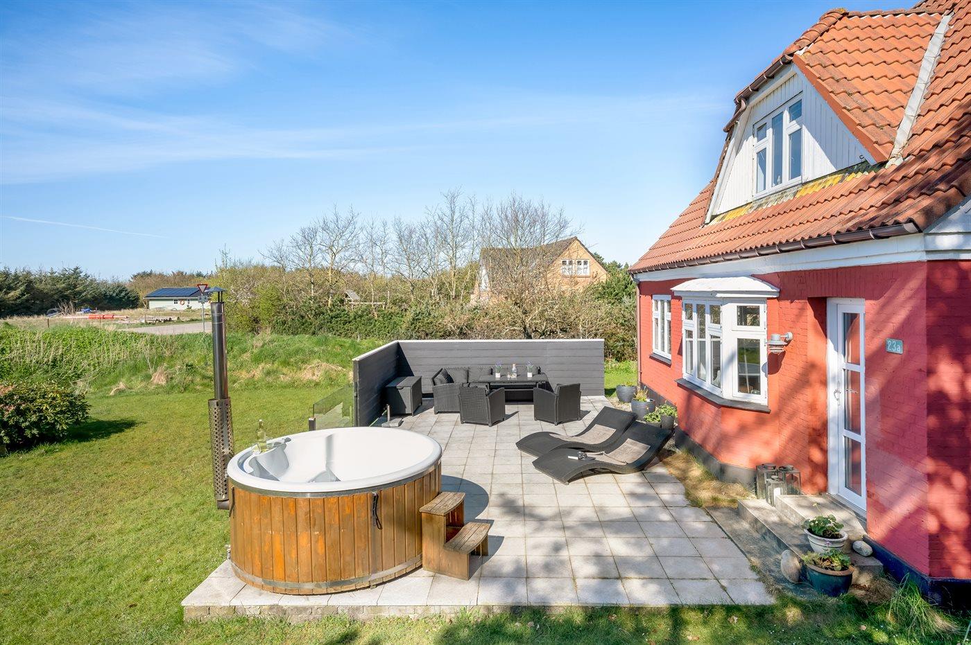 Hyggeligt sommerhus i Blåvand med vildmarksbad og stor terrasse nær strand og natur.