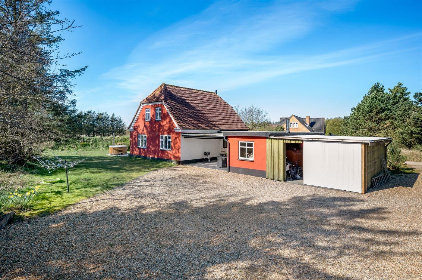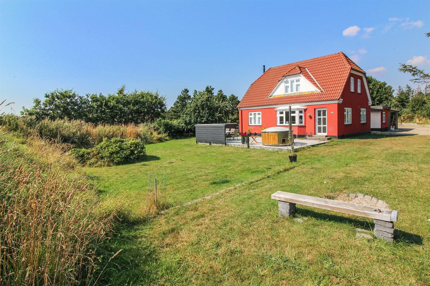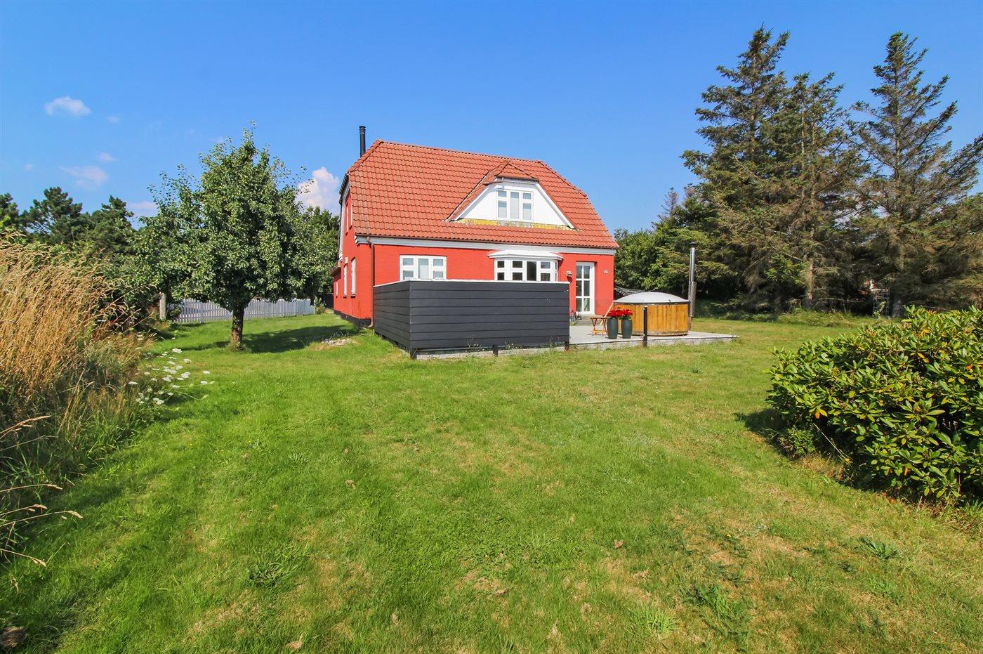 Hyggeligt sommerhus i Blåvand med vildmarksbad og stor terrasse nær strand og natur.