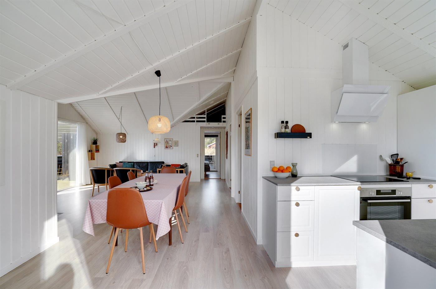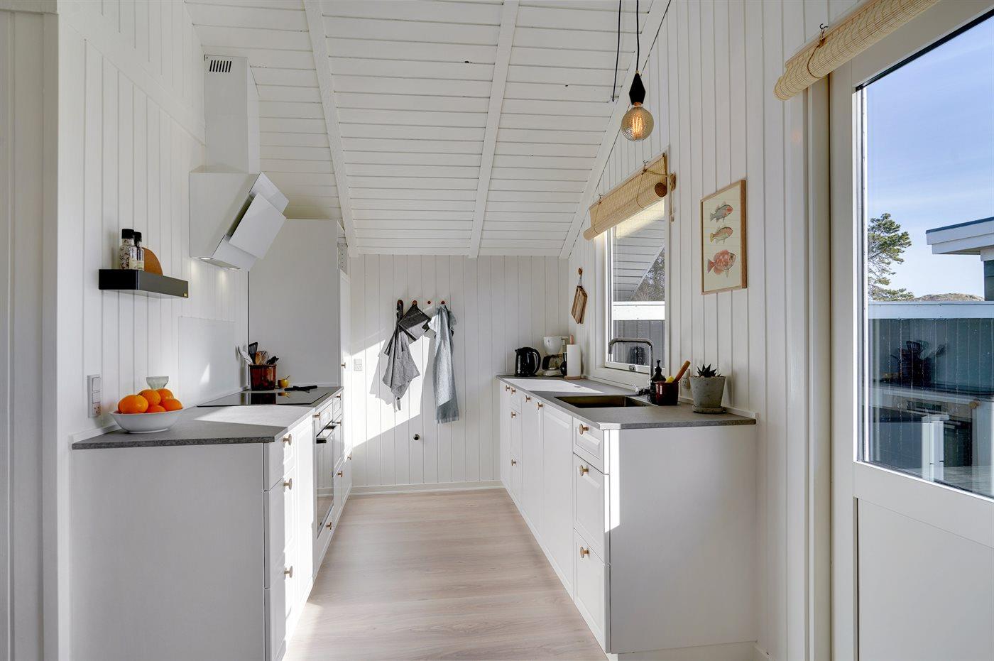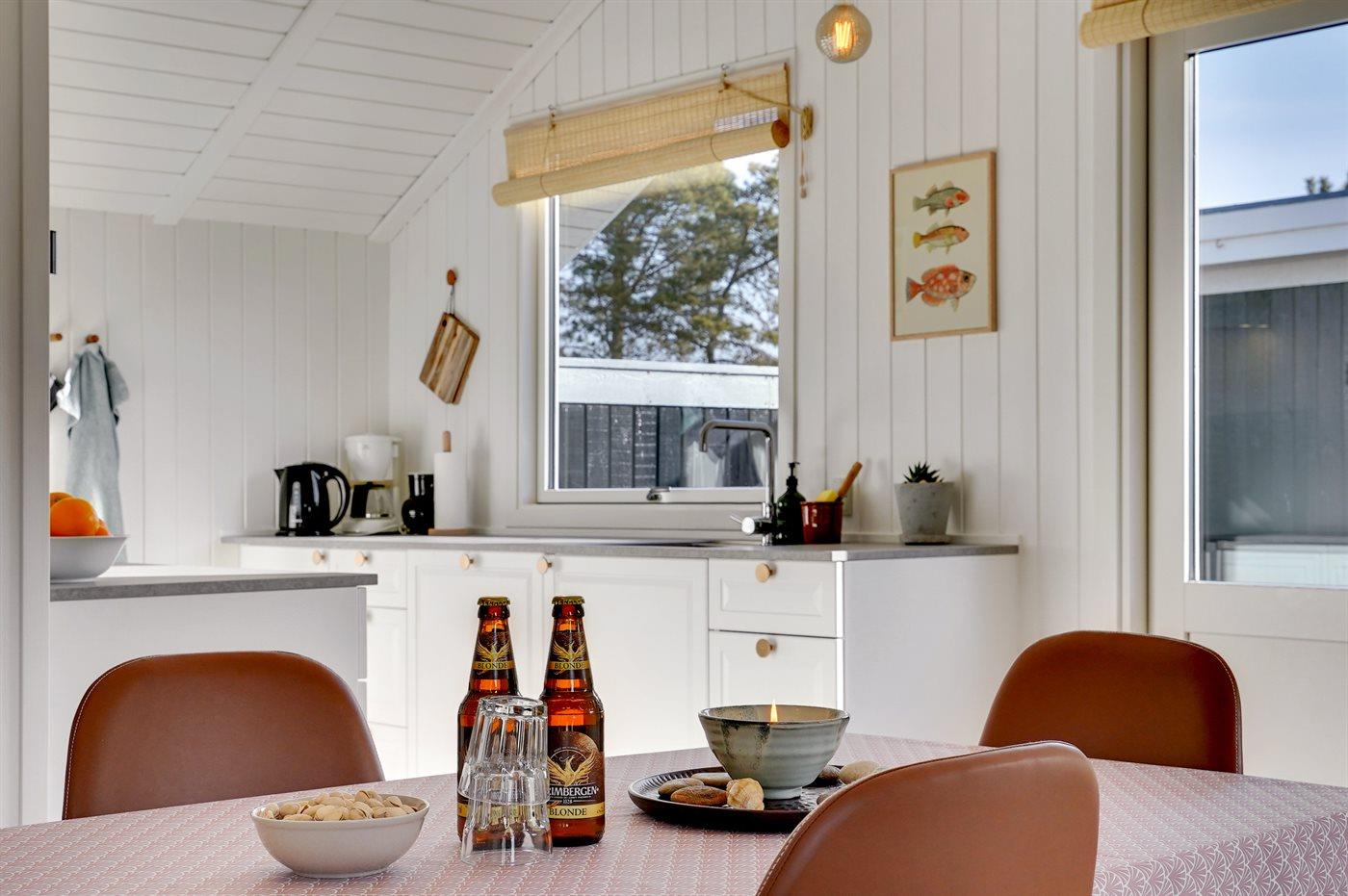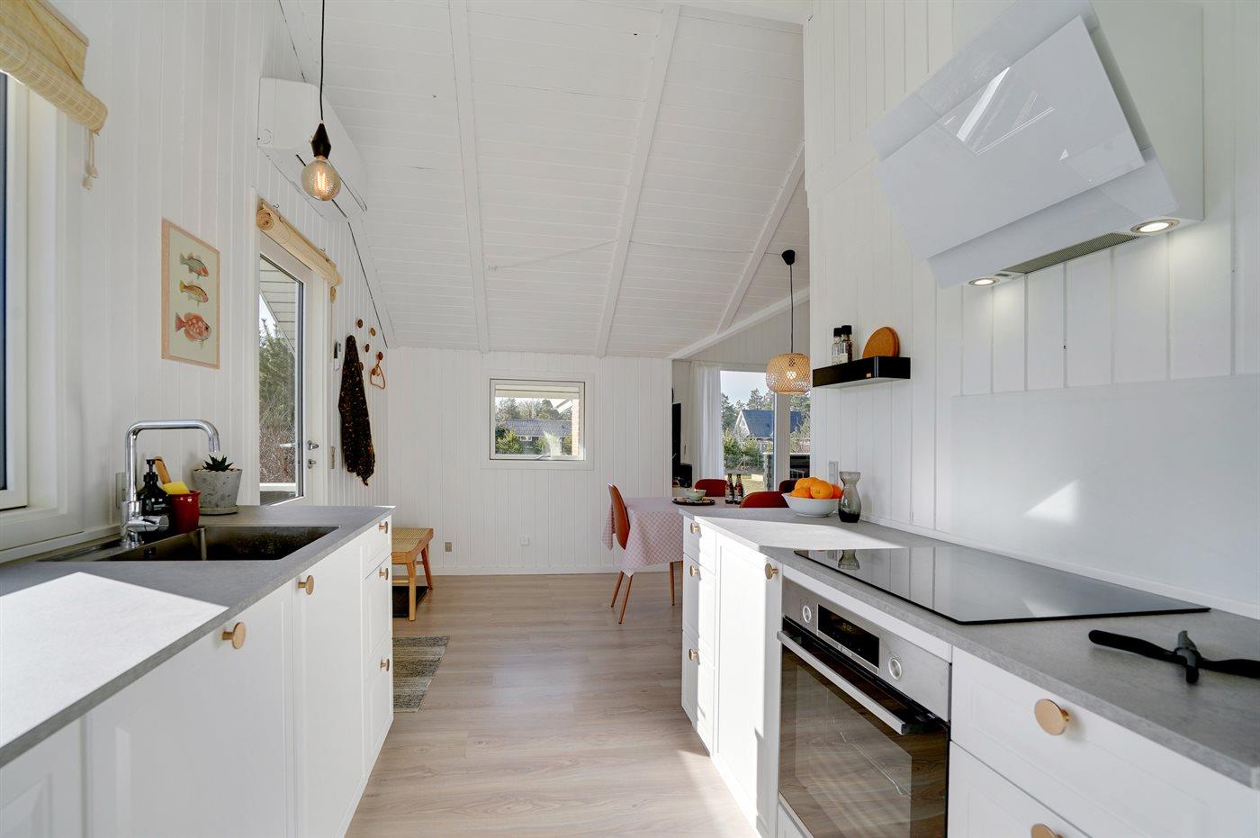 Køkkenet er udstyret med 1 køleskab. Der er 4 induktionskogeplader, varmluftovn, mikrobølgeovn samt opvaskemaskine.
