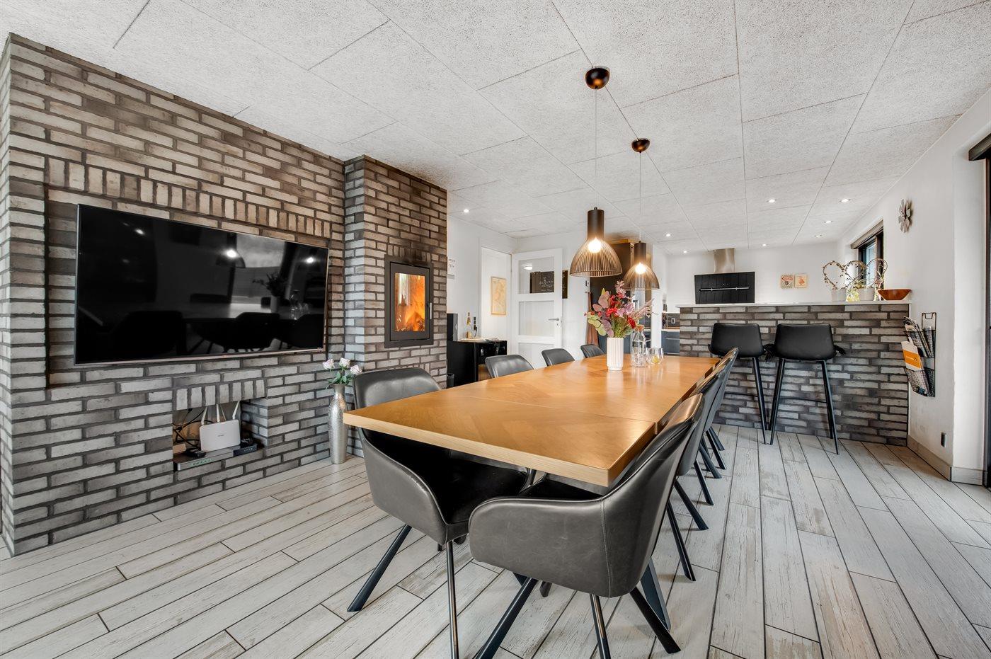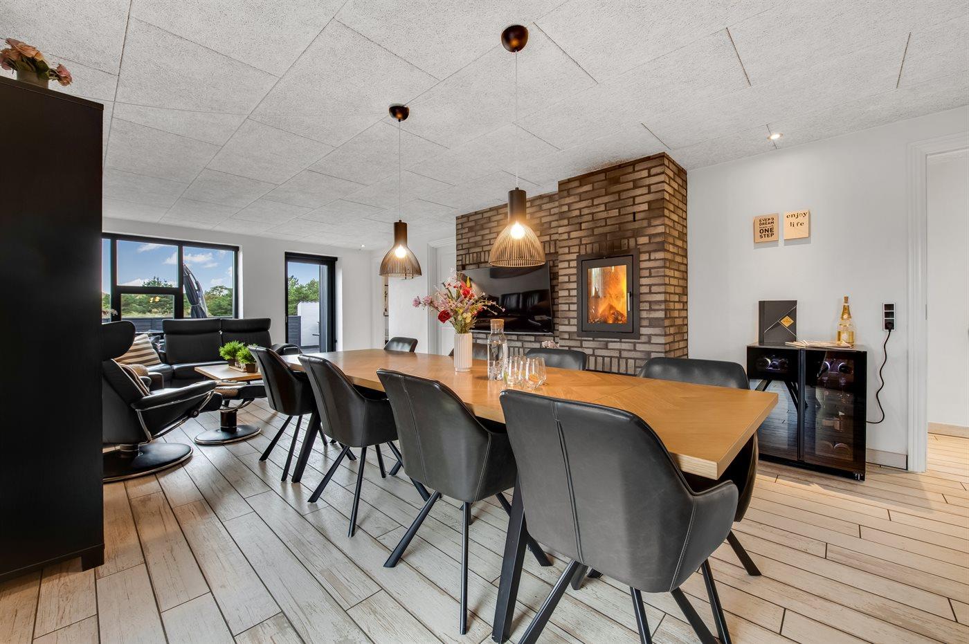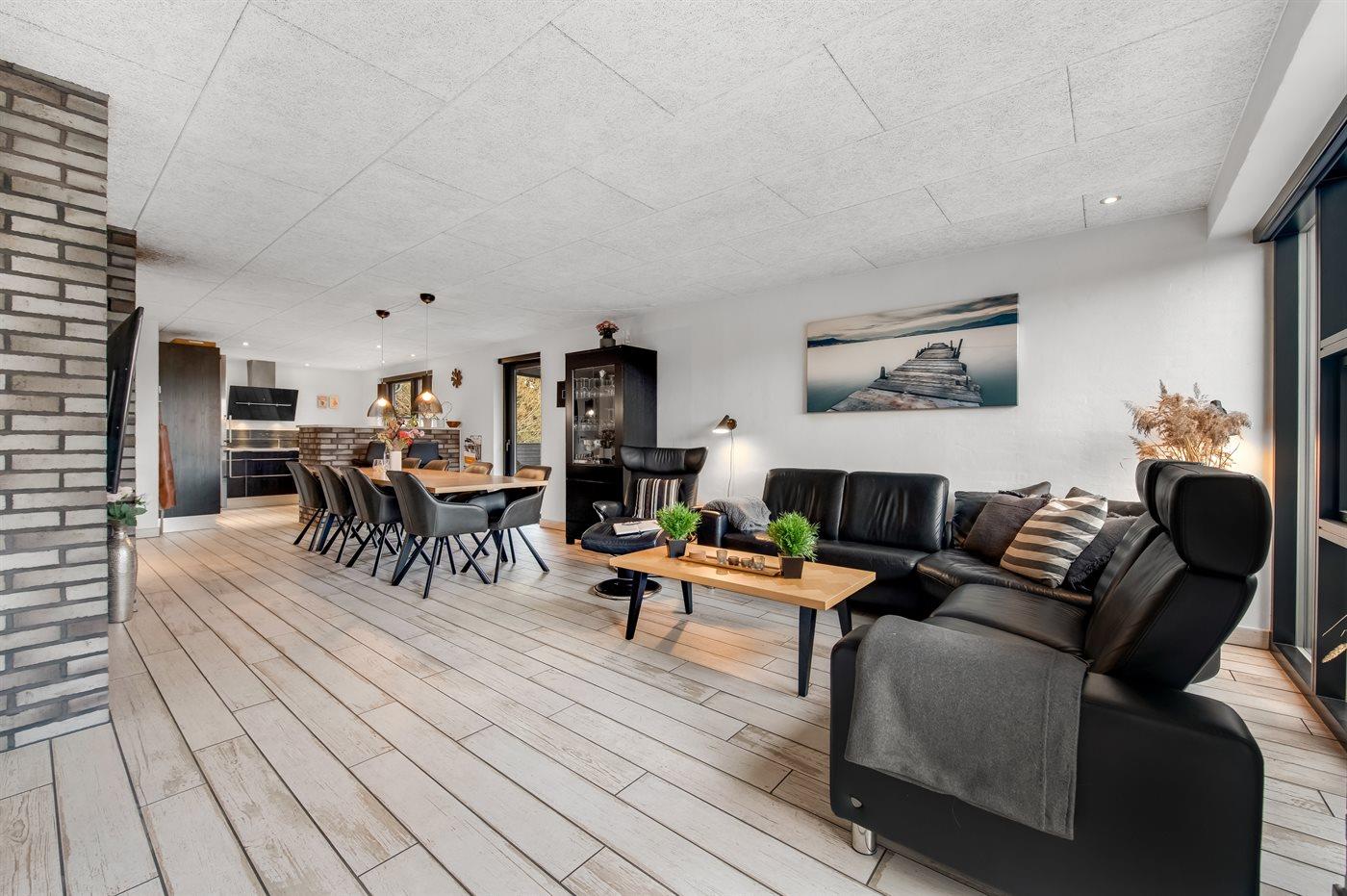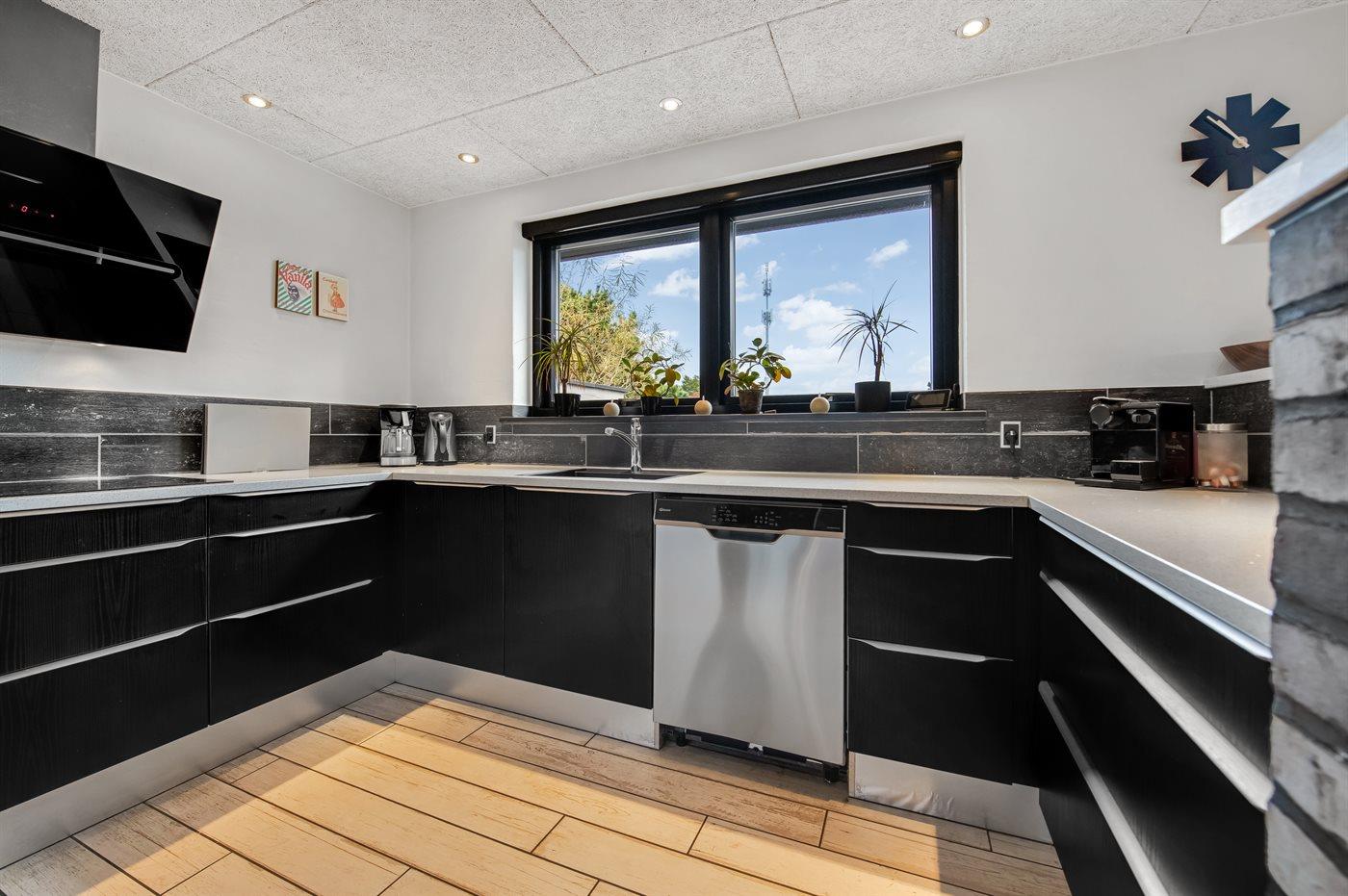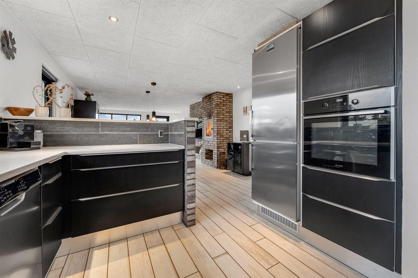 Køkkenet er udstyret med 1 køleskab, og der er 2 ekstra køleskabe i skuret. Der er 4 induktionskogeplader, varmluftovn, mikrobølgeovn samt opvaskemaskine.