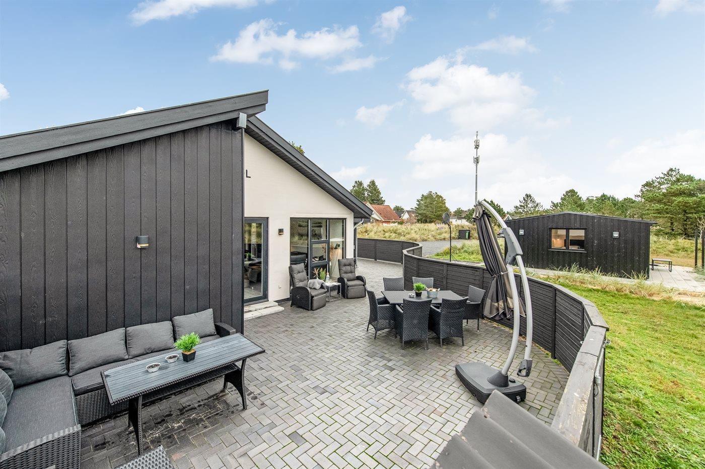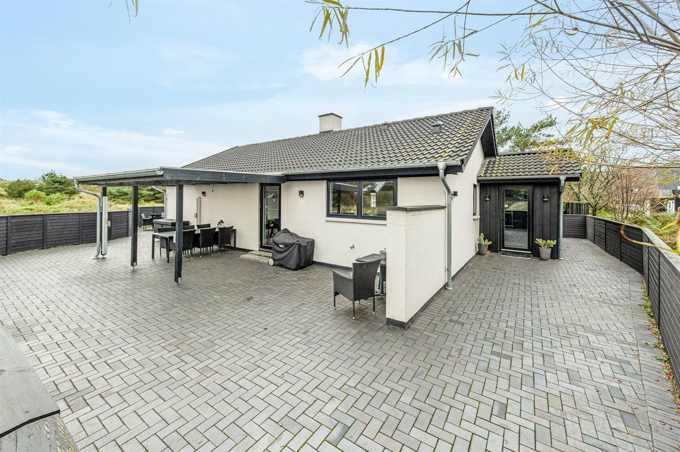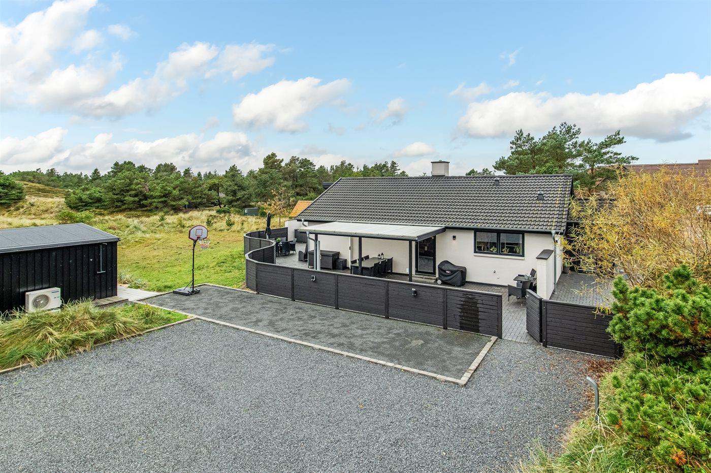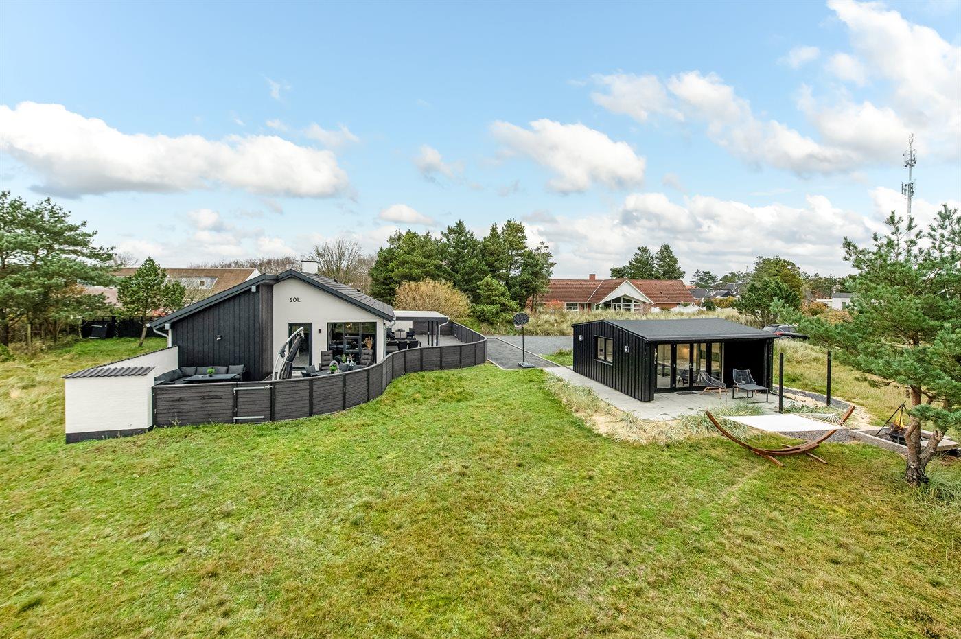 Dette flotte luksussommerhus ligger på en dejlig stor naturgrund, hvor der er plads til boldspil og leg. Fra grunden og huset er der endvidere udsigt til det flotte naturområde. Huset ligger kun 1100 m fra en af Danmarks bedste sandstrande og tæt på Blåvand by - det fås ikke bedre. I det tilhørende anneks befinder 2 af sovepladserne og gæstetoilettet sig. Der findes et stort parkeringsareal til biler.