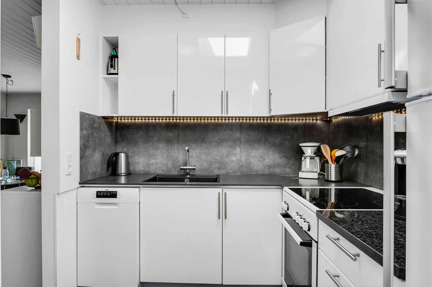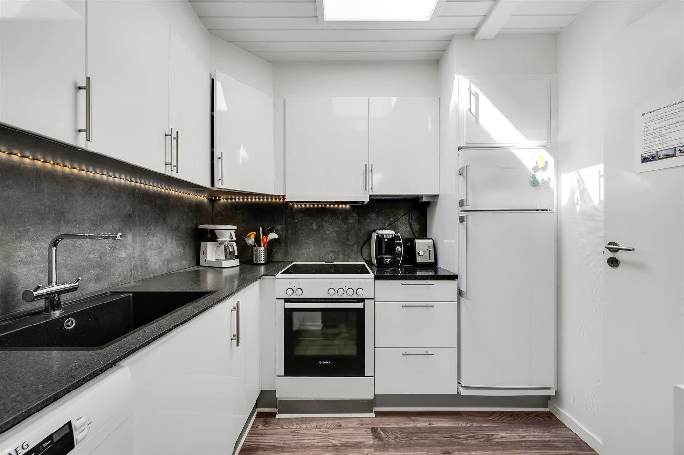 Køkkenet er udstyret med 1 køleskab. Der er 4 keramiske kogeplader, varmluftovn, mikrobølgeovn samt opvaskemaskine.