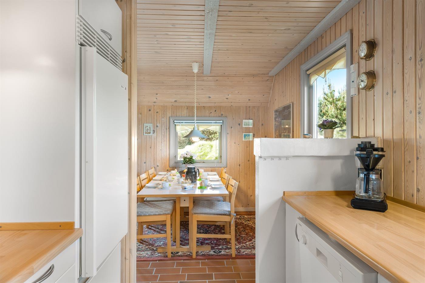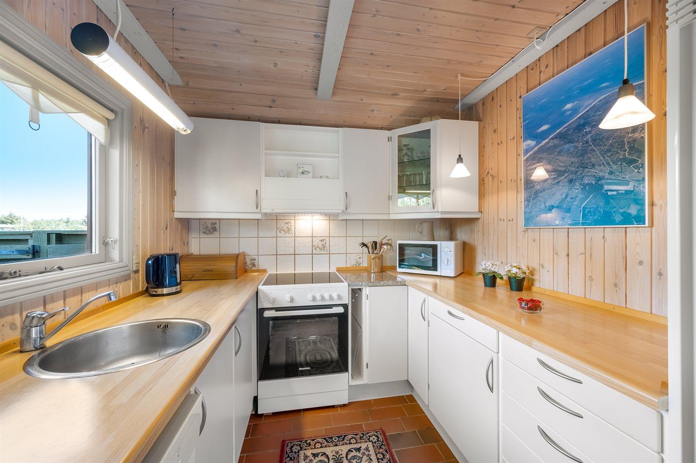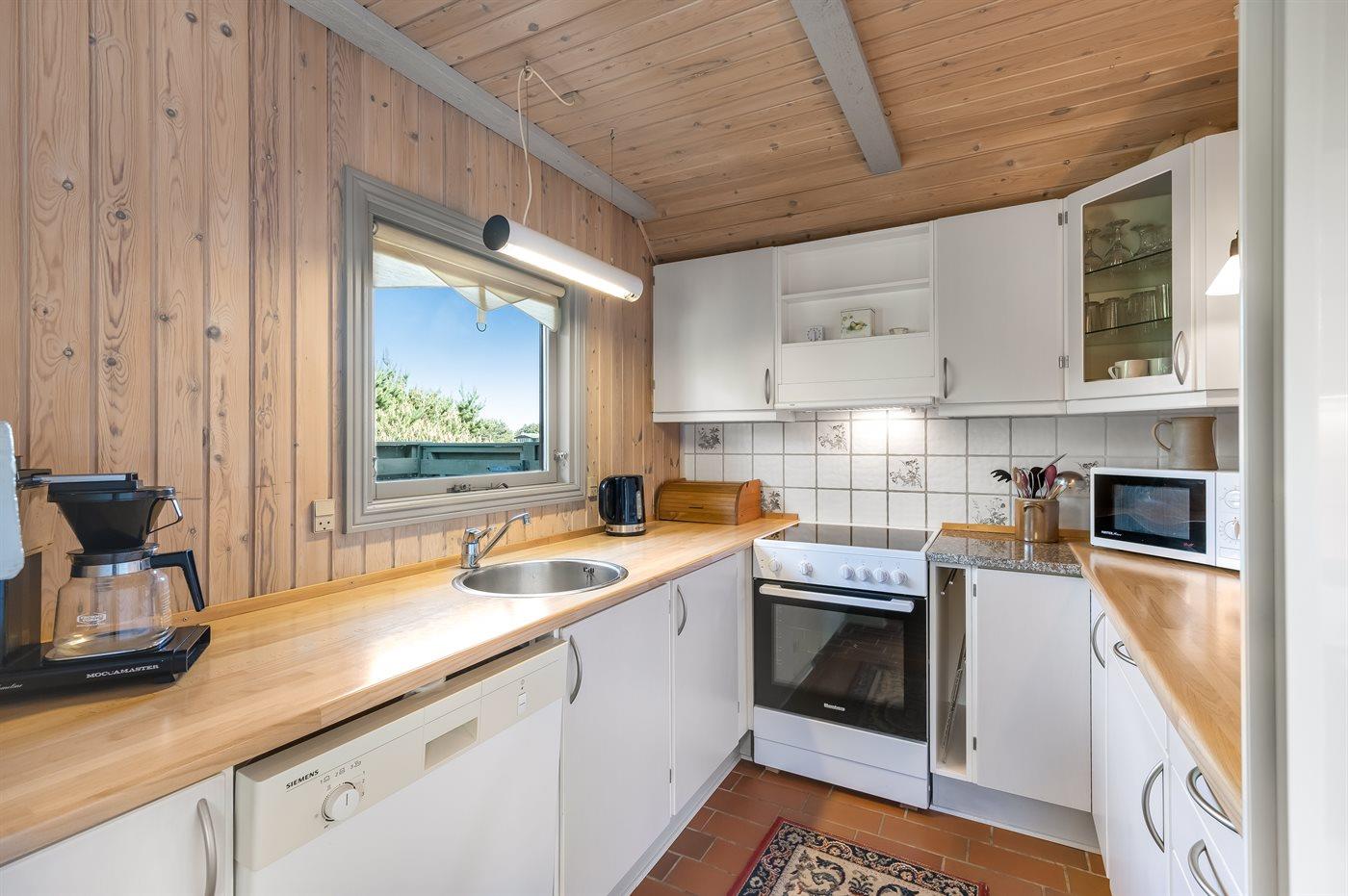 Køkkenet er udstyret med 1 køleskab. Der er 4 keramiske kogeplader, varmluftovn, mikrobølgeovn samt opvaskemaskine.