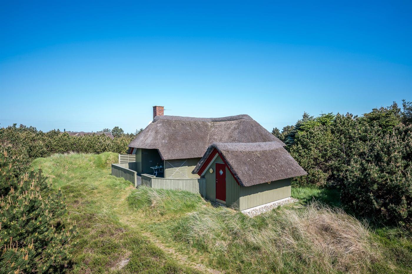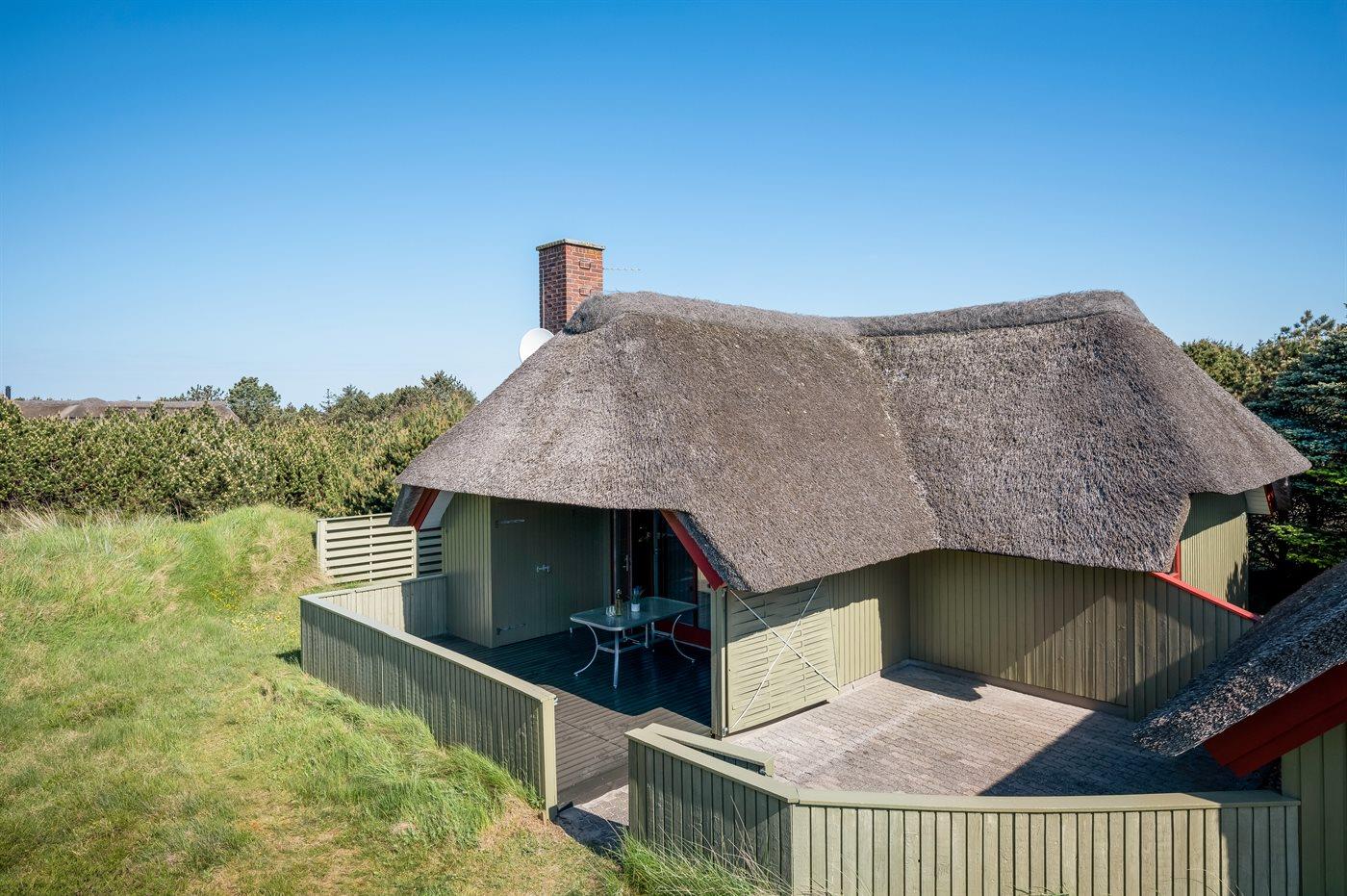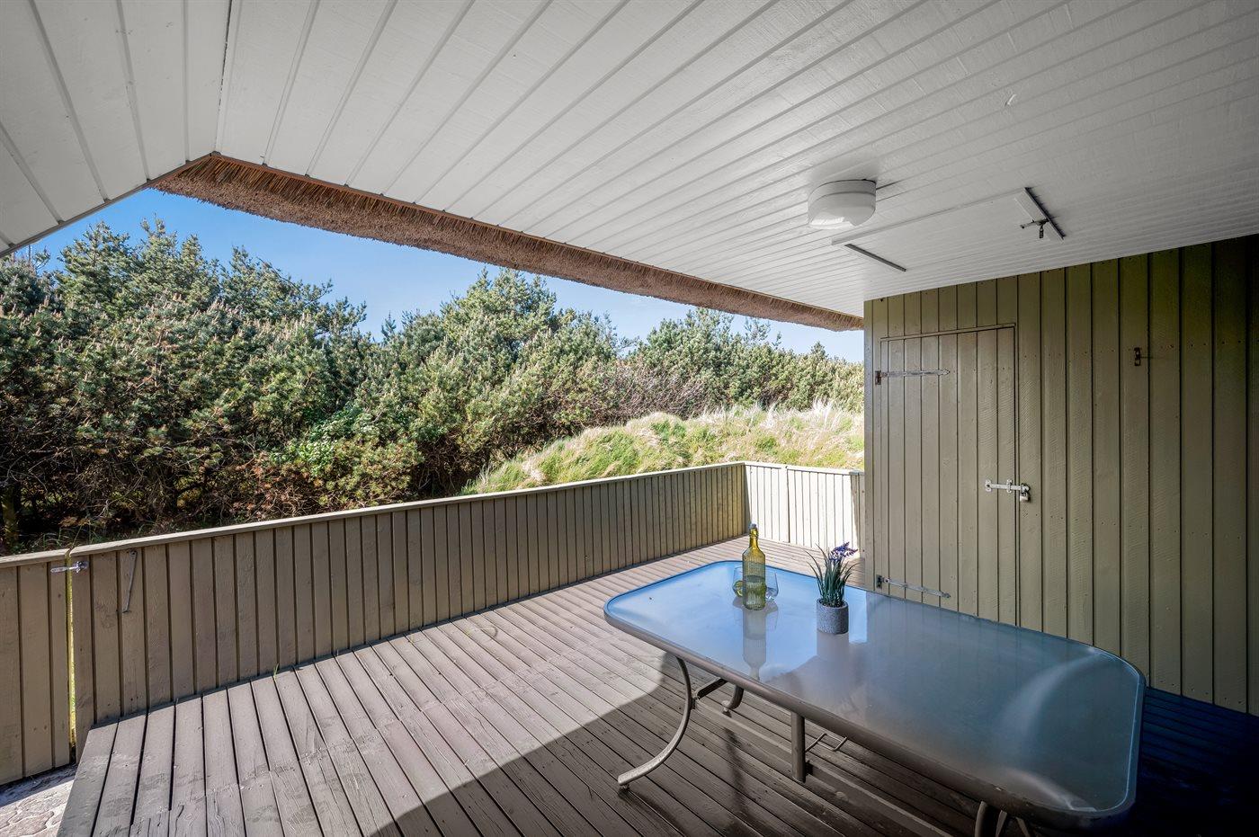 Rummeligt sommerhus i Blåvand med overdækket terrasse, sauna og naturgrund tæt på havet.